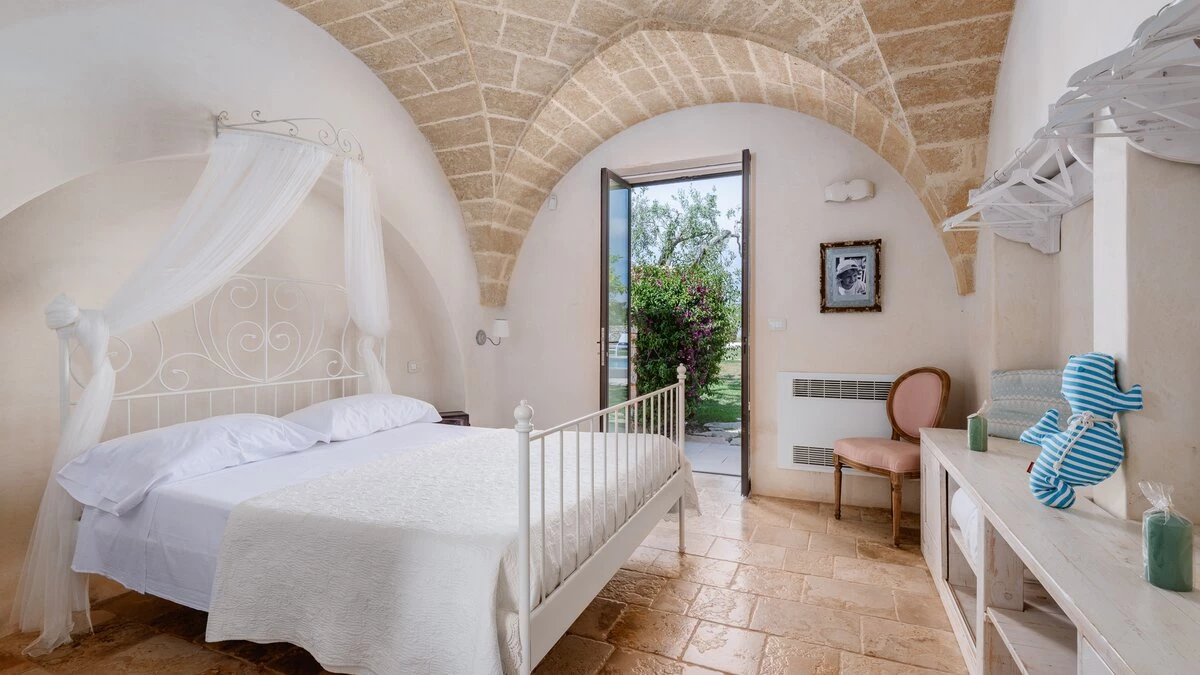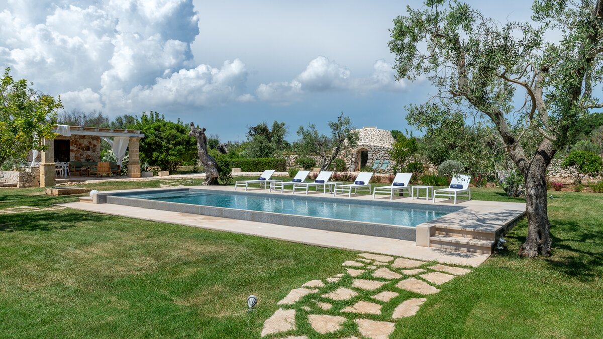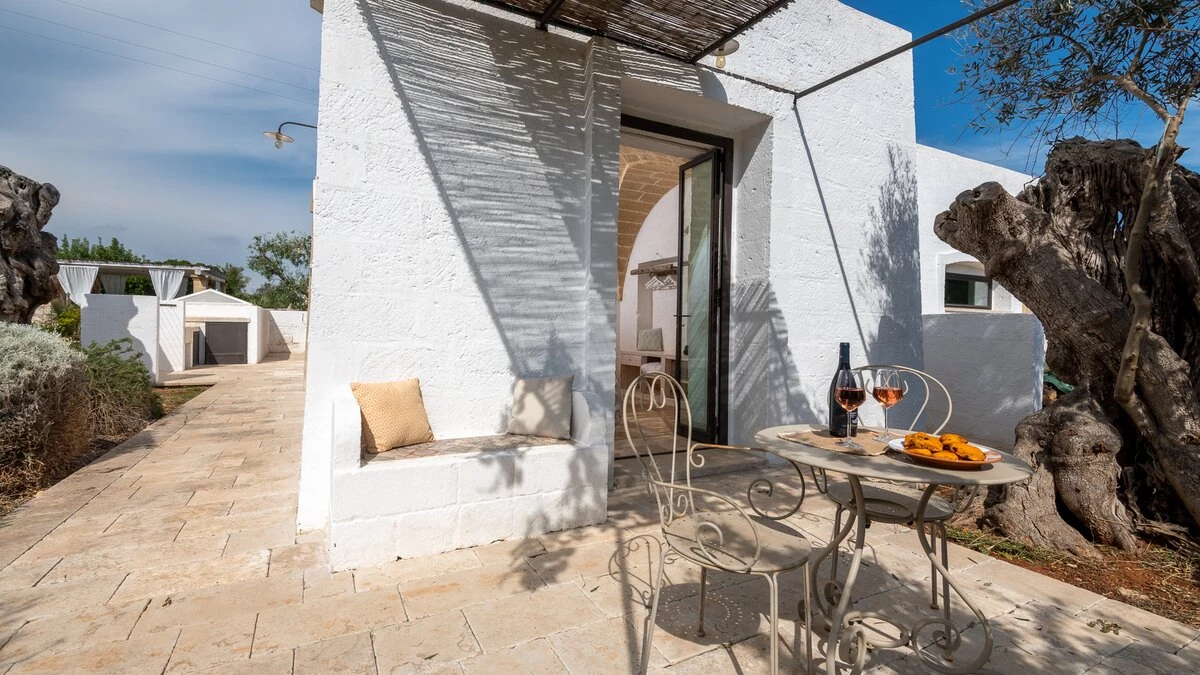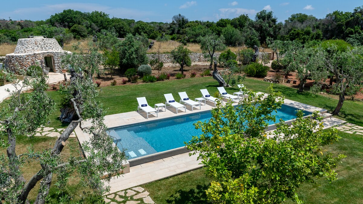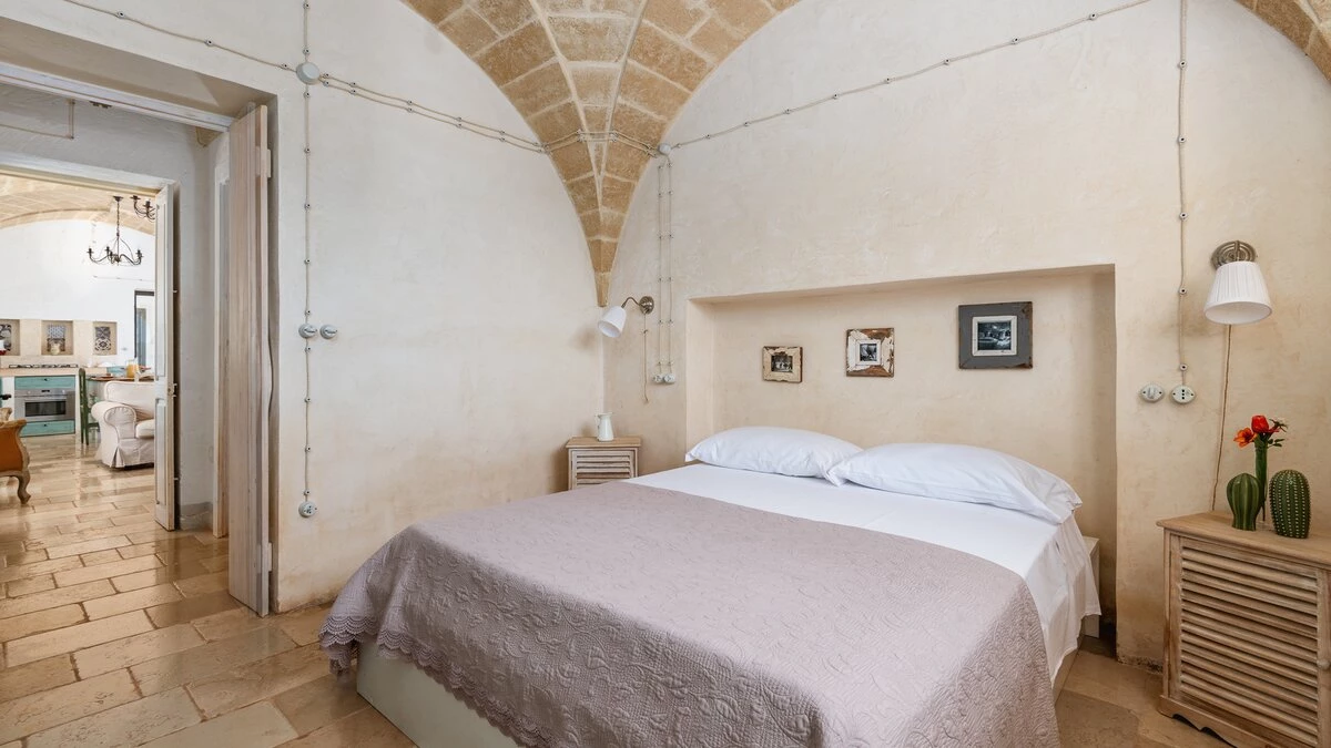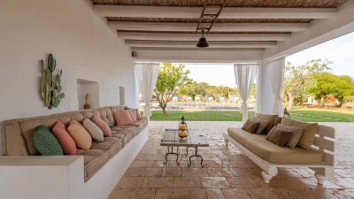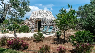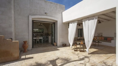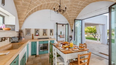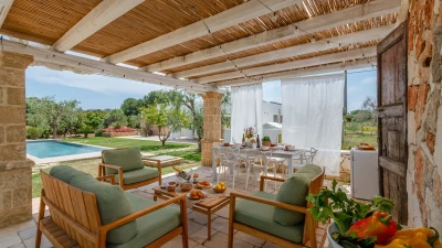 Encircled by extensive gardens and olive groves, Masseria del Faro is the perfect destination for a rural retreat for families and groups of friends alike. With crisp whites, exposed brickwork, and an uncluttered style, this newly restored villa combines traditional Puglian stone-built architecture with rustic-chic interior décor and the comfort of modern facilities. Designed for outdoor living, the covered terrace, with a furnished lounge area and an al fresco dining table next to the barbecue, has direct access to two bedrooms in one section and the open-plan kitchen, dining and seating area, and a further bedroom in the Main House accessed from the opposite side of the connecting covered terrace. Both parts of the villa have traditional tiled floors and exposed stone vaulted ceilings throughout. All three bedrooms have shower rooms en suite, king size double beds, and two of the three bedrooms open to the gardens. Two stone paths leading to the private pool where a pergola with dining area, soft seating and barbecue has been recently added. Recent improvements also include the restoration of the characteristic trullo with small double bed, suitable for young adults. The historic town of Morciano di Leuca and the seaside town of Torre Vado, with magnificent sandy beaches known as the 'Maldives of Salento' with clear, gently sloping beaches with crystalline waters and lively beach clubs with bars and restaurants are a very short drive away from Masseria del Faro. Further inexpensive restaurants are in and around picturesque local villages. Day trips and yacht and boat trips can also be organised to explore the beautiful coastline and sea grottoes.