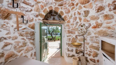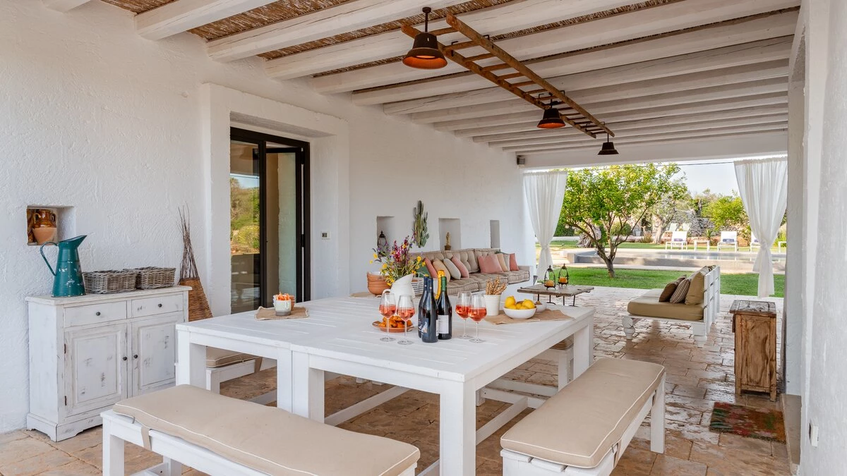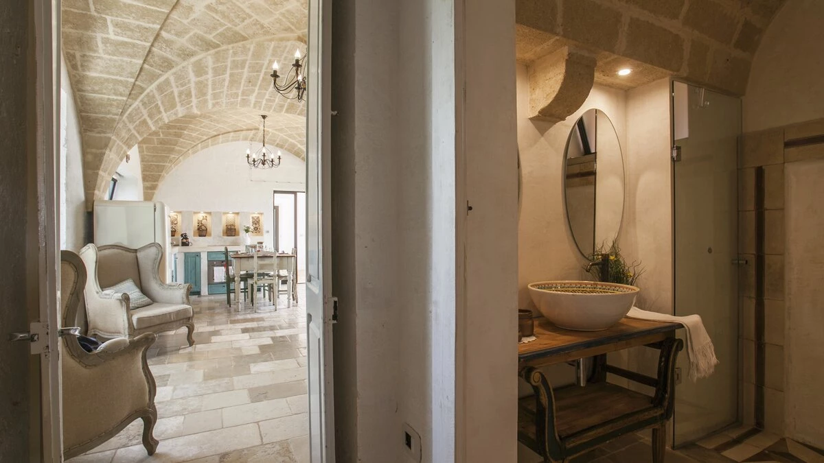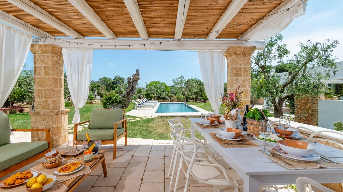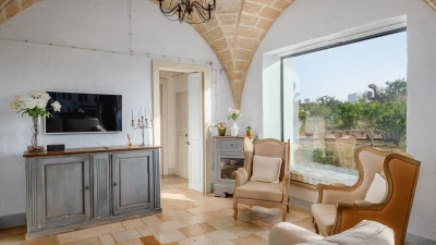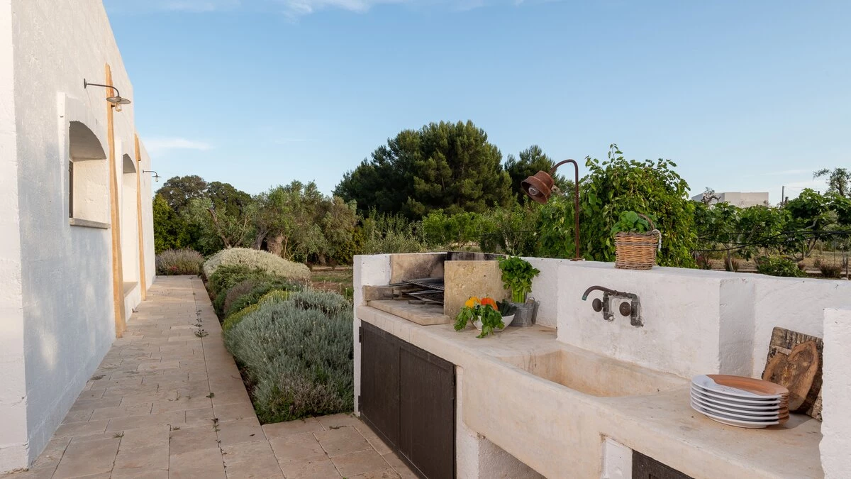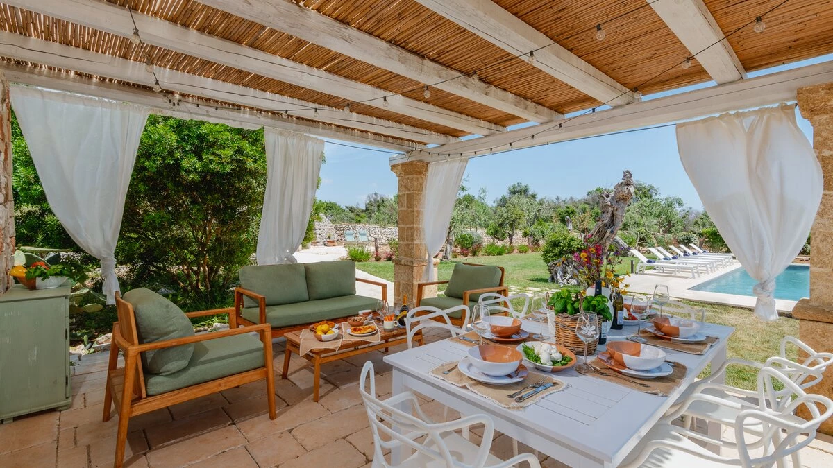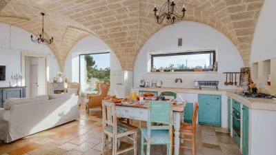 Encircled by extensive gardens and olive groves, Masseria del Faro is the perfect destination for a rural retreat for families and groups of friends alike. With crisp whites, exposed brickwork, and an uncluttered style, this newly restored villa combines traditional Puglian stone-built architecture with rustic-chic interior décor and the comfort of modern facilities. Designed for outdoor living, the covered terrace, with a furnished lounge area and an al fresco dining table next to the barbecue, has direct access to two bedrooms in one section and the open-plan kitchen, dining and seating area, and a further bedroom in the Main House accessed from the opposite side of the connecting covered terrace. Both parts of the villa have traditional tiled floors and exposed stone vaulted ceilings throughout. All three bedrooms have shower rooms en suite, king size double beds, and two of the three bedrooms open to the gardens. Two stone paths leading to the private pool where a pergola with dining area, soft seating and barbecue has been recently added. Recent improvements also include the restoration of the characteristic trullo with small double bed, suitable for young adults. The historic town of Morciano di Leuca and the seaside town of Torre Vado, with magnificent sandy beaches known as the 'Maldives of Salento' with clear, gently sloping beaches with crystalline waters and lively beach clubs with bars and restaurants are a very short drive away from Masseria del Faro. Further inexpensive restaurants are in and around picturesque local villages. Day trips and yacht and boat trips can also be organised to explore the beautiful coastline and sea grottoes.