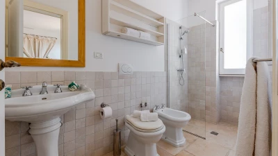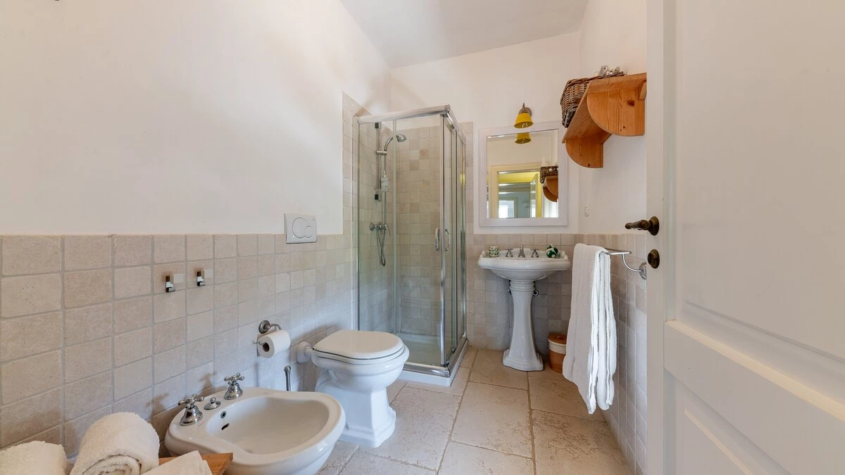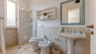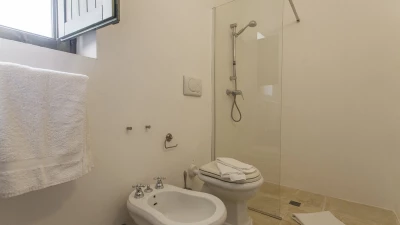With its west facing front terrace enjoying the golden tones of the sun setting, and fabulously furnished for outdoor living, this elegant stone-built house, set privately adjacent to an oak wood, blends traditional materials with very individual décor and stylish colourful touches. The airy and elegant star vaulted living room and dining area catch cooling breezes, and the dining area opens to the terrace and portico at the front and rear of the villa. On the front terrace, there is ample seating in sun and shaded spots complemented by an al fresco dining areas. The rear furnished portico looks out to the oak woodland. All five bedrooms are decorated with flair in elegant Italian style with colourful fabrics, but each are also of a consistent size and standard with ample wardrobe space, air conditioning and en suite shower room. Two bedrooms are on the first floor of the main house, one with a broad private terrace overlooking the pool, oak wood and countryside. The other two are at ground floor level, accessed from the rear portico.