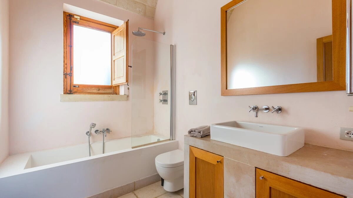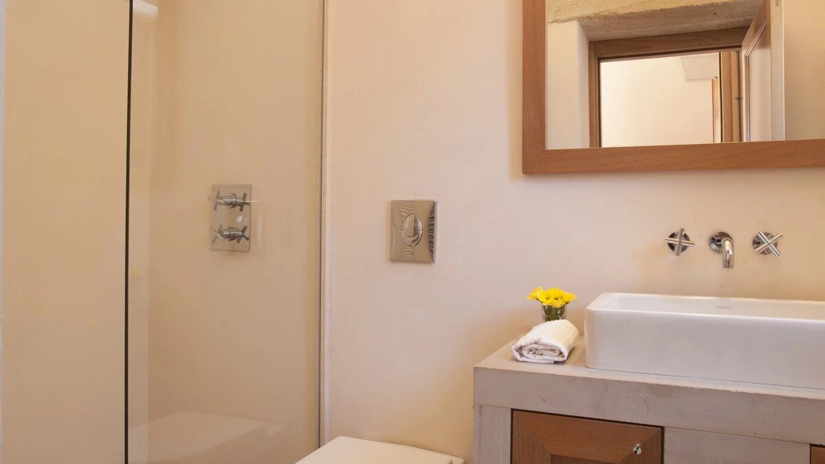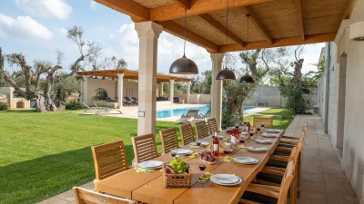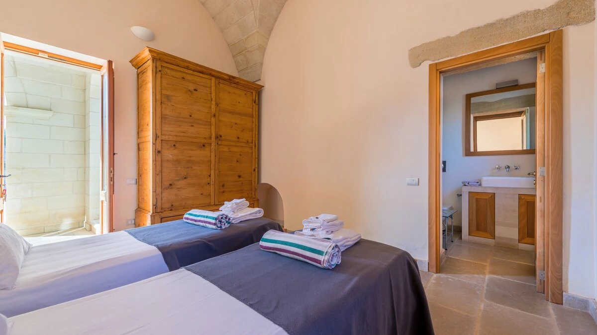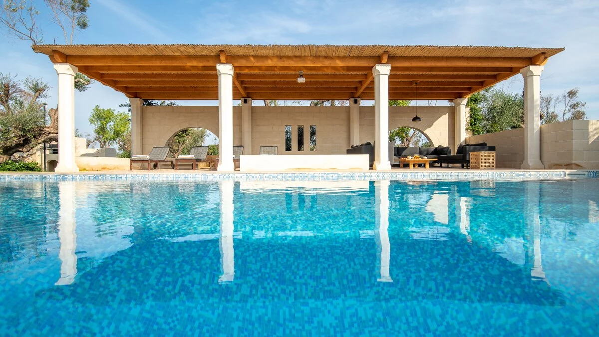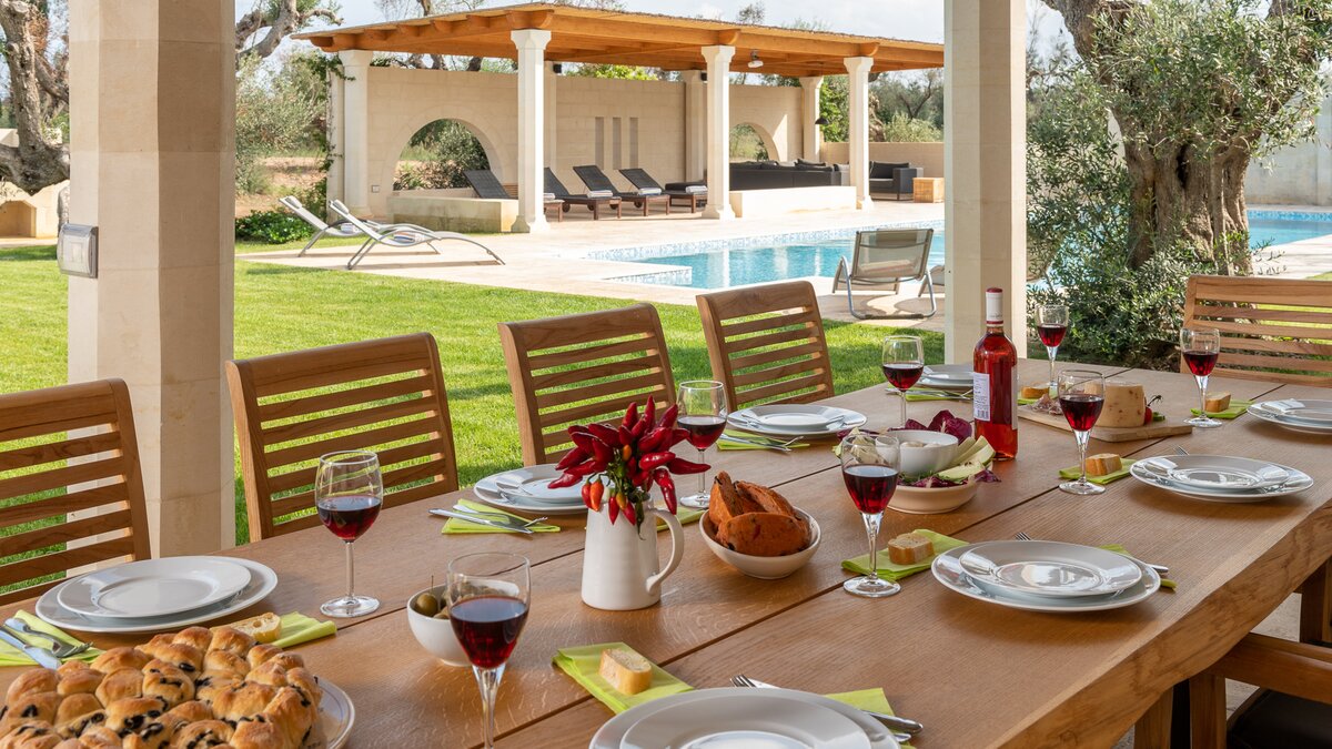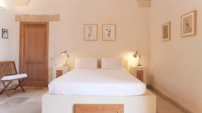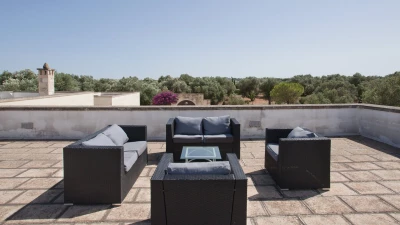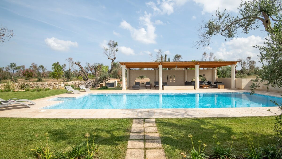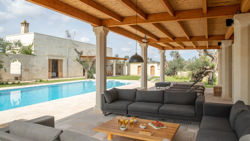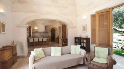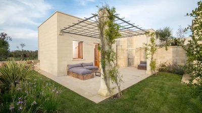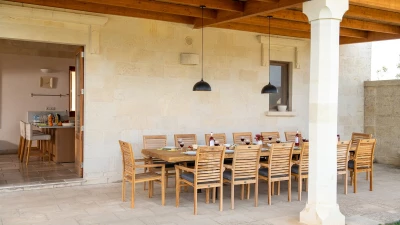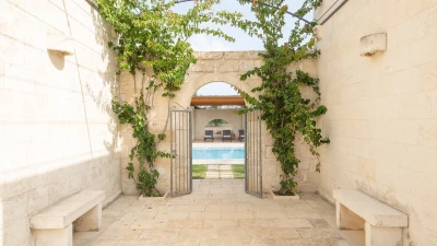 Superbly constructed by master craftsmen, with perfect attention to period detail from its vaulted ceilings to the hand-carved sandstone walls, this is a modern luxury villa in Puglia, with the footprint and simple elegance of the region’s traditional farmhouses. Huge timber doors fill the arched gateway into the courtyard, which is large enough for a game of badminton and houses a pizza oven, barbecue and big dining table under pergola shade. An external staircase leads to a sun drenched roof terrace, an arched portico shelters the doorways to three en suite bedrooms, and shuttered French windows link the al fresco space with an open-plan living room and kitchen, where stainless steel and contemporary art complement country style furnishings. A guest annexe provides a further two bedrooms, while additional outdoor space comes in the walled garden which surrounds a fifteen metre pool looking out over the olive groves with a lovely al fresco lunch spot. In addition to the guest annexe there is a new garden suite, with a spacious double bedroom opening to a private terrace. Further recent additions include a pool loggia with soft seating and space for sunbeds and is also a great spot for outdoor cinema.