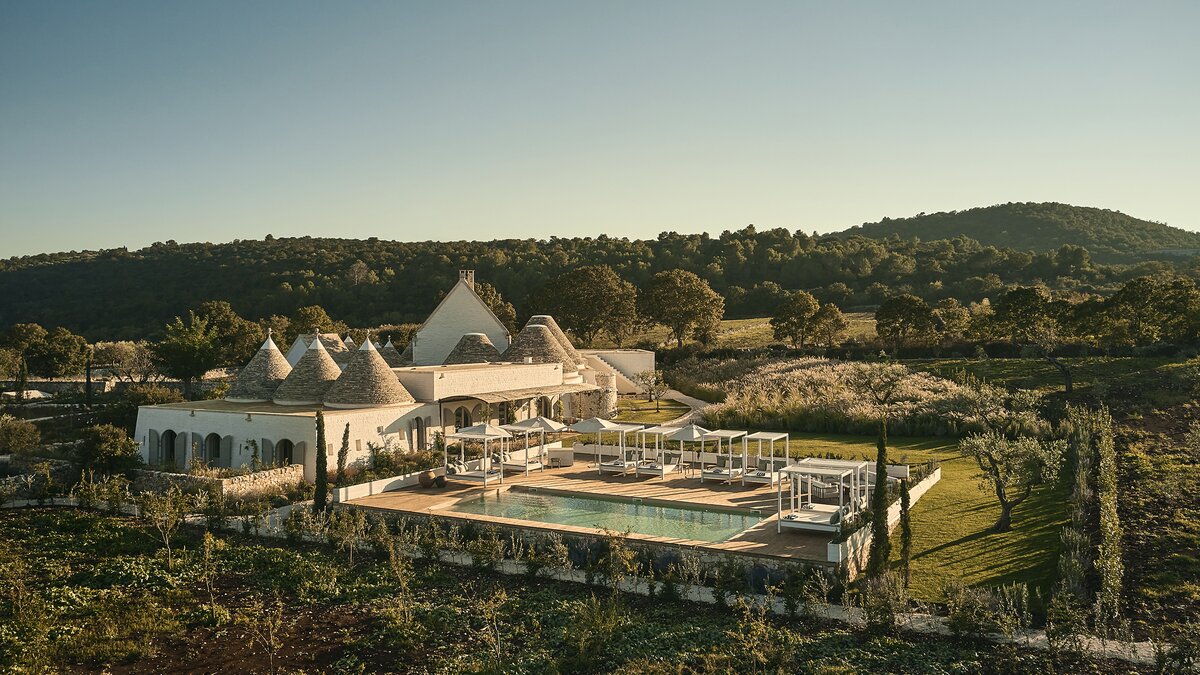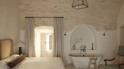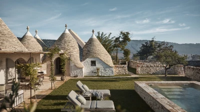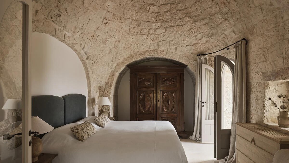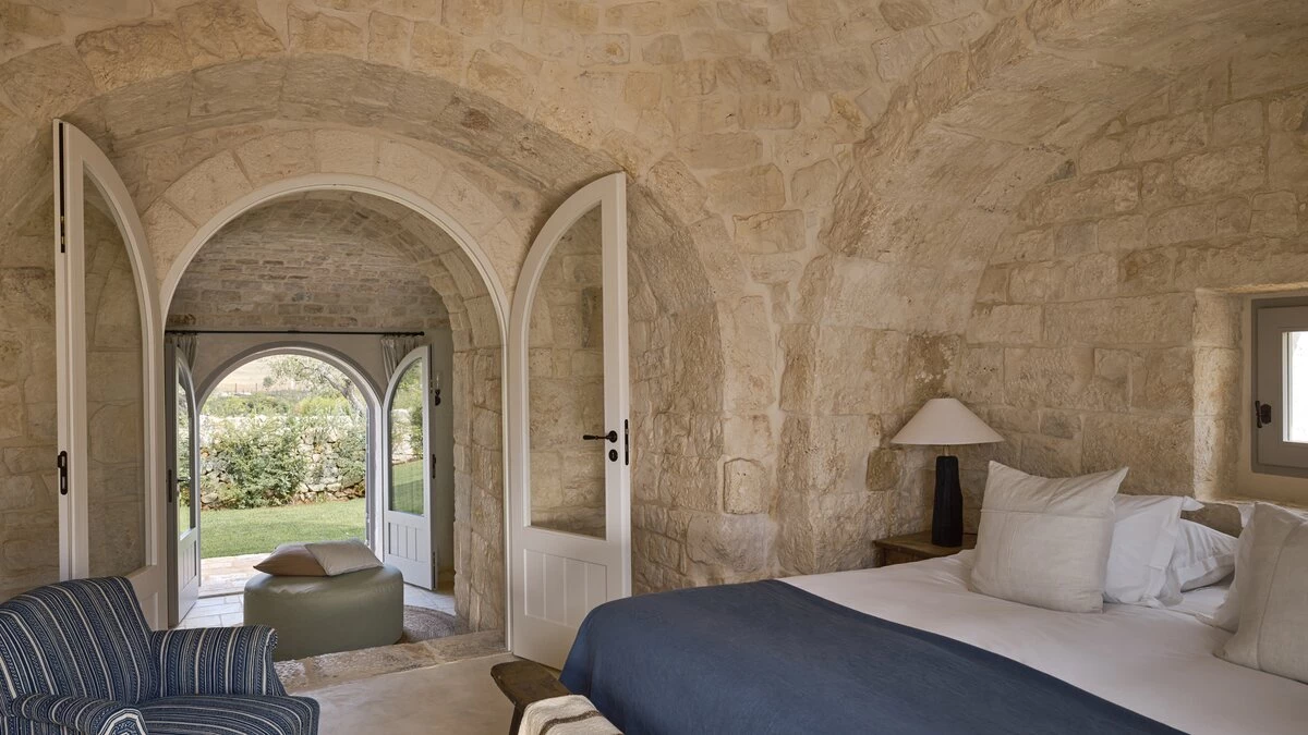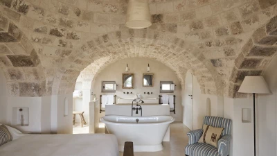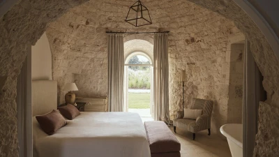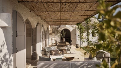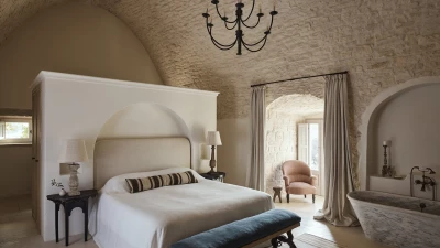 Outside, the three hectares of private walled gardens of the Masseria are accompanied by aromatic plants that embellish the space to incorporate a rich variety of colours, alongside scents found all throughout Italy. The interplay of these elements elevates the ambience of the villa's expansive outdoor dining spaces, suitable for groups of twenty guests, imbuing them with a sense of serene, tranquil sophistication. The villa’s impressive heatable pool is a great way to wind down after an evening meal, alongside the villa being within easy reach of the coast. Nearby, guests can enjoy an authentic Italian dish from one of three restaurants in Cocolicchio, as well as choosing between various dining options in the famous town of Alberobello, known for being home to hundreds of trulli, representative of the region’s architecture that has remained popular since the fourteenth century.