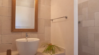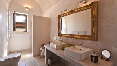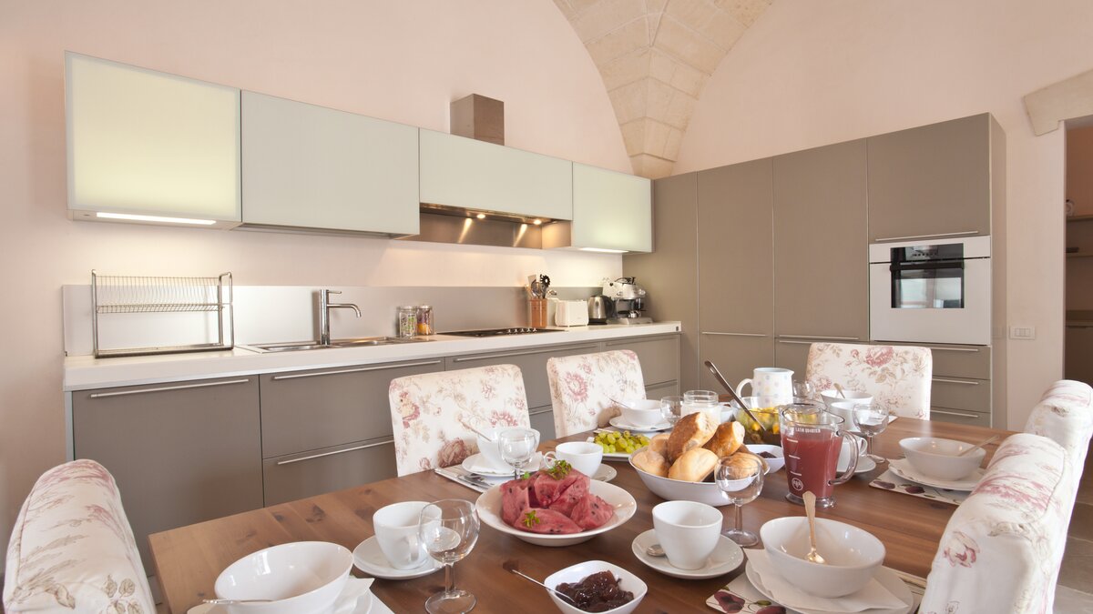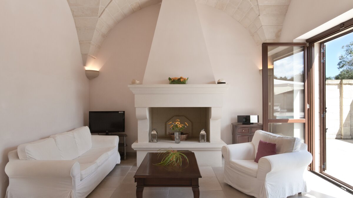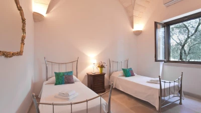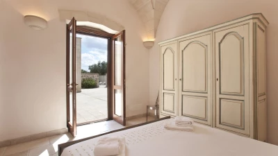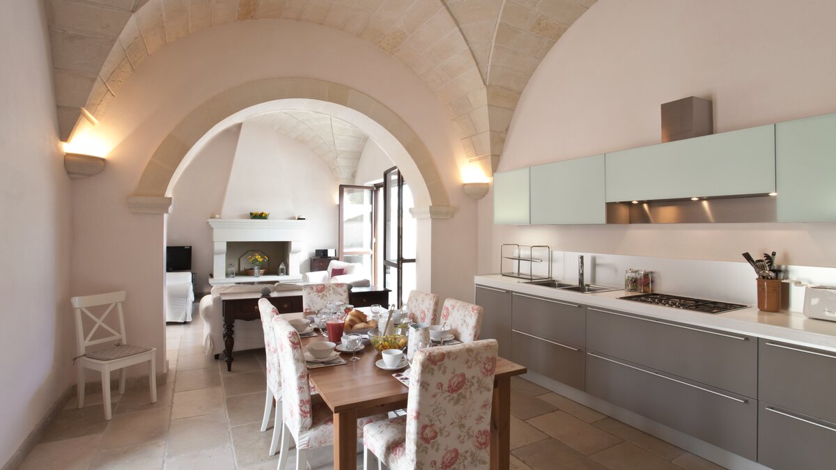 With contemporary décor, pale stone walls, marble floors and gloriously vaulted ceilings, this gorgeous house is quietly secluded in private rural acres, and exudes an air of cool, calm relaxation. A cloistered courtyard at the front of the villa has an almost Moorish feel, with gentle lighting for balmy evenings, highlighting the Masseria’s graceful architecture. A larger courtyard, to the rear, is home to an unusually large swimming pool, with parasol shade for a poolside seating area, and a pergola furnished for al fresco dining. French doors lead in from here to the living area, where an airy sitting room, all in creamy white, is open-plan to the dining kitchen, its sleek styling softened by country fabrics. And, in a layout which would offer extra privacy for two families, the bedrooms are accessed from the cloister, two in the central section, two in the side wing, and all air-conditioned, elegant and uncluttered.