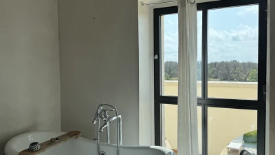 Set on a secluded 2 hectare estate, the villa sleeps up to 10 guests across five beautifully styled en suite bedrooms, each with air conditioning and views of the peaceful countryside. The ground floor features an open-plan living and dining area with traditional vaulted ceilings, and fireplace, a modern, very well equipped kitchen, and three bedrooms. Upstairs, two elegant master suites open onto expansive terraces, perfect for sunrise yoga, meditation, or evening drinks with panoramic views.