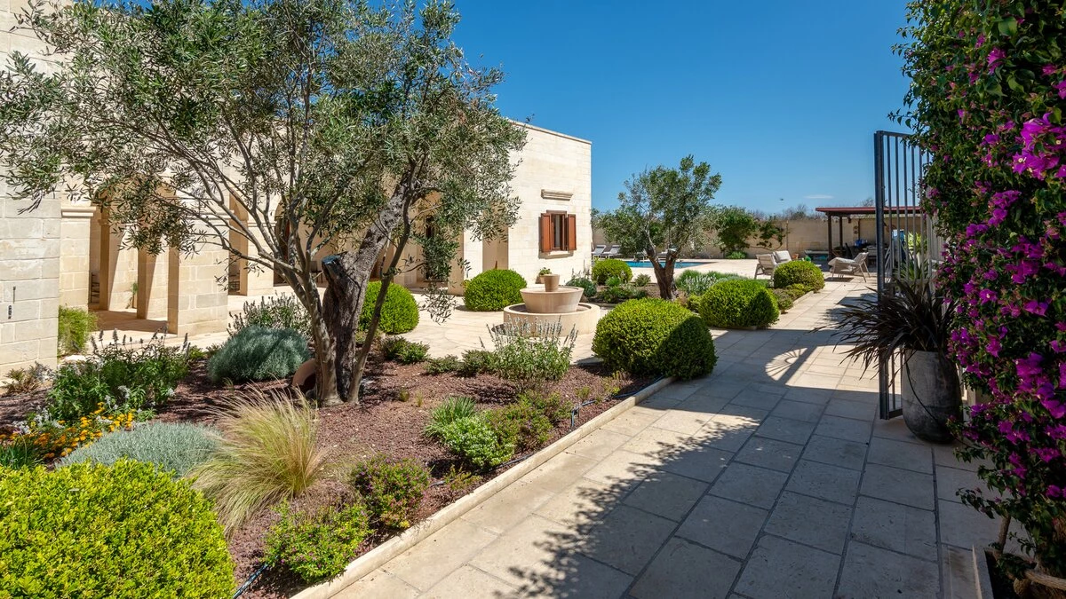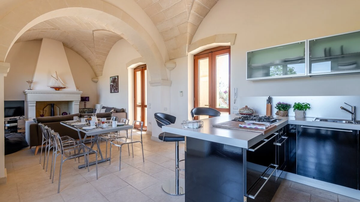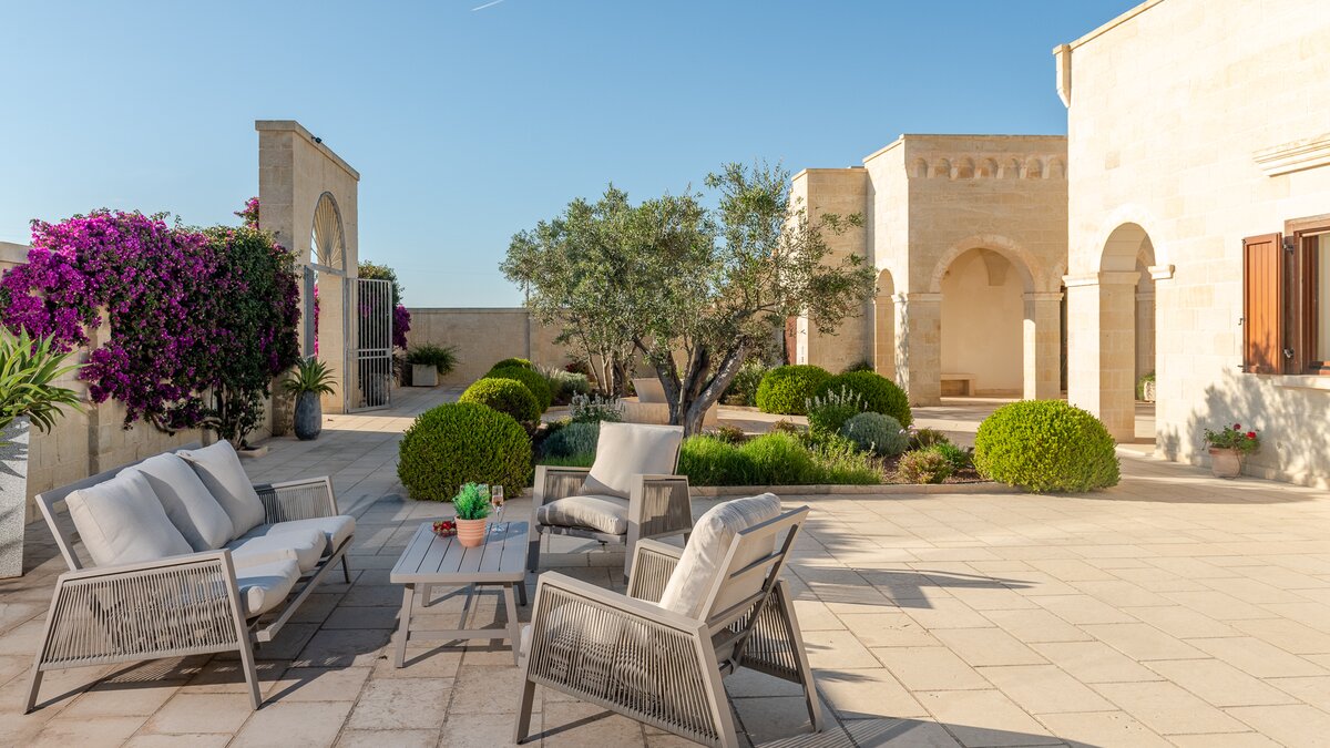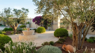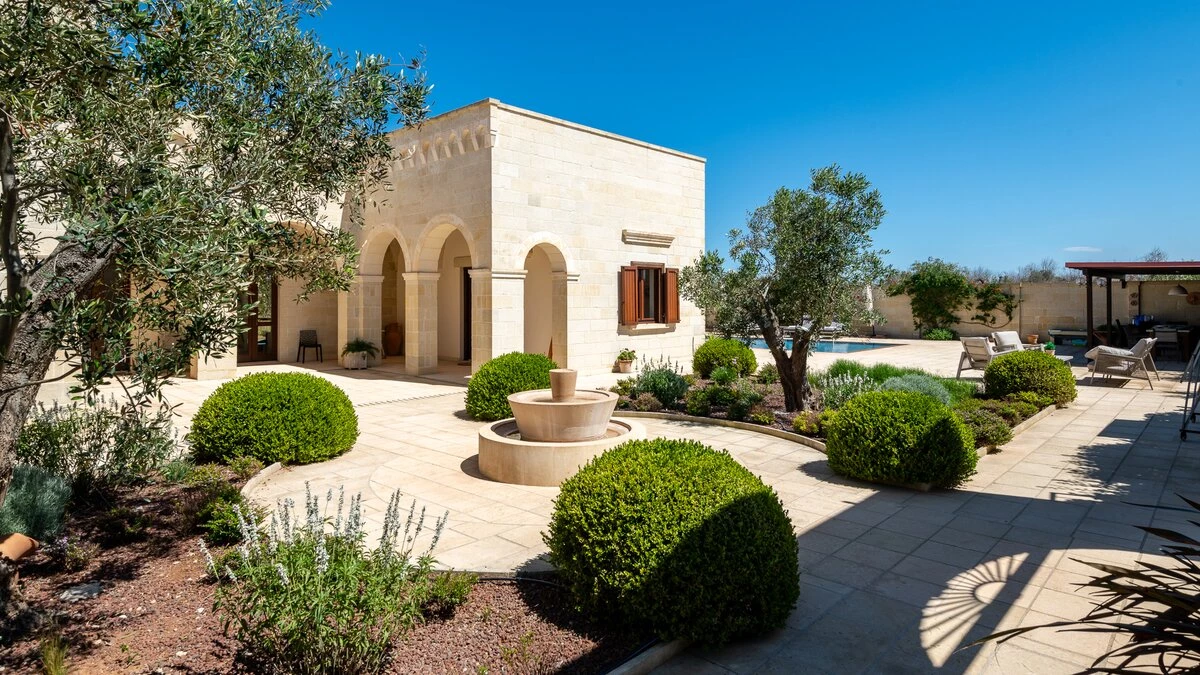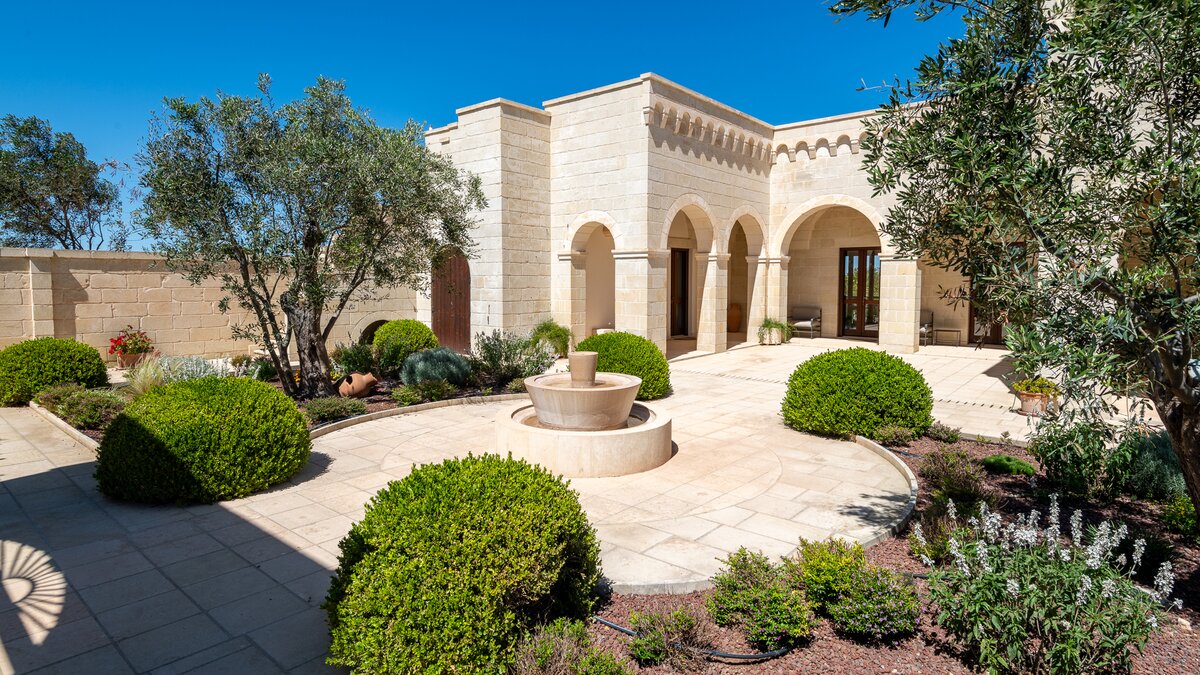 With olive groves stretching as far as the eye can see, and clear-day views of the Albanian mountains from its roof terrace, Masseria Violetta enjoys a truly tranquil setting, though shops and restaurants in Cannole are just 2km away, and Martano and Otranto are both within easy reach. Built in pale stone, in the style of the region, the ‘U’ shaped house stands in a cloistered courtyard, with arched walkways accessing the rooms, a stone staircase to the roof, and a fountain burbling gently in the sun. Within the villa, high vaulted ceilings crown stylish rooms in minimalist monochrome, furnished with wrought iron, chrome and glass, and fitted with air conditioning, WiFi and modern appliances. Flooded with light from dual aspect doors to the terrace and fruit trees, the base of the ‘U’ is an open-plan arrangement of kitchen with breakfast bar, a very contemporary dining area and striking sitting room. There are two double bedrooms in one of the wings and, in the other, a twin room and the master suite opening to the pool terrace with its impressive bathroom. Al fresco living focuses on a night-lit swimming pool, set in a walled and paved terrace, with a dining pergola, barbecue, fridge and food prep area.