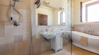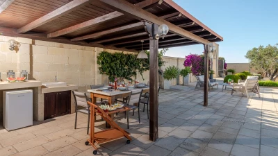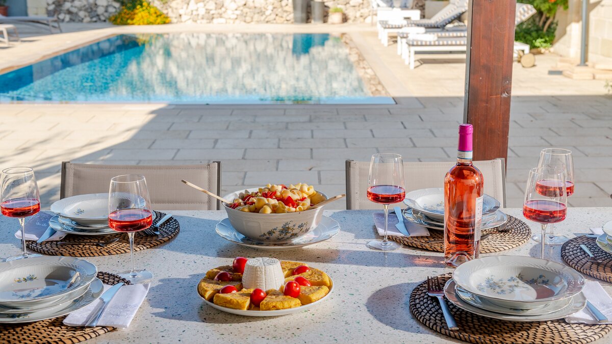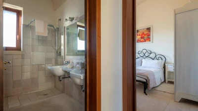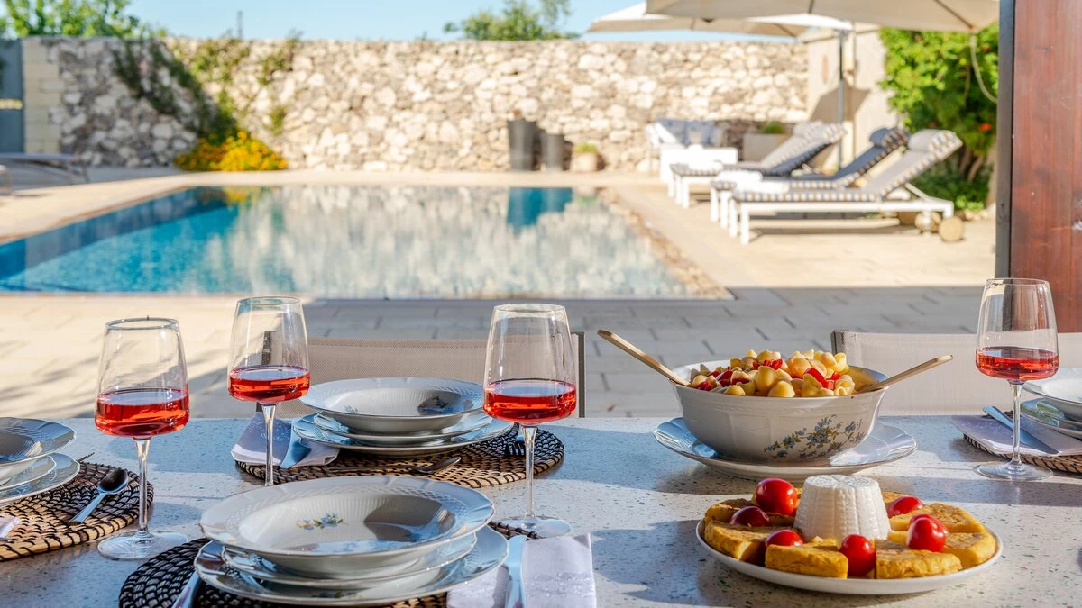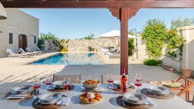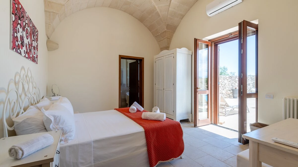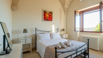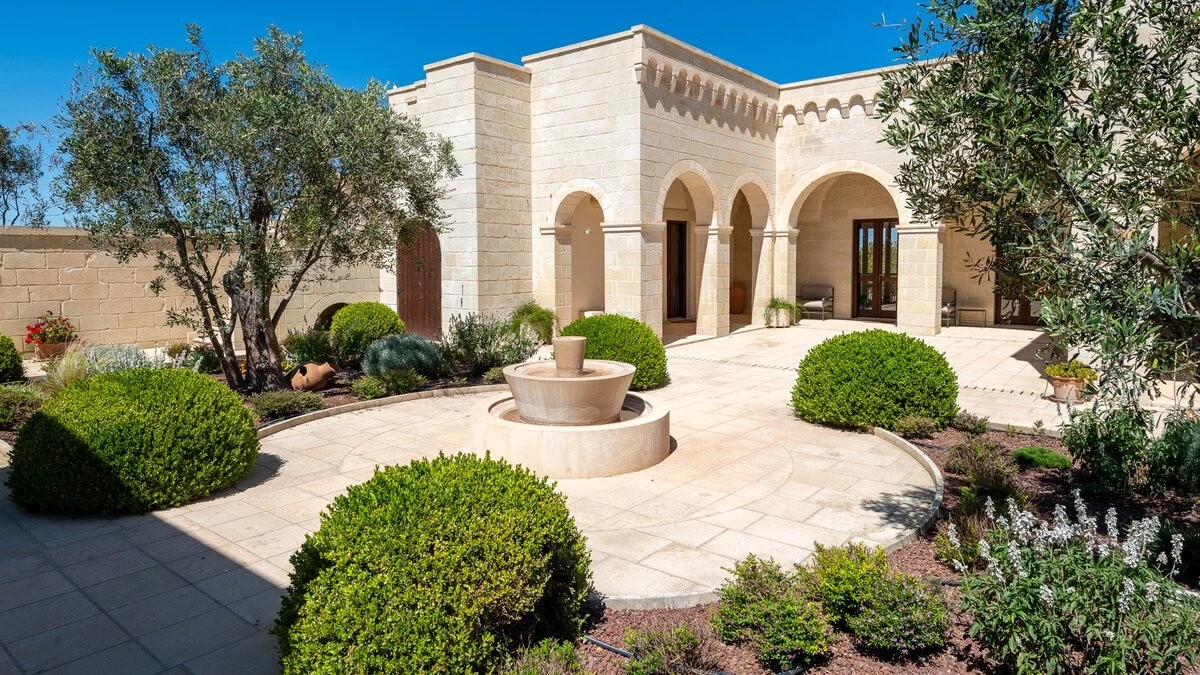 With olive groves stretching as far as the eye can see, and clear-day views of the Albanian mountains from its roof terrace, Masseria Violetta enjoys a truly tranquil setting, though shops and restaurants in Cannole are just 2km away, and Martano and Otranto are both within easy reach. Built in pale stone, in the style of the region, the ‘U’ shaped house stands in a cloistered courtyard, with arched walkways accessing the rooms, a stone staircase to the roof, and a fountain burbling gently in the sun. Within the villa, high vaulted ceilings crown stylish rooms in minimalist monochrome, furnished with wrought iron, chrome and glass, and fitted with air conditioning, WiFi and modern appliances. Flooded with light from dual aspect doors to the terrace and fruit trees, the base of the ‘U’ is an open-plan arrangement of kitchen with breakfast bar, a very contemporary dining area and striking sitting room. There are two double bedrooms in one of the wings and, in the other, a twin room and the master suite opening to the pool terrace with its impressive bathroom. Al fresco living focuses on a night-lit swimming pool, set in a walled and paved terrace, with a dining pergola, barbecue, fridge and food prep area.