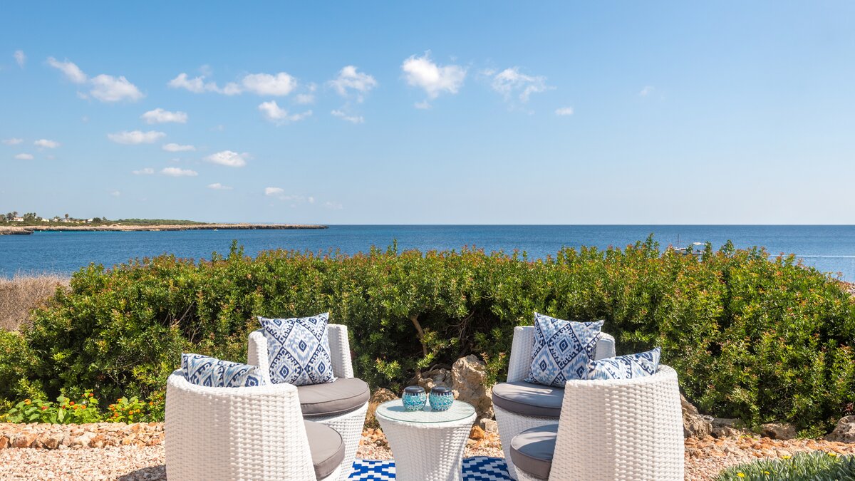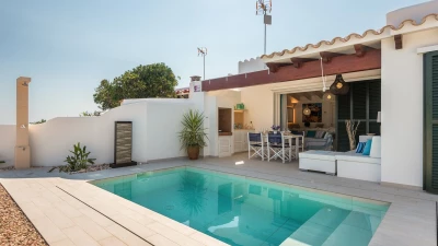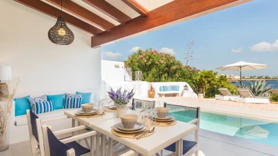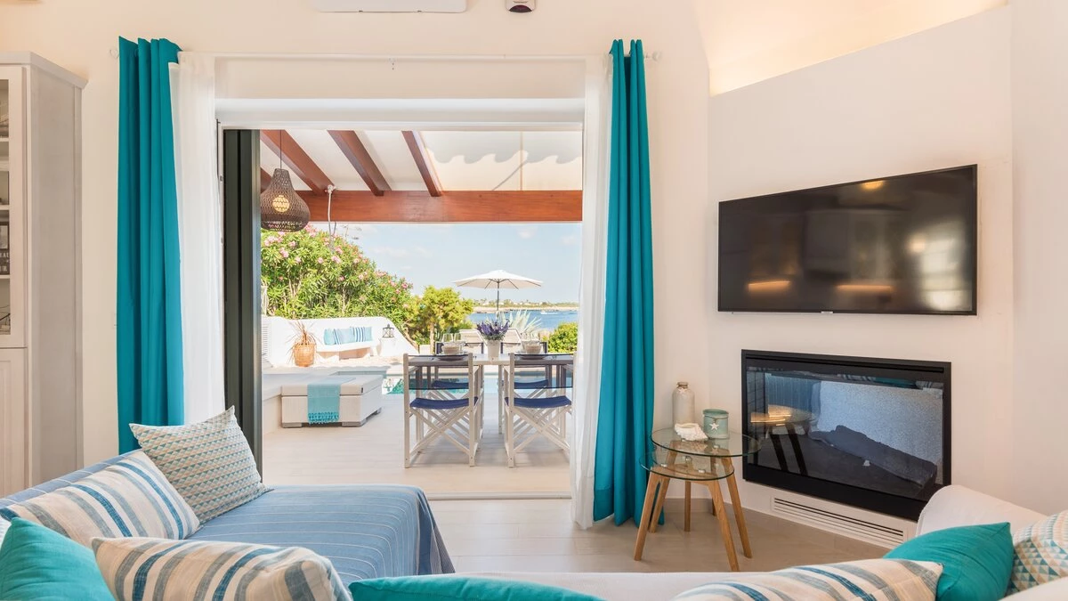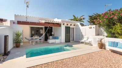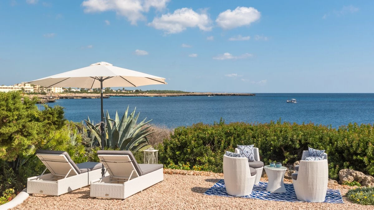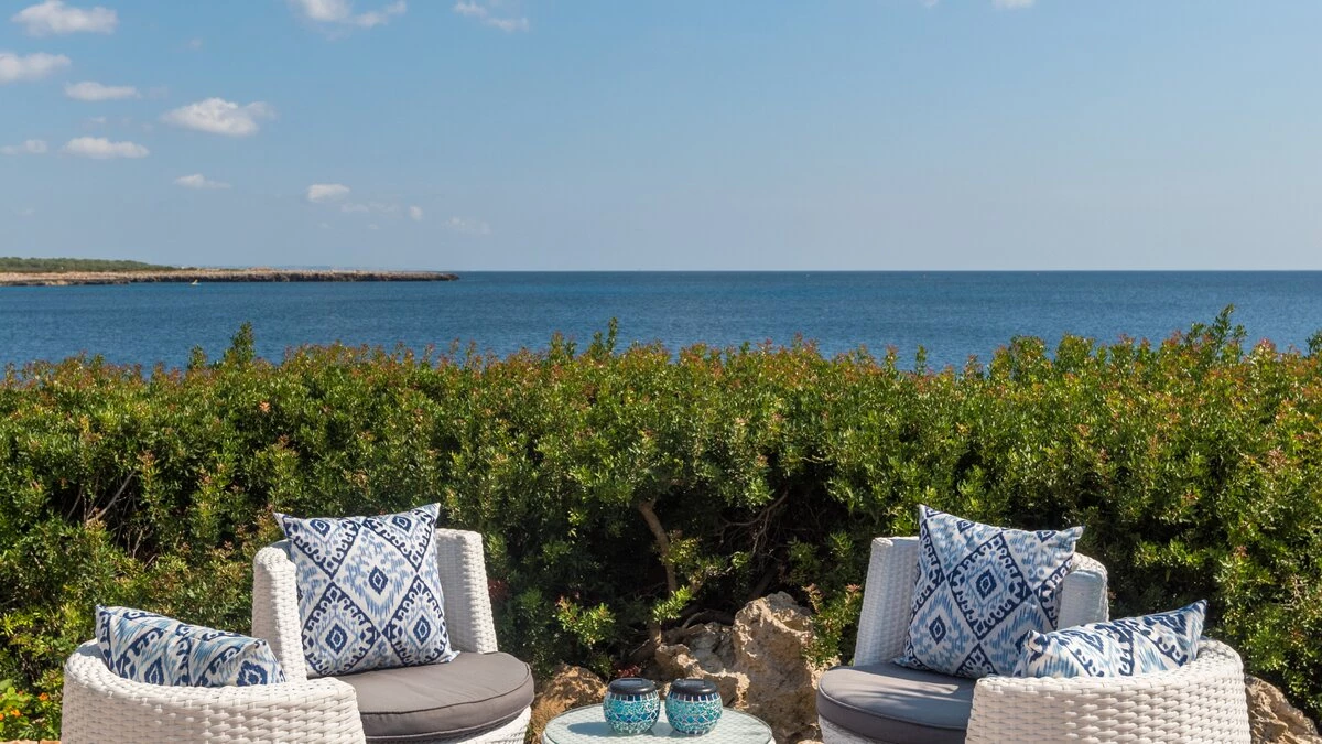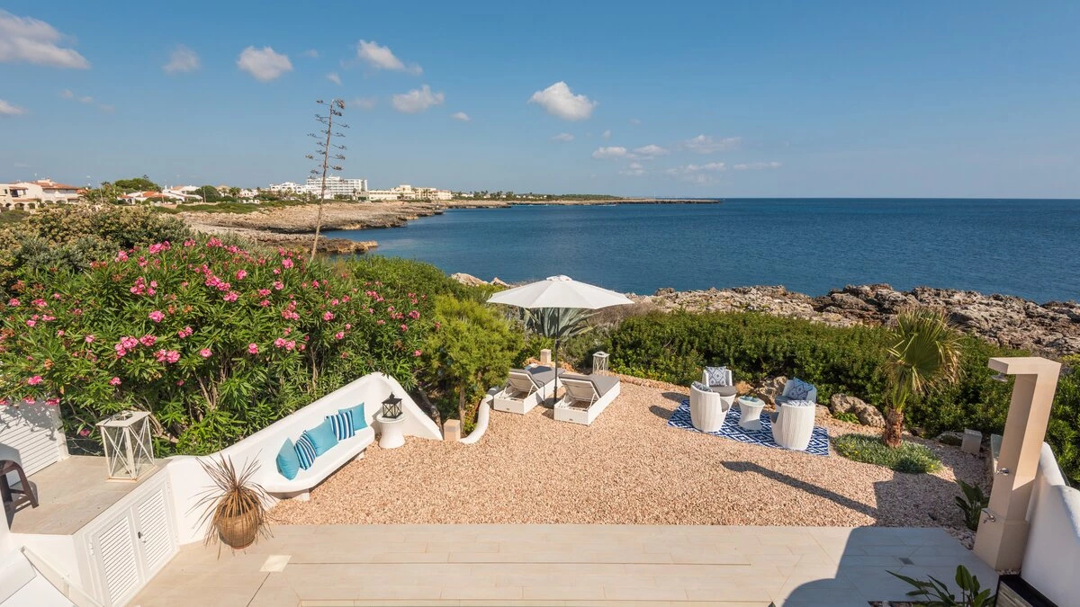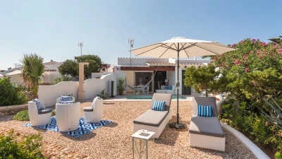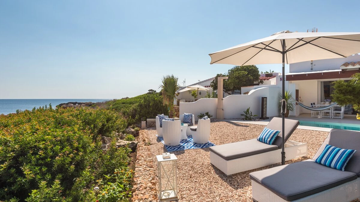 Perched above the sea, this remarkable small villa in Menorca is a perfect place just for two or a small family – with picture perfect panoramas. Recently refurbished in contemporary style with great attention to detail, the new interiors of this enchanting small villa belie its unassuming outline. The property is almost entirely open-plan, the entrance leads into a pretty ‘marine-chic’ kitchen/dining/sitting room with 43” Smart TV and board games. The two bedrooms share a beautiful shower room. Outdoors, there is a shaded al fresco dining terrace, built in barbecue and further comfortable seating and loungers on the pool terrace to take advantage of the views. Set in a cluster of properties, there are neighbours either side but high walls and vegetation ensure privacy. Due to difficult and slippery access, swimming is not recommended immediately below the property but the sandy beach, shops and restaurants at Cala en Bosch are just 500m away with further sandy beaches just a little further away within easy reach and all the restaurants and bars of Ciutdella just 8km away.
