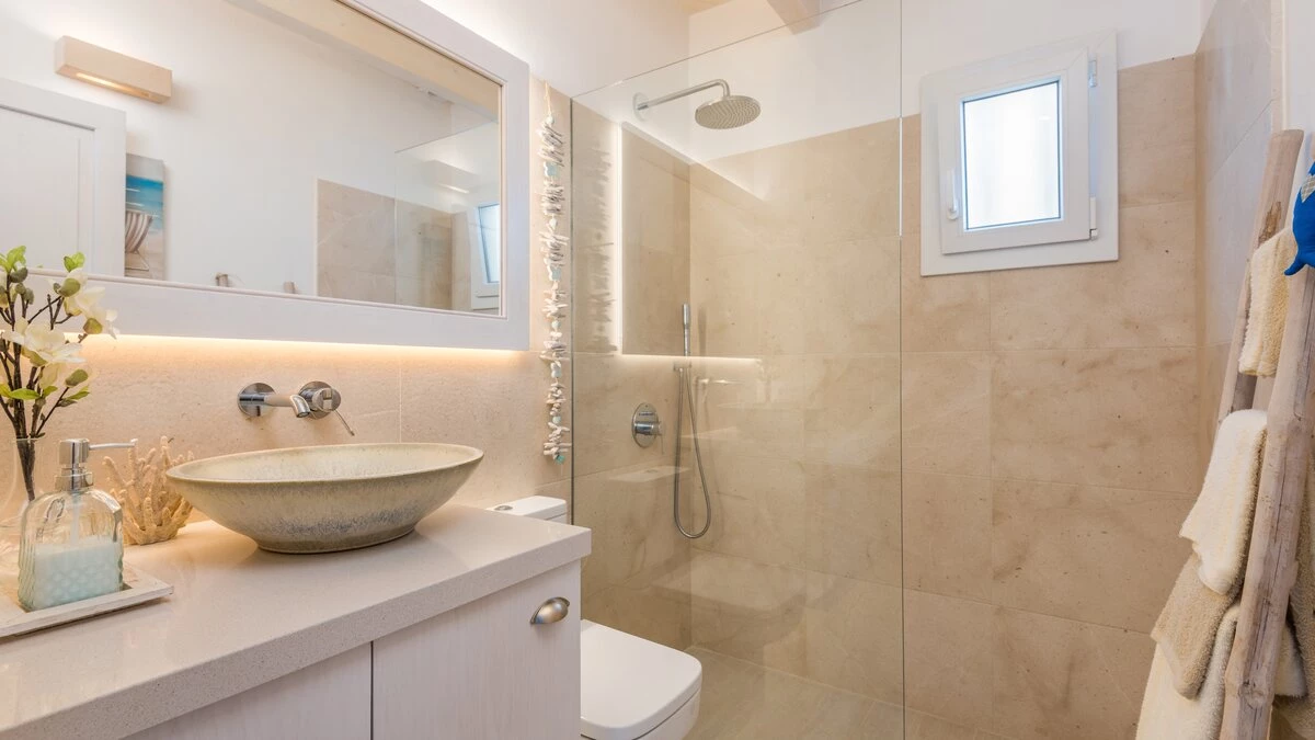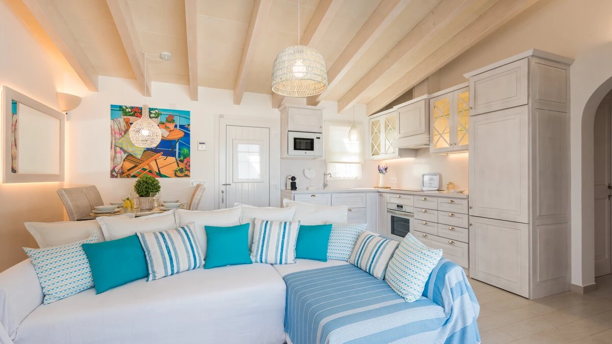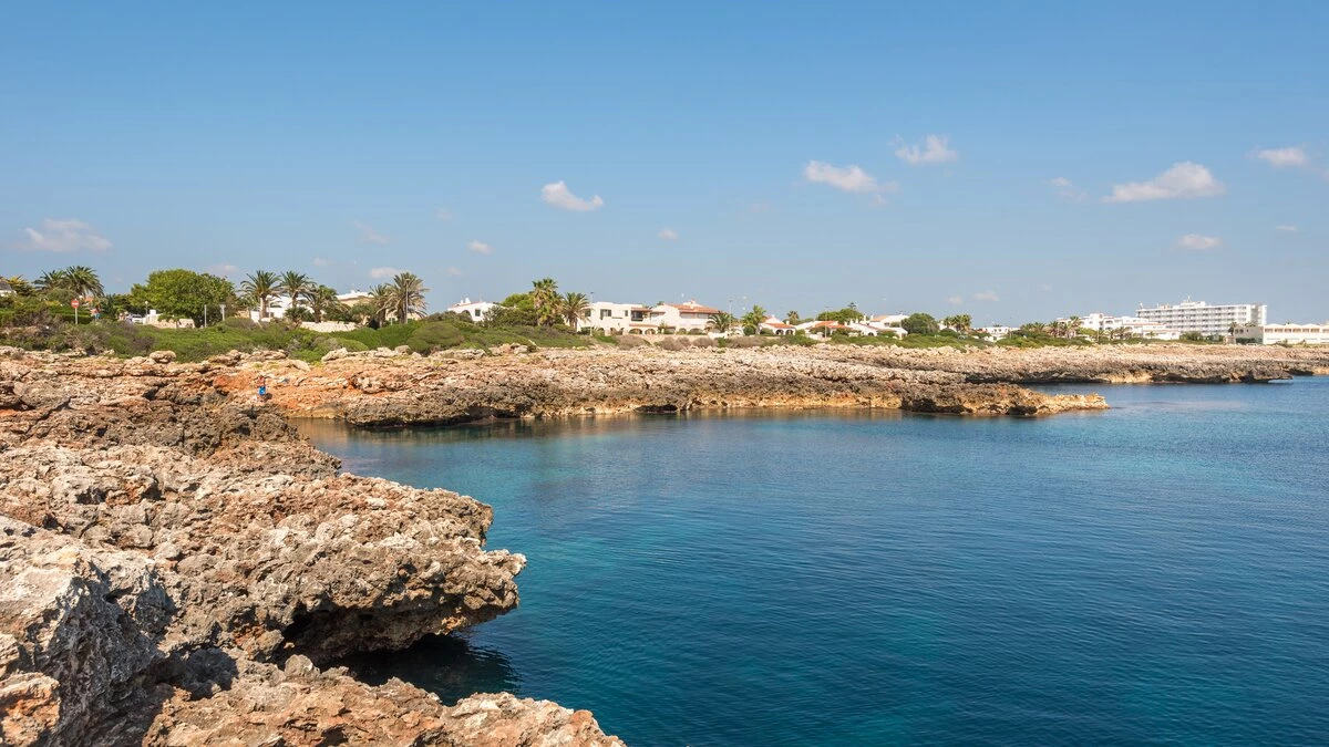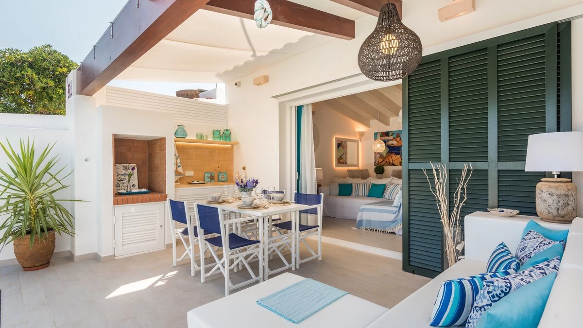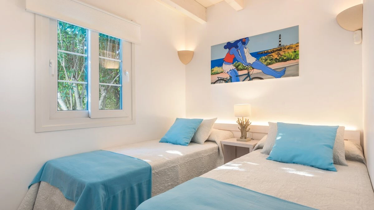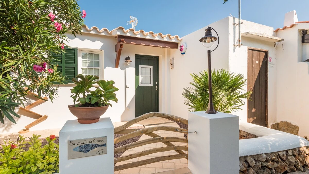 Perched above the sea, this remarkable small villa in Menorca is a perfect place just for two or a small family – with picture perfect panoramas. Recently refurbished in contemporary style with great attention to detail, the new interiors of this enchanting small villa belie its unassuming outline. The property is almost entirely open-plan, the entrance leads into a pretty ‘marine-chic’ kitchen/dining/sitting room with 43” Smart TV and board games. The two bedrooms share a beautiful shower room. Outdoors, there is a shaded al fresco dining terrace, built in barbecue and further comfortable seating and loungers on the pool terrace to take advantage of the views. Set in a cluster of properties, there are neighbours either side but high walls and vegetation ensure privacy. Due to difficult and slippery access, swimming is not recommended immediately below the property but the sandy beach, shops and restaurants at Cala en Bosch are just 500m away with further sandy beaches just a little further away within easy reach and all the restaurants and bars of Ciutdella just 8km away.