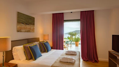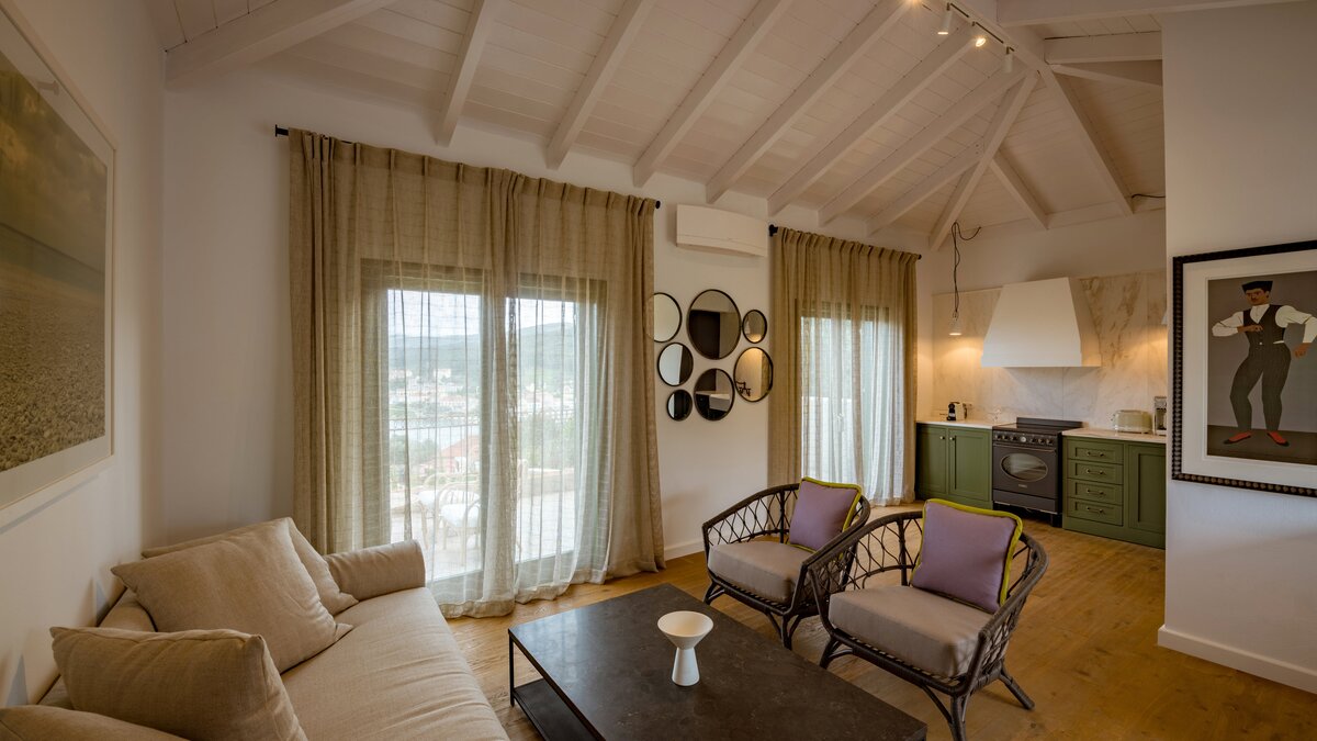 Perfectly located on the outskirts of Fiscardo with stunning views over the bay, Merope is decorated in a traditional style yet is absolutely modern and fully equipped with all comforts for the discerning traveller. Stylishly decorated with white walls and gorgeous neutral furnishings Merope has the feel of a boutique hotel. This property has been built with views in mind and the open plan kitchen/living/dining room is on the first floor allowing for gorgeous views across to Fiscardo harbourfront and opening onto a large balcony to allow for outside dining. On the ground floor are two beautiful double bedrooms, both with king size beds that can also be made up as twins and each with a luxurious en suite shower room and opening to the terrace. The splendid pool terrace is fronted by a lovely herb garden and guests are very welcome to pick their own herbs. Visitors will be very well looked after at this house, the fridge will be well stocked with breakfast items on arrival (and replenished for breakfast on request) and complimentary spirits are offered in the drinks fridge. Along with sister villas Fauna and Odele, Merope has a fantastic location close to Fiscardo port and just five minutes’ walk from the charming waterfront shops and restaurants. And a complimentary beach transfers can be arranged upon request.