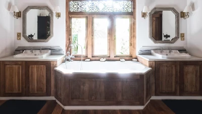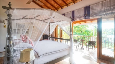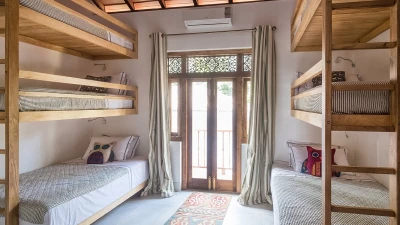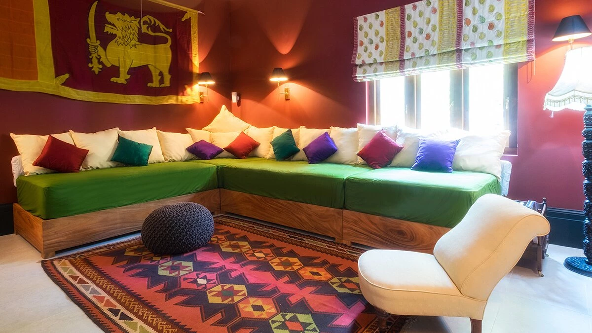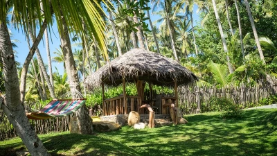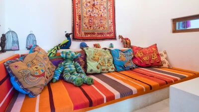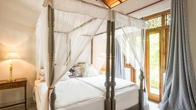 Outside on a lower terraced deck with comfortable loungers and ample tanning spots, is the unique kidney shaped infinity pool with sloping beach-inspired access ideal for children; a 20m water slide falls into the neighbouring plunge pool providing hours of fun for youngsters, whilst swimmers are undisturbed – or they may opt for further relaxation in the Jacuzzi. The landscaped gardens feature a peaceful yoga shala looking out to the ocean, often can also be used for a Buddhist blessing, whilst hammocks swing between the palm trees down by the beach. A wicket can also be set up for cricket. The entertainment continues back inside the villa with a cinema room and a brightly coloured kid’s snug. A spiralling teak staircase from the beautiful entrance hall and magnificent sitting room leads to six bedrooms within the main house, made up of three master suites with four-poster beds, two twin rooms and a mega bunk room sleeping up to 6 children; the seventh bedroom is housed in the lovely Garden suite.
