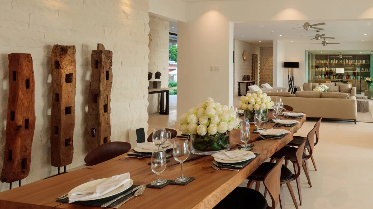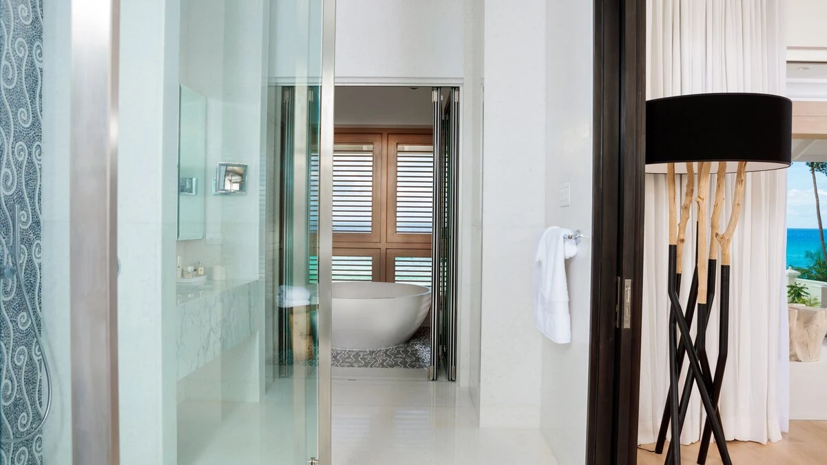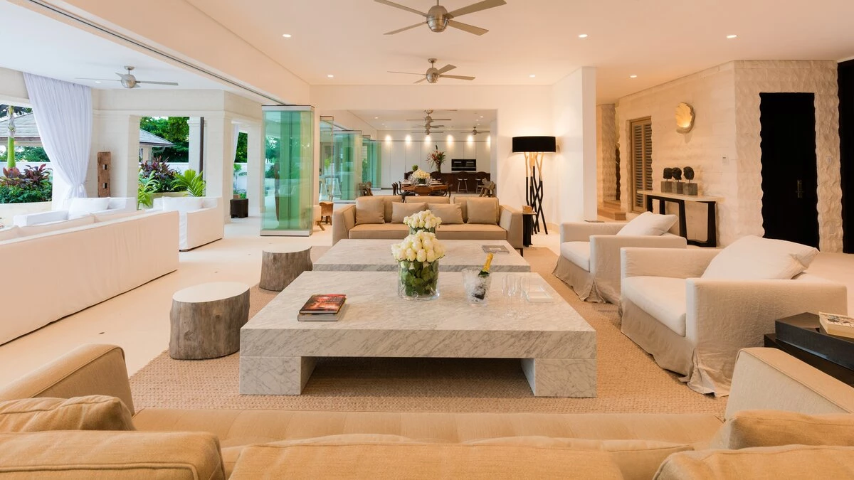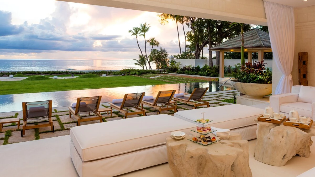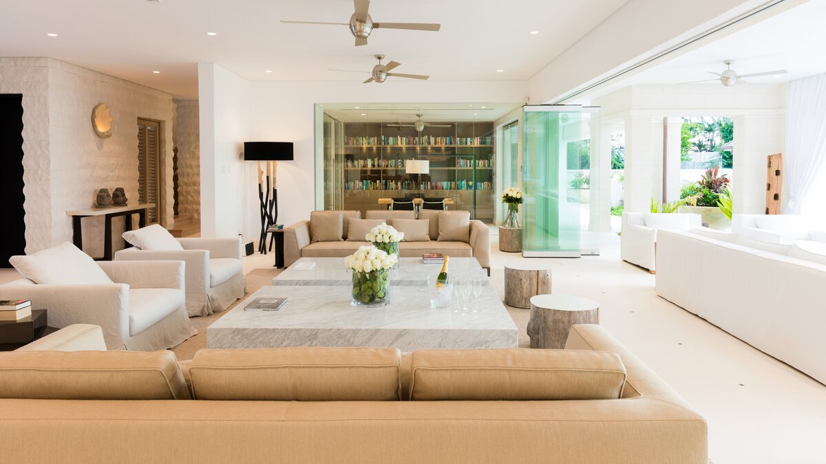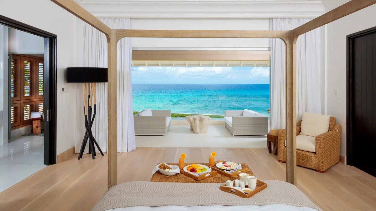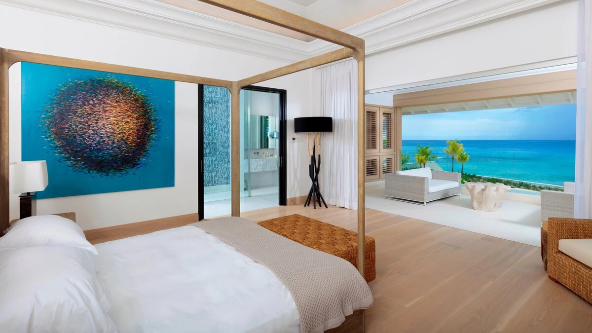 With a cinema room, outdoor swimming pool and gym, there isn’t much else you could wish for at Mullins Beach House. A double staircase overhung with a glimmering seashell chandelier takes you up to the villa’s five en suite bedrooms, each containing a stylish four-poster bed, walk-in wardrobe, and private terrace, making Mullins Beach House the ideal escape for large groups.
