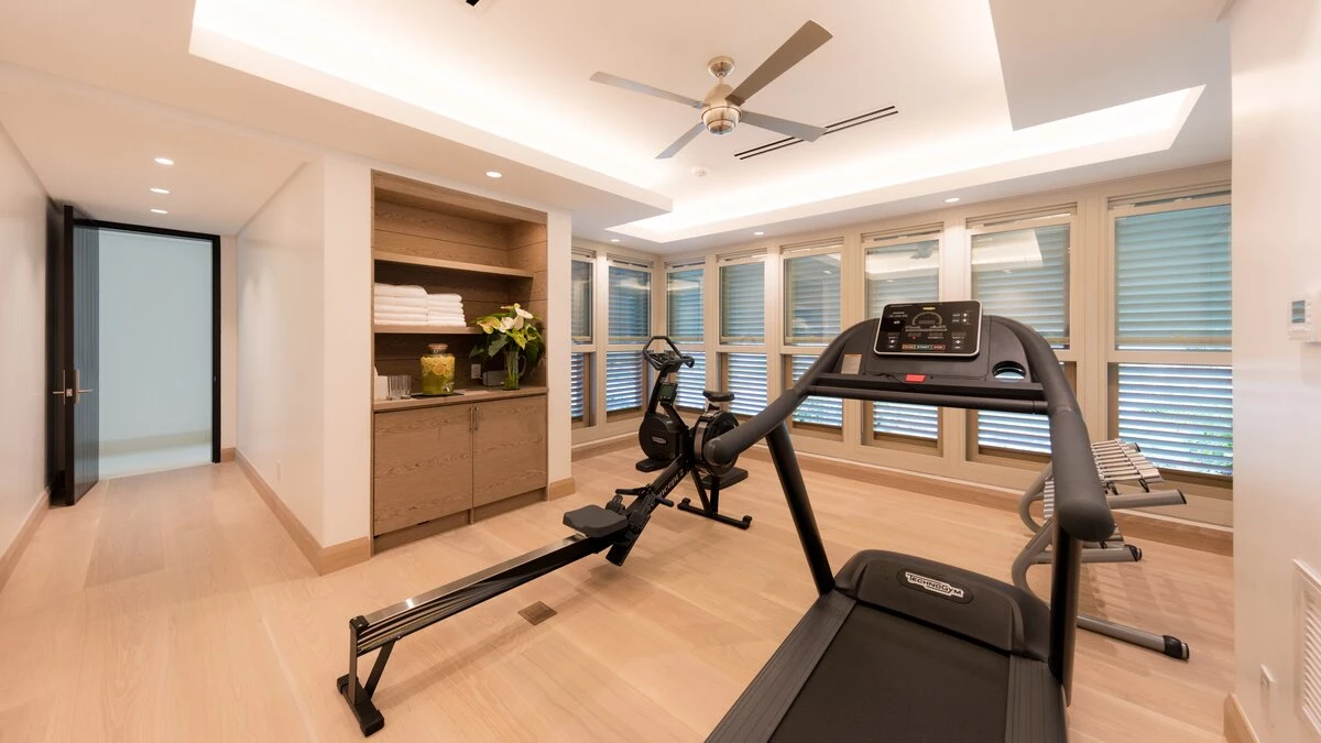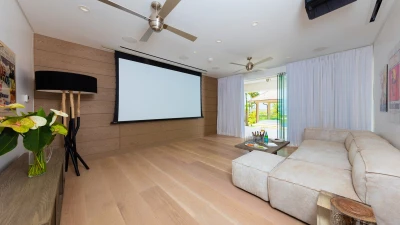 The villa contains a glass-walled study area, a cinema room for movie nights with friends and family, a private gym and yoga area, as well as an additional Sonos sound system in all main rooms. Outside is a swimming pool spanning twenty-five metres in length facing the far-reaching ocean below. The garden stretches 1.2 acres and includes a personal pebbled pathway leading to the seafront, where you can find additional beachfront restaurants should you choose to dine out.