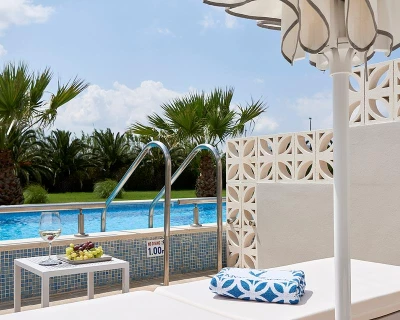 The rooms and suites at Mythos Palace are light, stylish and designed for complete comfort. Expect soothing colours, natural textures and peaceful spaces that reflect the beauty of the coastline. Choose from well-appointed doubles, spacious family rooms or premium options with private pools or swim-up access. Every room offers modern amenities, luxurious bedding and a balcony or terrace perfect for quiet morning coffees or relaxing evenings.
