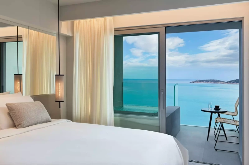 The resort blends contemporary design with Crete’s rich cultural heritage, featuring minimalist décor with artful touches inspired by the island’s traditions.