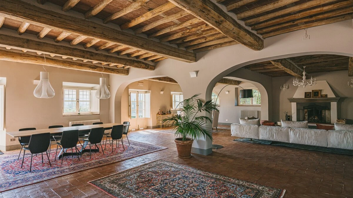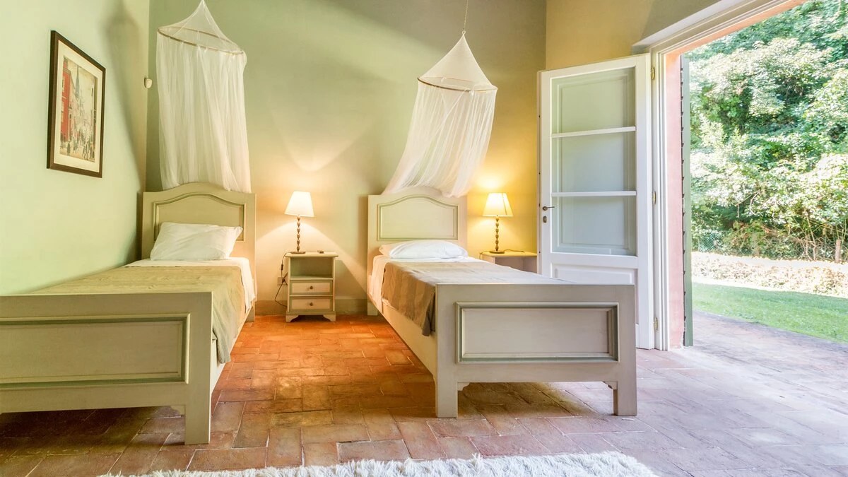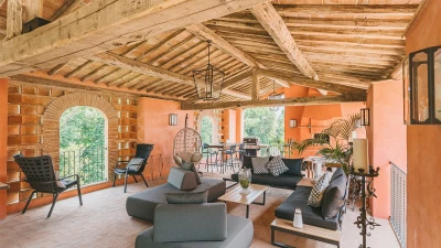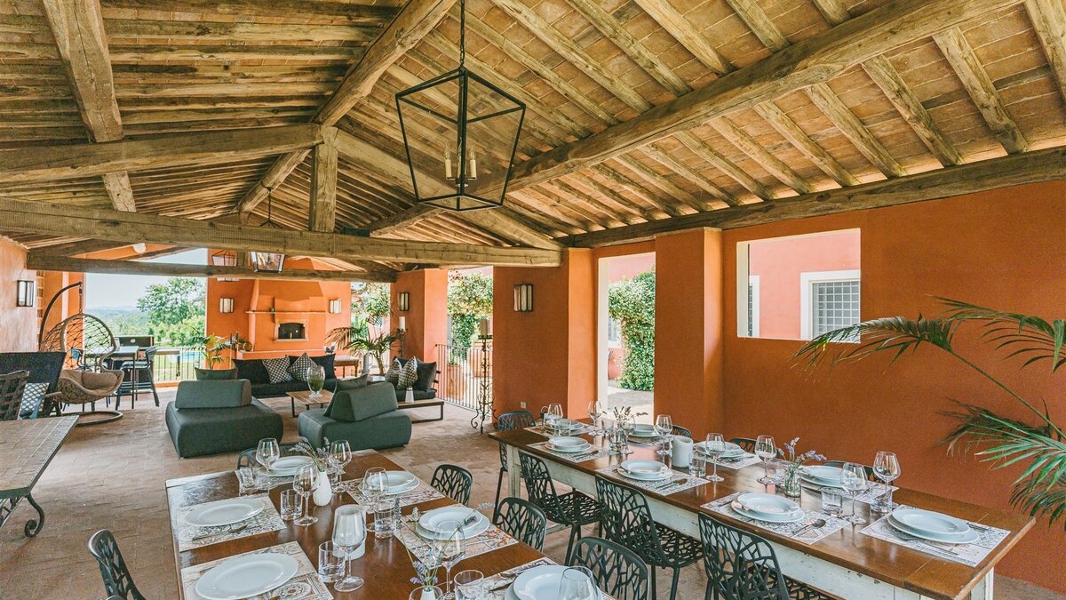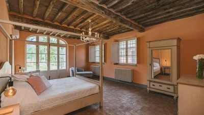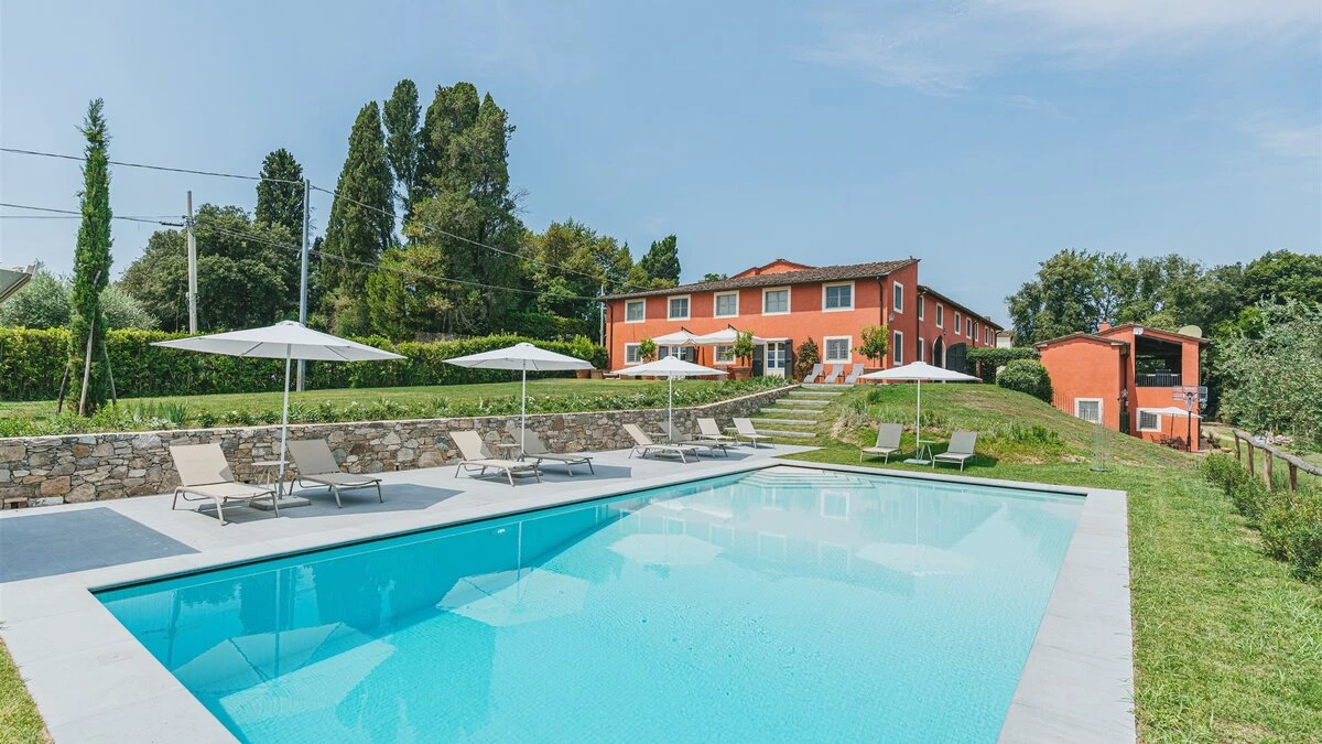 A pretty pink villa, privately positioned amid manicured lawns and mature trees, this charming house is the result of impeccable restoration. Formerly the farm buildings of an important historic estate, Novedieci now offers cool, comfortable and contemporary interiors beneath its chestnut beamed ceilings, seamlessly blending the old and the new with a well-equipped gym, WiFi, and flat screen televisions. Chic, spacious and uncluttered, the main house has a study, TV room, and a delightful open-plan living space with kitchen, dining and sitting areas. Each of the eight bedrooms is beautifully simply styled, all eight fitted with air-conditioning, and most with en suite full bath and separate shower.