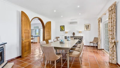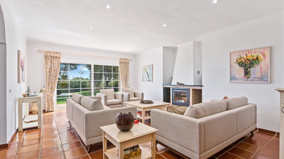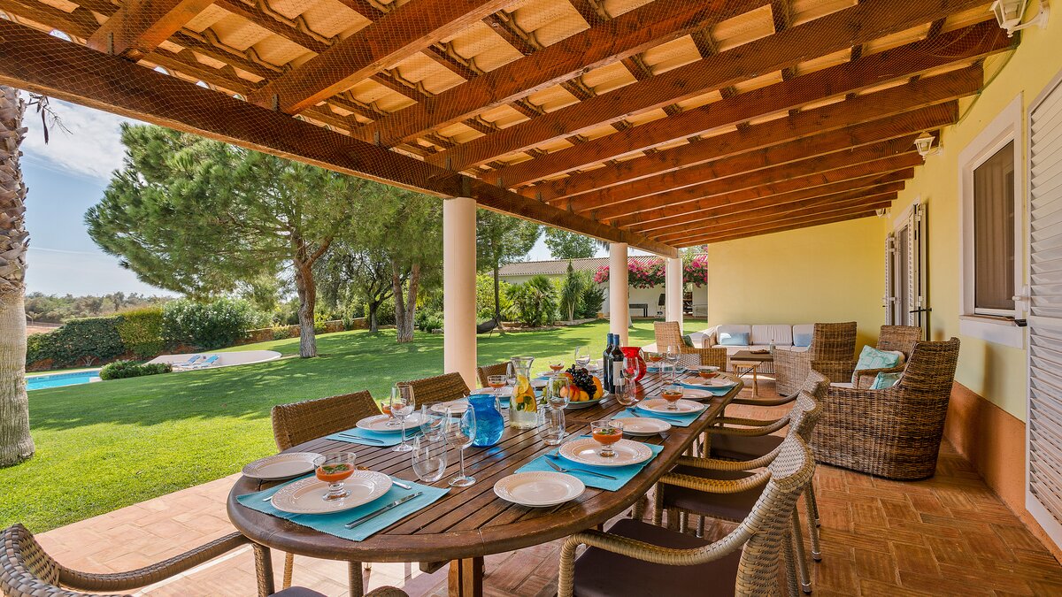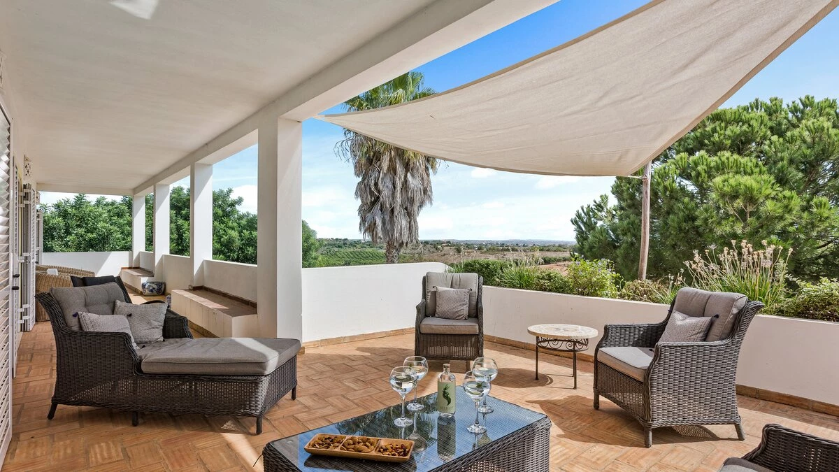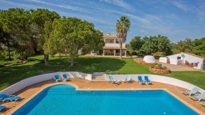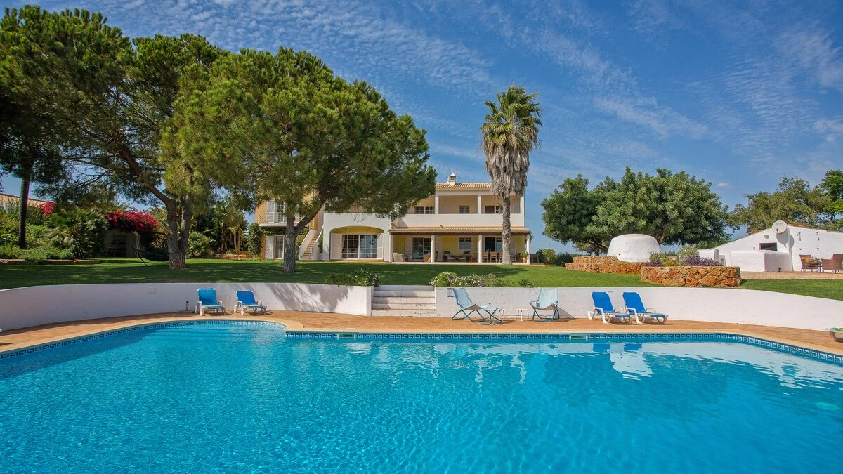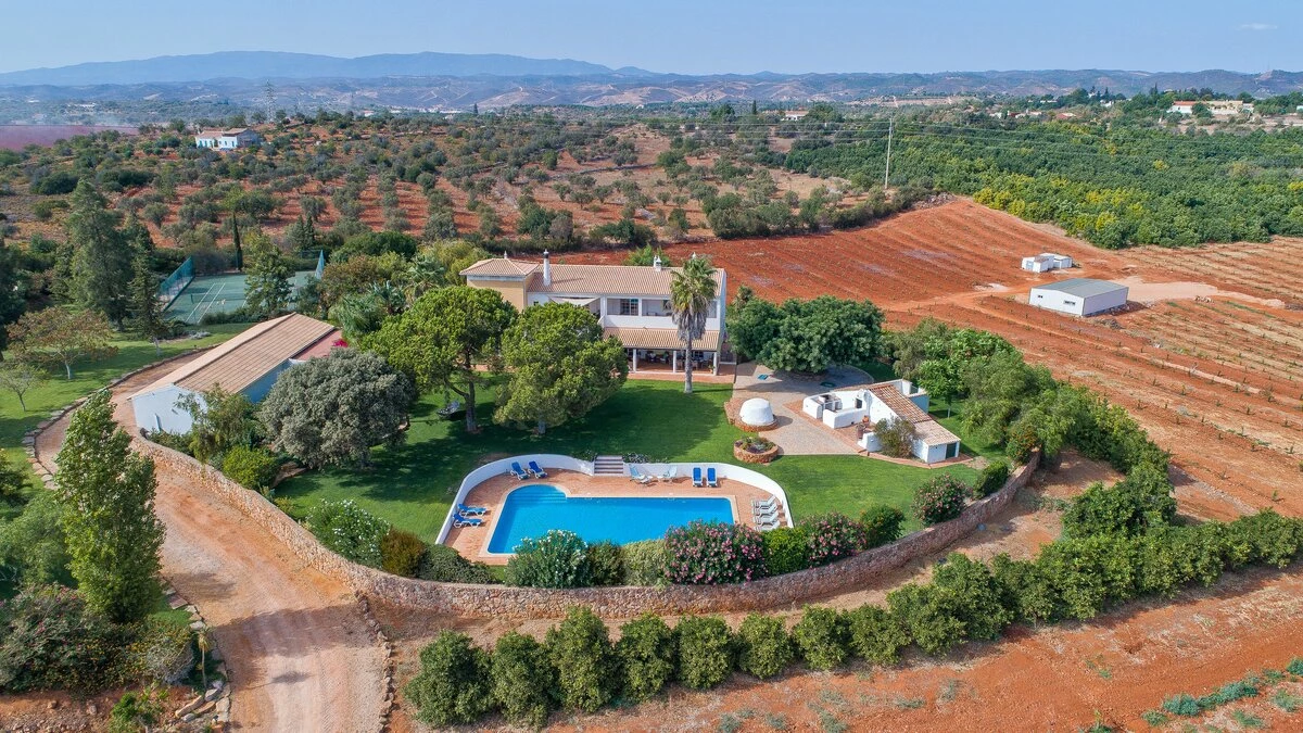 Basking, blissfully undisturbed, in its enviably unspoilt spot, this spacious villa has an all-encompassing atmosphere of relaxation, perfect for a family gathering or a group of friends. Set on a private 40 acre plot planted with avocado and citus trees, Nick Faldo's new Amendoeiras golf course is only a five minute drive away. Modern and comfortably furnished throughout, the villa’s six bedrooms are each en suite, air-conditioned and with under-floor heating beneath the rich chestnut wood boards. The hub of the house is its large living room, which opens on to a deep and long covered terrace. This acts as an al fresco sitting / dining room, looking out over lawns and the large heated swimming pool, to a timeless rural scene beyond.Within the walled gardens are clusters of trees for dappled shade, and a barbecue area artfully adapted from an old bread oven. Behind the house is a championship-size tennis court, where tennis coaching can be arranged and there is a shaded games area with table tennis and table football. The villa is a short drive from shops, banks and restaurants in historic Silves.This ancient Moorish castle town also hosts a number of different festivals during the summer and has an old cork factory which is now a museum and cultural centre, as well as housing a selection of good value and fun eateries and bars. The house is 10km from sandy beaches and there are several other beaches and towns within a short driving distance.