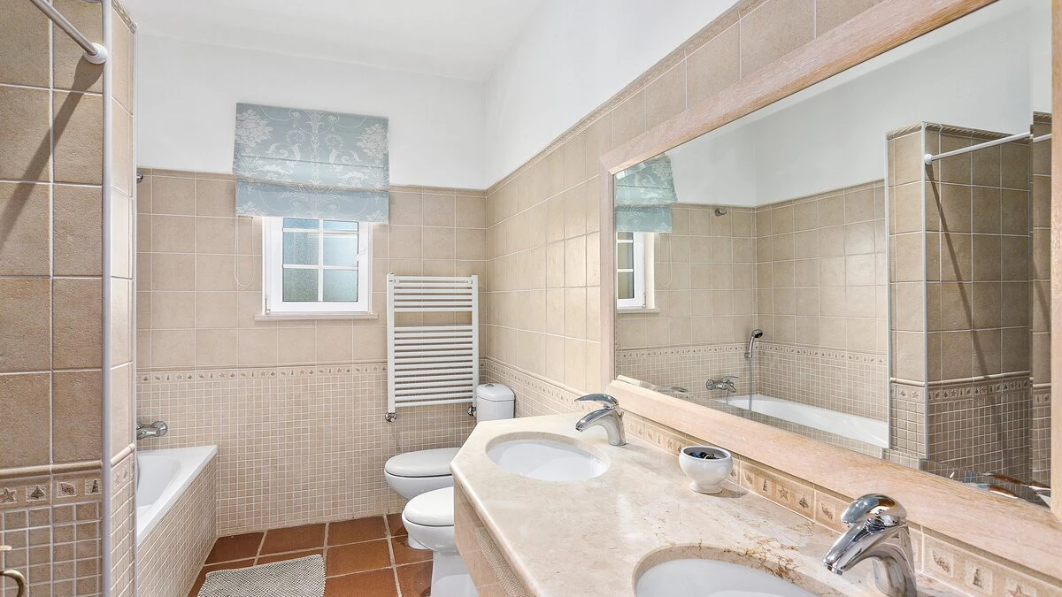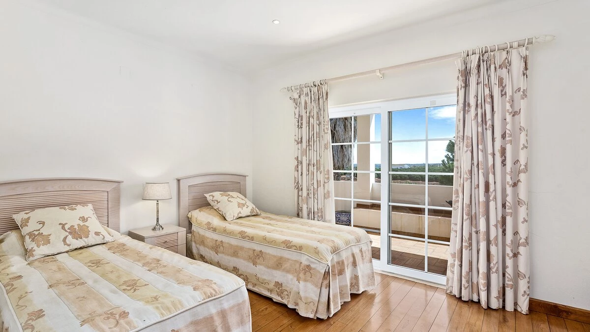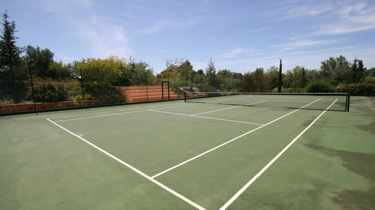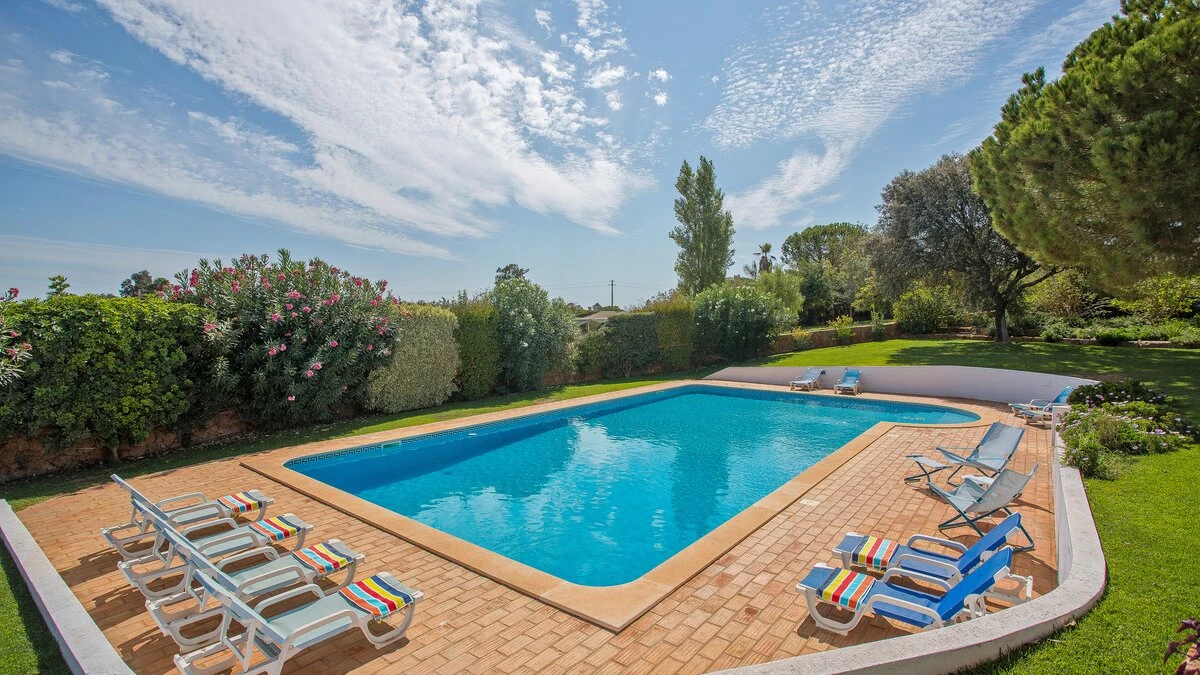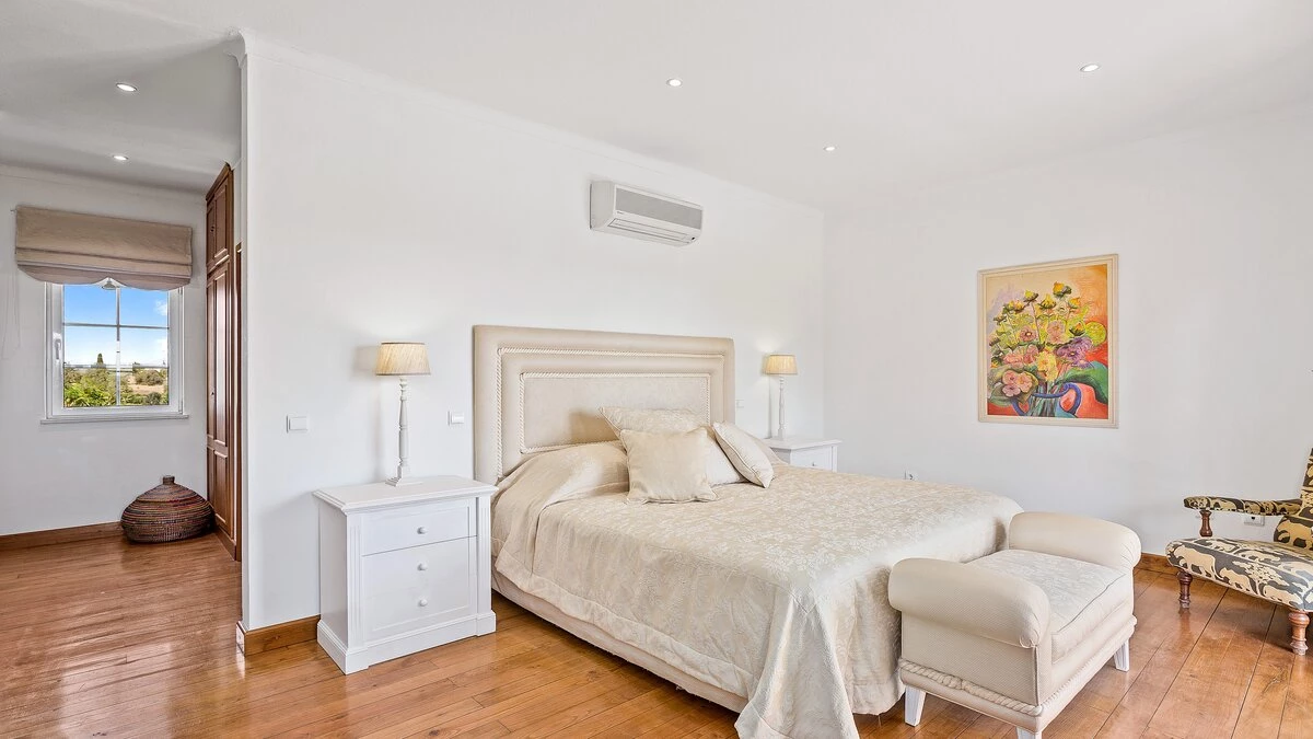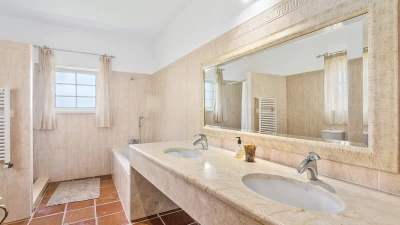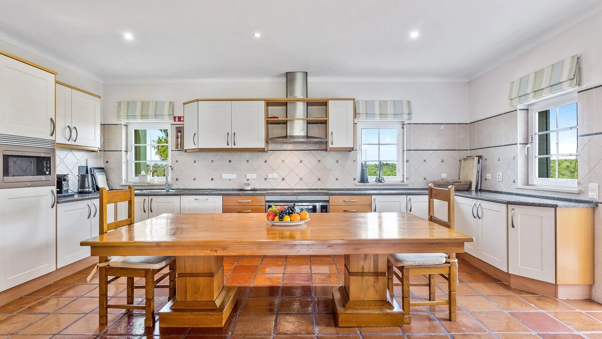 Basking, blissfully undisturbed, in its enviably unspoilt spot, this spacious villa has an all-encompassing atmosphere of relaxation, perfect for a family gathering or a group of friends. Set on a private 40 acre plot planted with avocado and citus trees, Nick Faldo's new Amendoeiras golf course is only a five minute drive away. Modern and comfortably furnished throughout, the villa’s six bedrooms are each en suite, air-conditioned and with under-floor heating beneath the rich chestnut wood boards. The hub of the house is its large living room, which opens on to a deep and long covered terrace. This acts as an al fresco sitting / dining room, looking out over lawns and the large heated swimming pool, to a timeless rural scene beyond.Within the walled gardens are clusters of trees for dappled shade, and a barbecue area artfully adapted from an old bread oven. Behind the house is a championship-size tennis court, where tennis coaching can be arranged and there is a shaded games area with table tennis and table football. The villa is a short drive from shops, banks and restaurants in historic Silves.This ancient Moorish castle town also hosts a number of different festivals during the summer and has an old cork factory which is now a museum and cultural centre, as well as housing a selection of good value and fun eateries and bars. The house is 10km from sandy beaches and there are several other beaches and towns within a short driving distance.