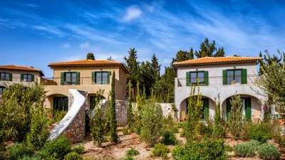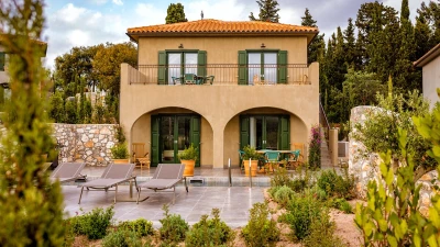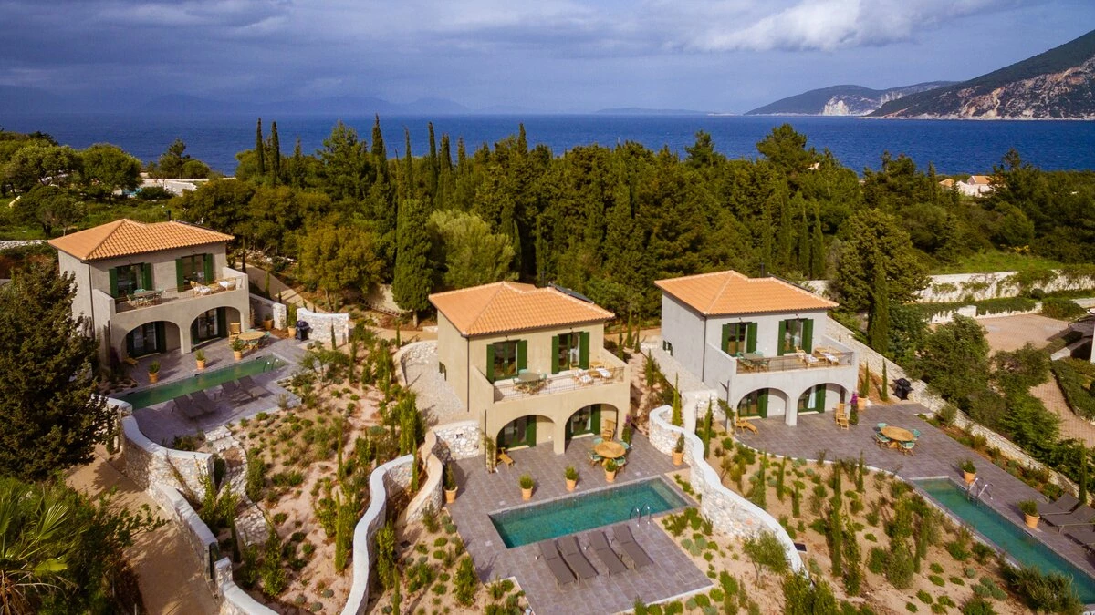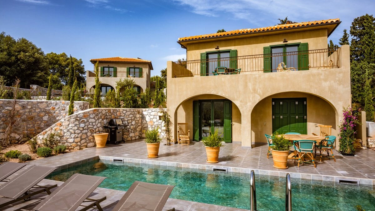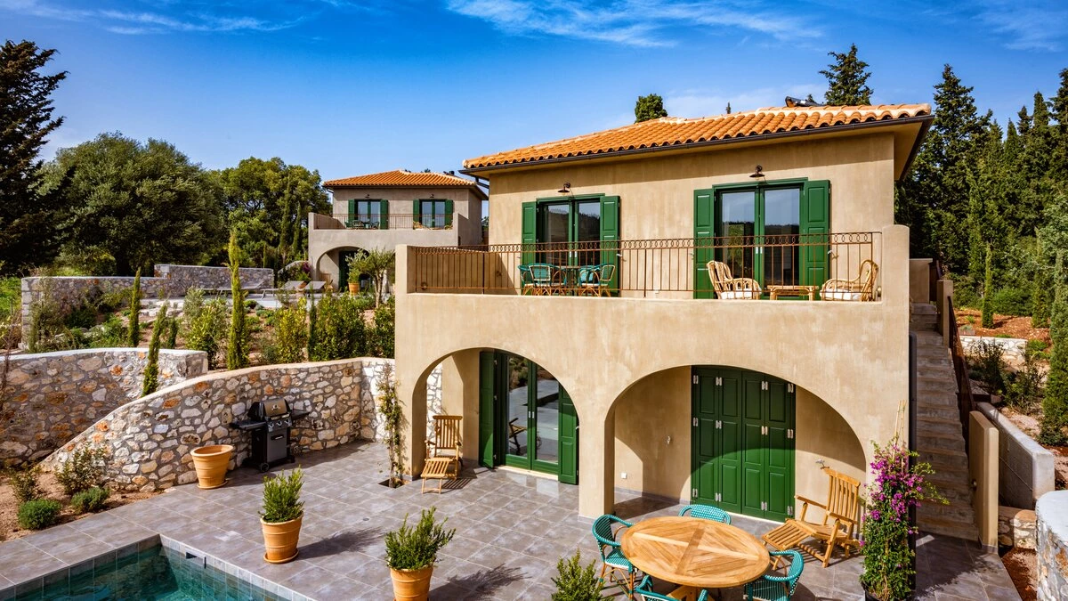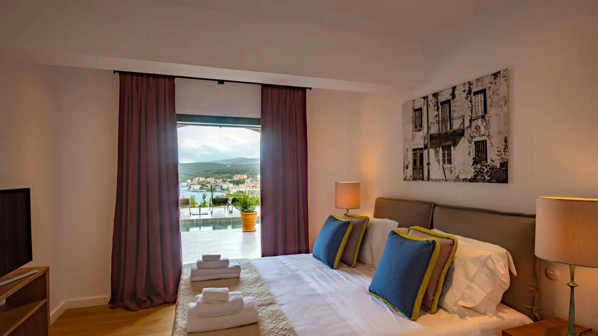 The charming views over Fiscardo harbour from Odele’s top terrace is one of the main highlights of this lovely villa and visitors will adore the proximity to the stylish Fiscardo restaurants and cafes. The owner of this property has taken care to ensure guests are well looked after and there are many added extras including a stocked fridge with breakfast items on arrival and replenished on request, a complimentary bar with a selection of spirits and bikes available to use for no extra charge. The villa is very well equipped and stylishly furnished with two large king size double bedrooms on the ground floor (each can be made up as a twin) with en suite shower rooms and access to the pool terrace. On the first floor an open plan living room, dining room and kitchen opens to a large terrace with stunning views out to the sea. Outside is a very attractive swimming pool and comfortable terrace with barbecue and herb garden (for guests to help themselves). Odele shares the estate with its sister villas, Merope and Fauna and is only five minutes’ walk (100m) from Fiscardo harbour and restaurants.