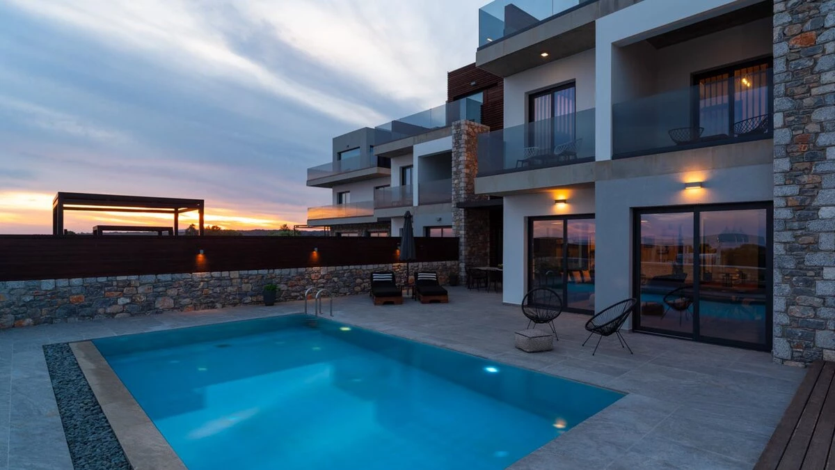 With its own pool, spa and fitness room complementing contemporary comfort, this luxury villa in Cre... -
