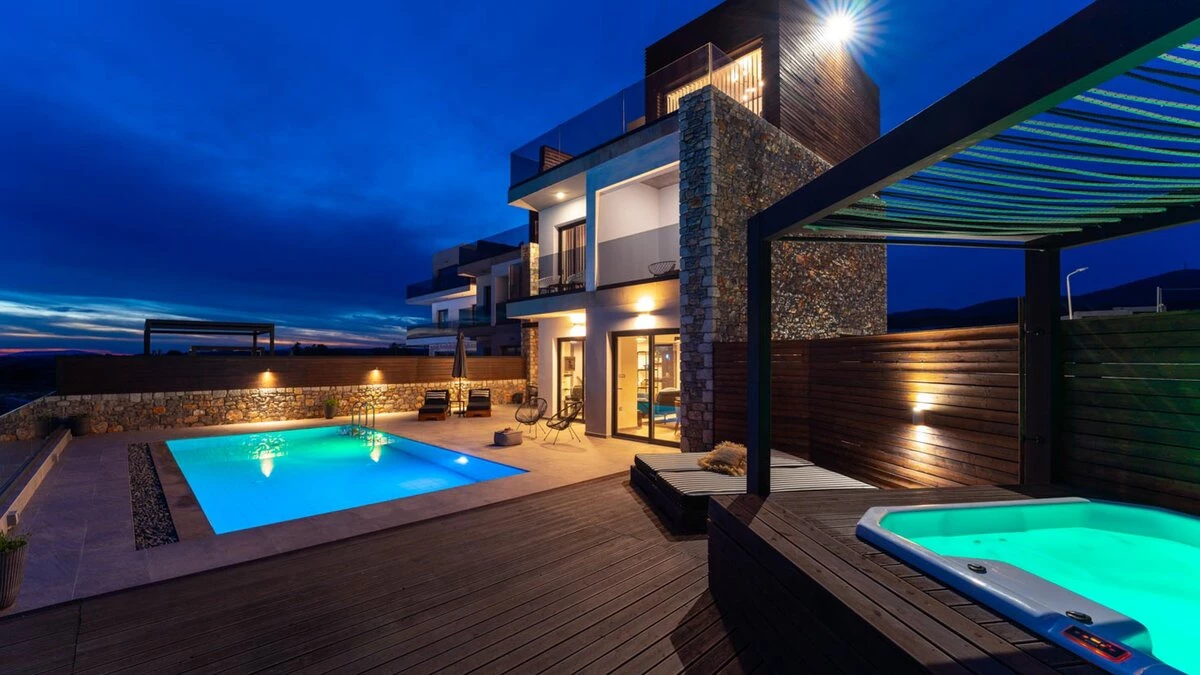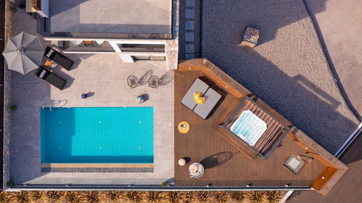 Outside, on the spacious terrace, you'll find a large swimming pool and heated Jacuzzi for cosy evenings under the stars. There's also a pergola with a dining table for leisurely lunches in the sunshine. The villa is less than 3km from beach bars, shops and tavernas, while local places of interest include Gennadi and Lachania.