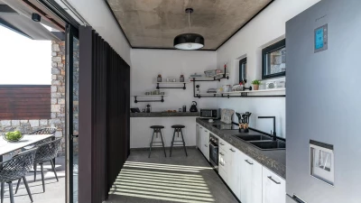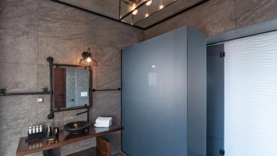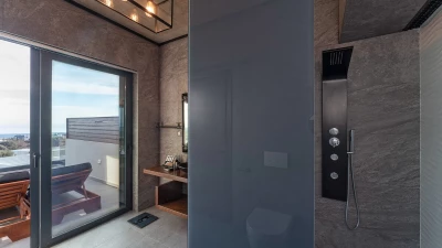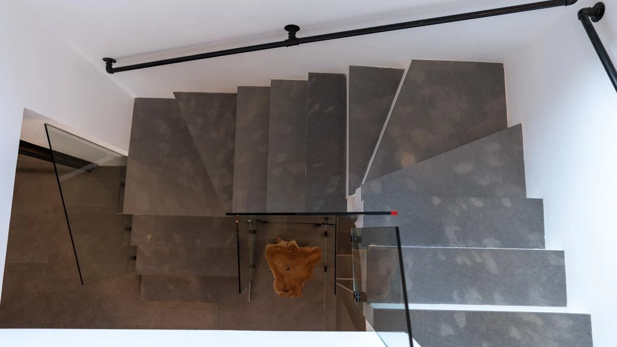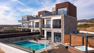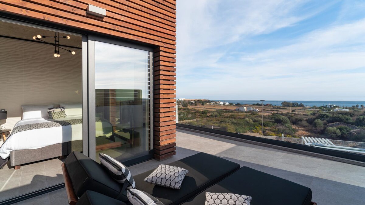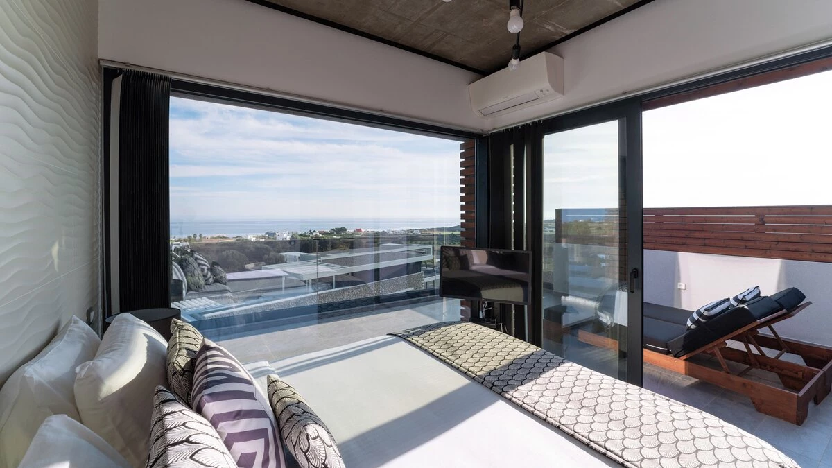 Ovio is a wonderfully stylish, three-floor property in Rhodes, designed with exceptional views overlooking the Aegean Sea. The entire villa is contemporary-industrial, showcasing concrete ceilings, unique metal fixtures and grey stone tiles. On the ground floor, guests will enjoy a fully-equipped kitchen, dining area and a lovely lounge area. Head up to the first floor to discover two large bedrooms, each furnished with a king size bed, alongside an over-sized bathroom with twin sinks and a walk-in shower. The top floor features the fabulous penthouse suite, complete with its own private bathroom and a large terrace with sunbeds and lounge chairs for basking in the sun.