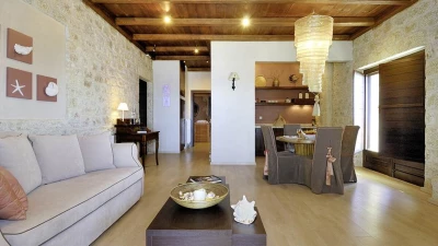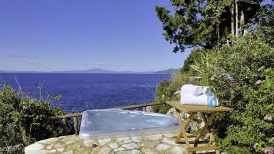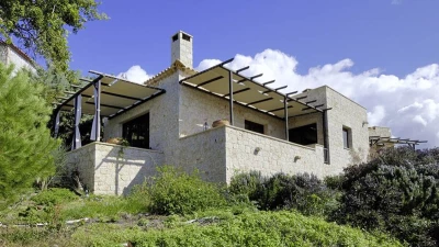 Peacefully positioned, and sharing its low headland setting with sister-villa Pelagia House, this single storey villa makes the most of its fabulous views with two furnished terraces overlooking the sea, and a private Jacuzzi on the cliff-edge, naturally screened with greenery. Within the villa, designed with Feng Shui in mind, a generously sized double bedroom opens on to the sea view terrace, the inviting bathroom comes complete with hydro-massage bath and shower, and the spacious sitting / dining room adjoins a small kitchen and has dual aspect glass doors to both terraces. Furnished throughout with effortless elegance, its cool and calming décor includes bare stone walls and natural timber, producing an air of serenity and earning plaudits for the villa in design magazines. Rock bathing just below Pelagia Cottage may be ideal for an early morning dip, and for water’s edge walks along the sands, the beach of Stoupa is a stroll away, as are resort facilities in unsophisticated Stoupa village.