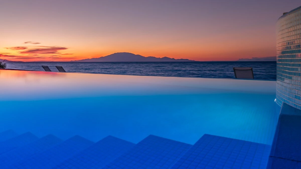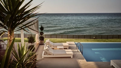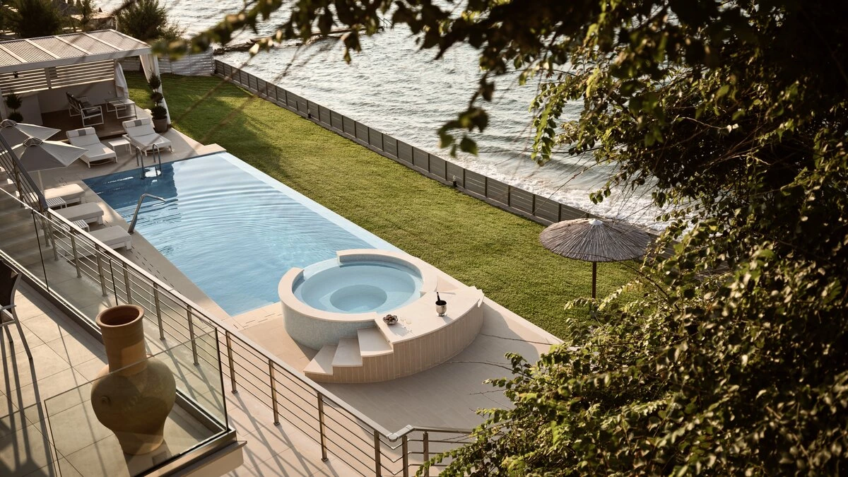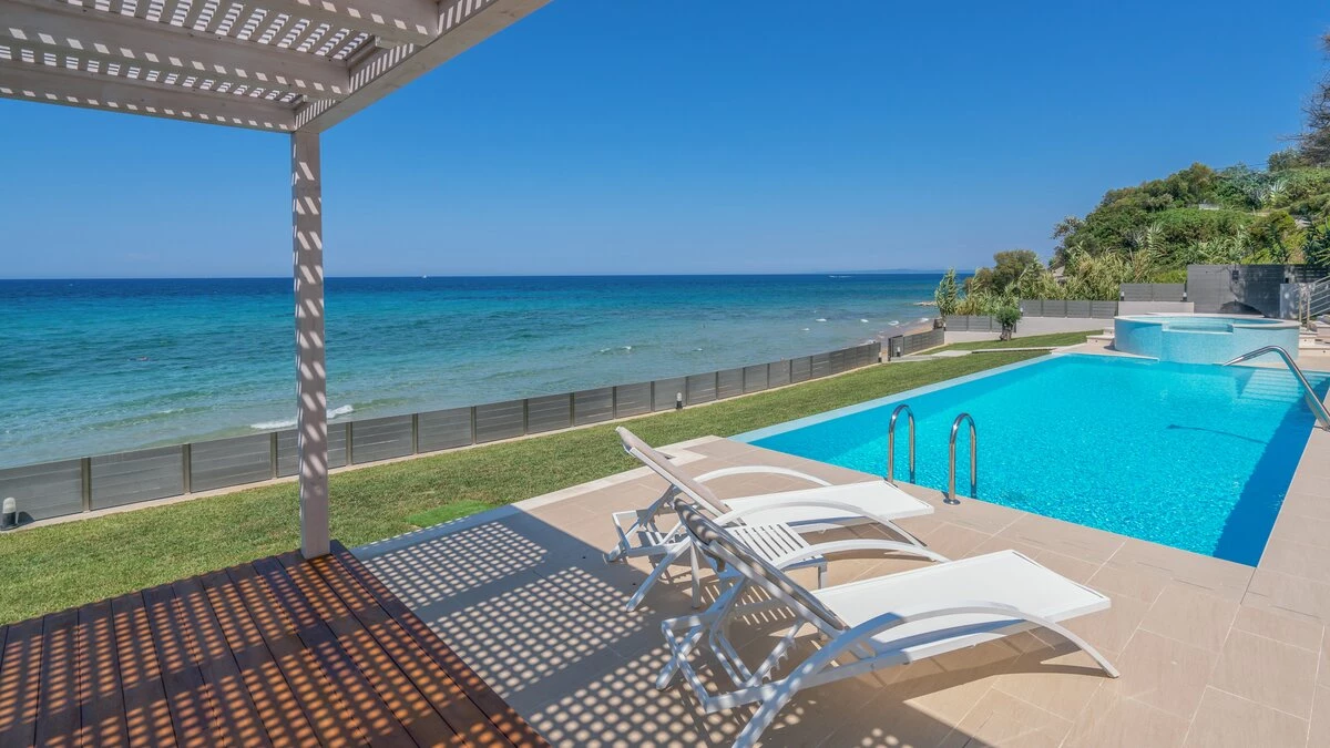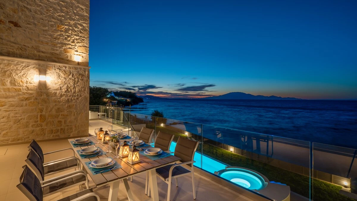 Indulge in complete relaxation at this lovely beachfront villa in Tragaki, found beside a quieter golden stretch of Ampula Beach. A gorgeous stone exterior instantly attracts attention; contrasted against the deep rich blues of the Ionian seascape behind, this villa is a serious eye-catcher. You're just a five-minute drive from the shops and supermarket of nearby Tsilivi, but it's all about the glorious sense of peace and tranquility here. Positioned just steps from the sand, the oceanfront infinity pool drinks in sensational views of the Peloponnese coastline and Kefalonia Island. This is the place to just flop and unwind - there's loungers and shaded spots for seriously lazy days, plus a children's play area, Jacuzzi and bar area for the best sunset-accompanying aperitifs. The villa inside is a stylish combination of contemporary design and traditional architecture, with muted but neutral hues making this an elegant space to escape into. The villa's entrance is on the first floor and leads into a large open-plan lounge complete with a dining area, cosy living room and fully-equipped kitchen. For the hot and humid Greek summers, there's another good-sized dining table on the oceanfront terrace. There are four spacious bedrooms within the main villa - three of which are downstairs on the ground floor. Each one includes a private en suite shower room, and also access to a separate veranda overlooking stunning views of the sea. Adjacent to the villa, a self-contained studio includes a fifth double bedroom, private shower room and a small kitchenette.