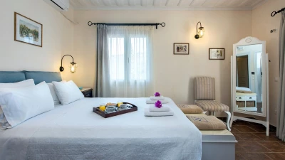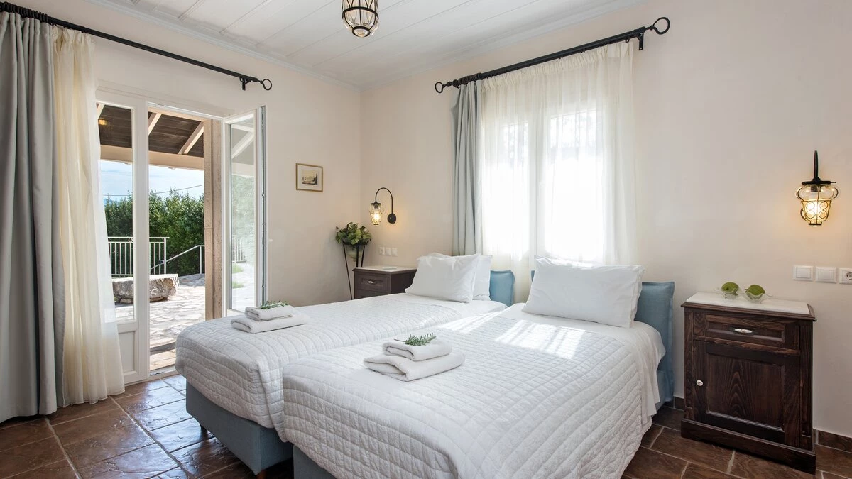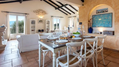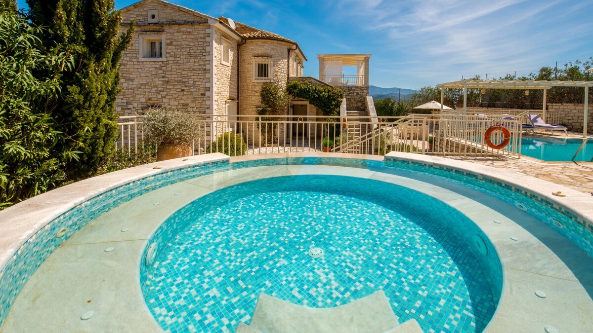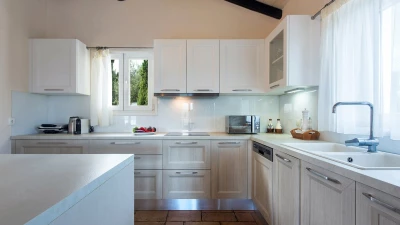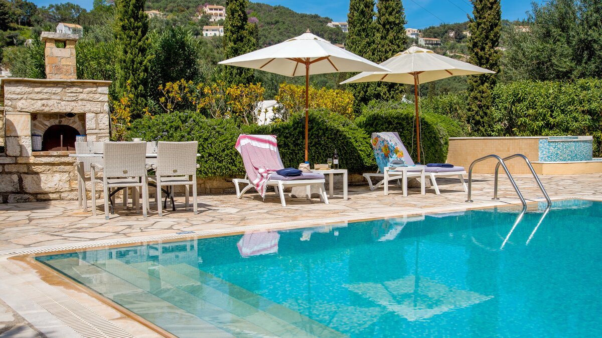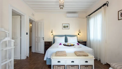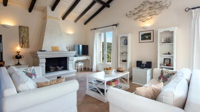 Quietly positioned on a wooded hillside behind the village, this comfortable family villa is a five minute walk from St Stephano’s beach, and even closer to its shops, bars and waterfront tavernas. Recently refurbished in a cool neutral colour palette, it is an ‘upside-down’ house, with its living space on the upper floor to enjoy the gorgeous views, and its three air-conditioned bedrooms sharing the ground level. Within the villa, décor and furnishings are an unpretentious country style, complemented by mod cons including WiFi and large screen satellite TV. Outside, an open terrace is accessed from the sitting room, perfect for al fresco dining, with views over the rooftops to the bay below. An exterior staircase leads down from here to a stone-paved terrace, where the inviting pool shares the space with a separate Jacuzzi and a built-in barbecue. At the other end of the house, an olive tree casts dappled shade onto a little seating area overlooking the sea. While Petrino echoes the relaxing air of it setting, it is well placed to up-the-tempo locally, with nightlife in Kassiopi just 5km away.