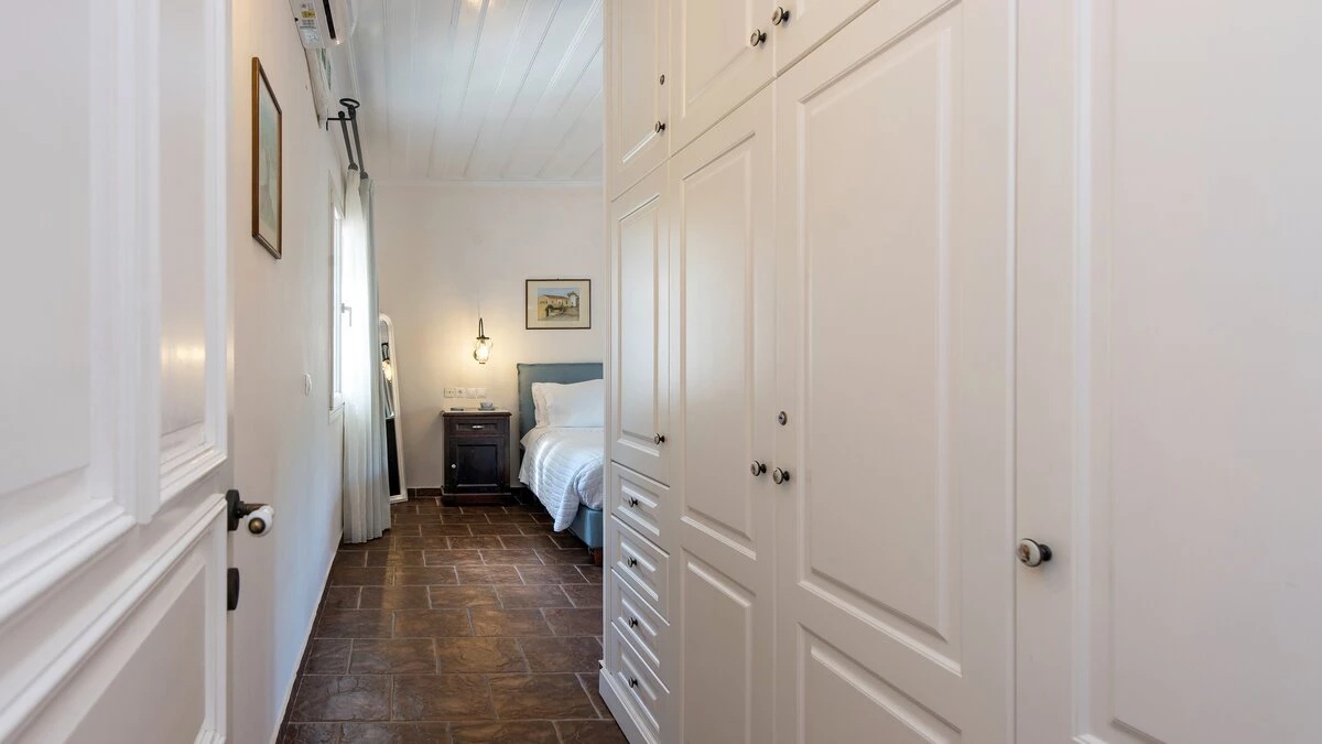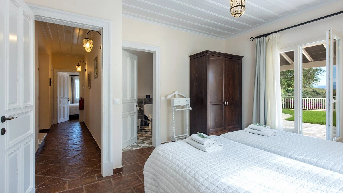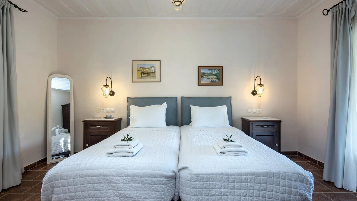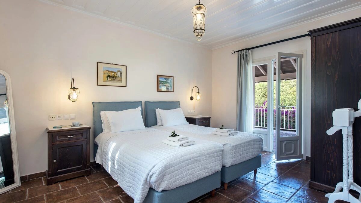 Quietly positioned on a wooded hillside behind the village, this comfortable family villa is a five minute walk from St Stephano’s beach, and even closer to its shops, bars and waterfront tavernas. Recently refurbished in a cool neutral colour palette, it is an ‘upside-down’ house, with its living space on the upper floor to enjoy the gorgeous views, and its three air-conditioned bedrooms sharing the ground level. Within the villa, décor and furnishings are an unpretentious country style, complemented by mod cons including WiFi and large screen satellite TV. Outside, an open terrace is accessed from the sitting room, perfect for al fresco dining, with views over the rooftops to the bay below. An exterior staircase leads down from here to a stone-paved terrace, where the inviting pool shares the space with a separate Jacuzzi and a built-in barbecue. At the other end of the house, an olive tree casts dappled shade onto a little seating area overlooking the sea. While Petrino echoes the relaxing air of it setting, it is well placed to up-the-tempo locally, with nightlife in Kassiopi just 5km away.