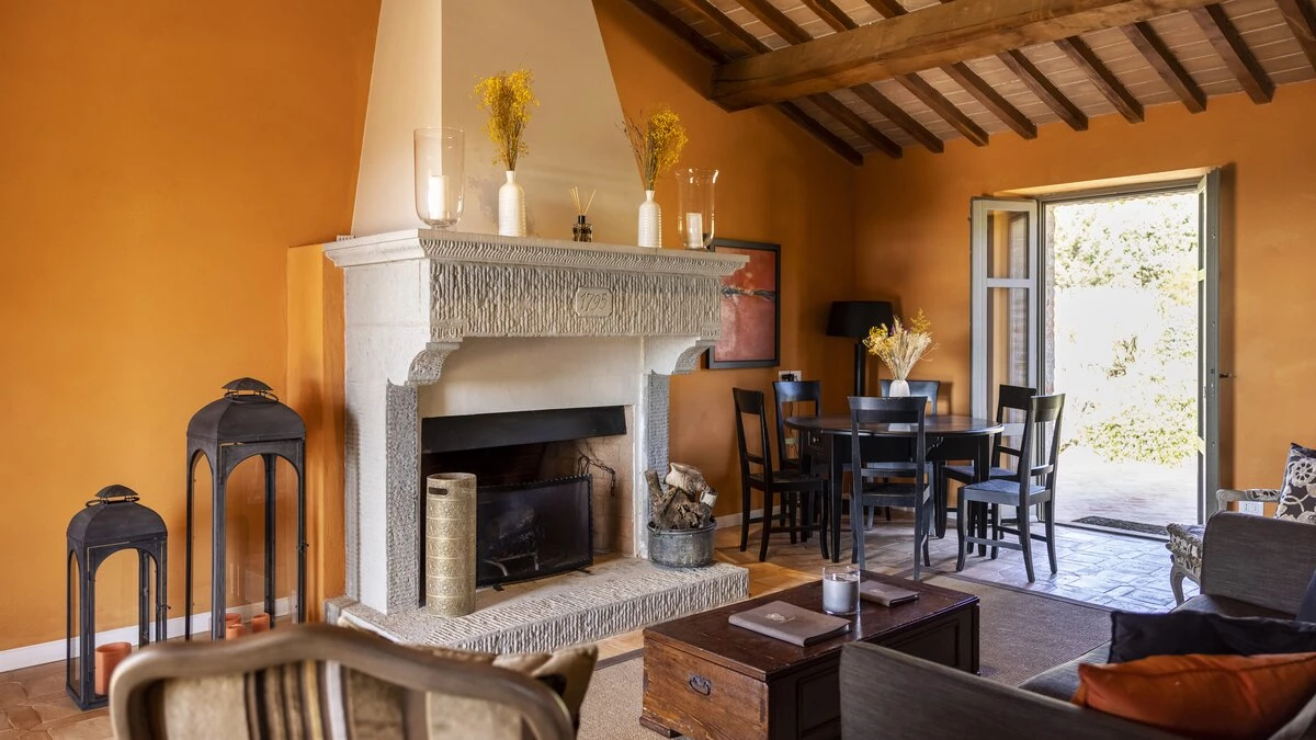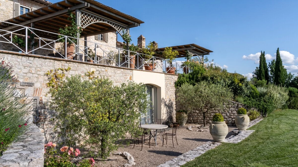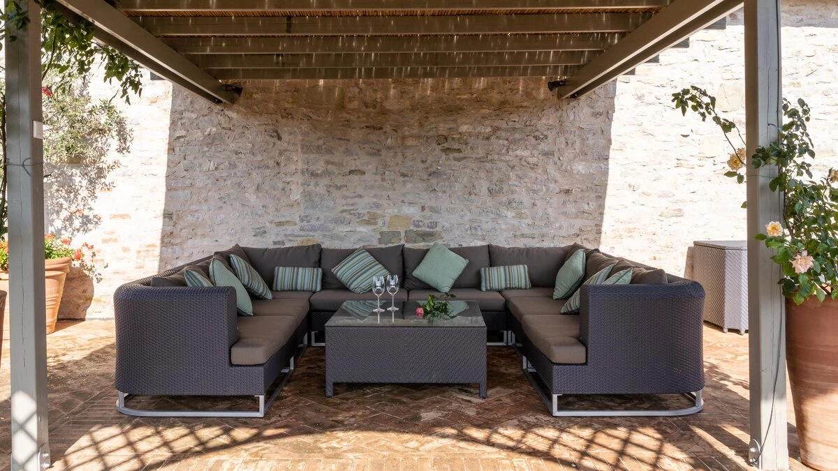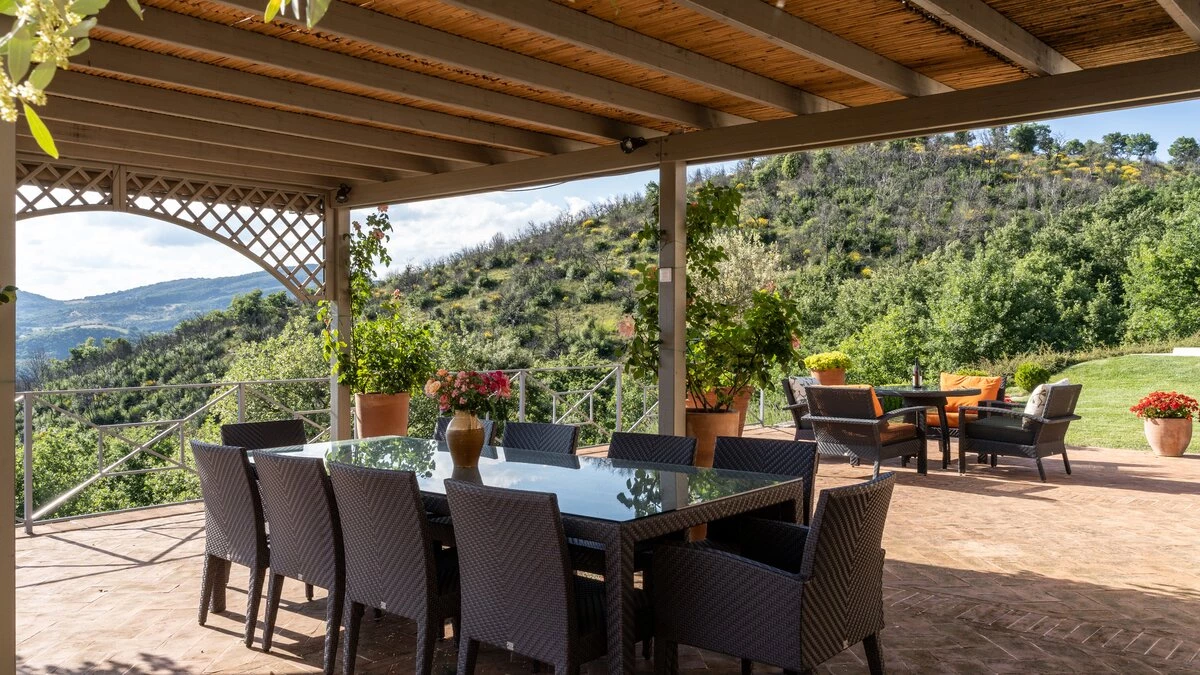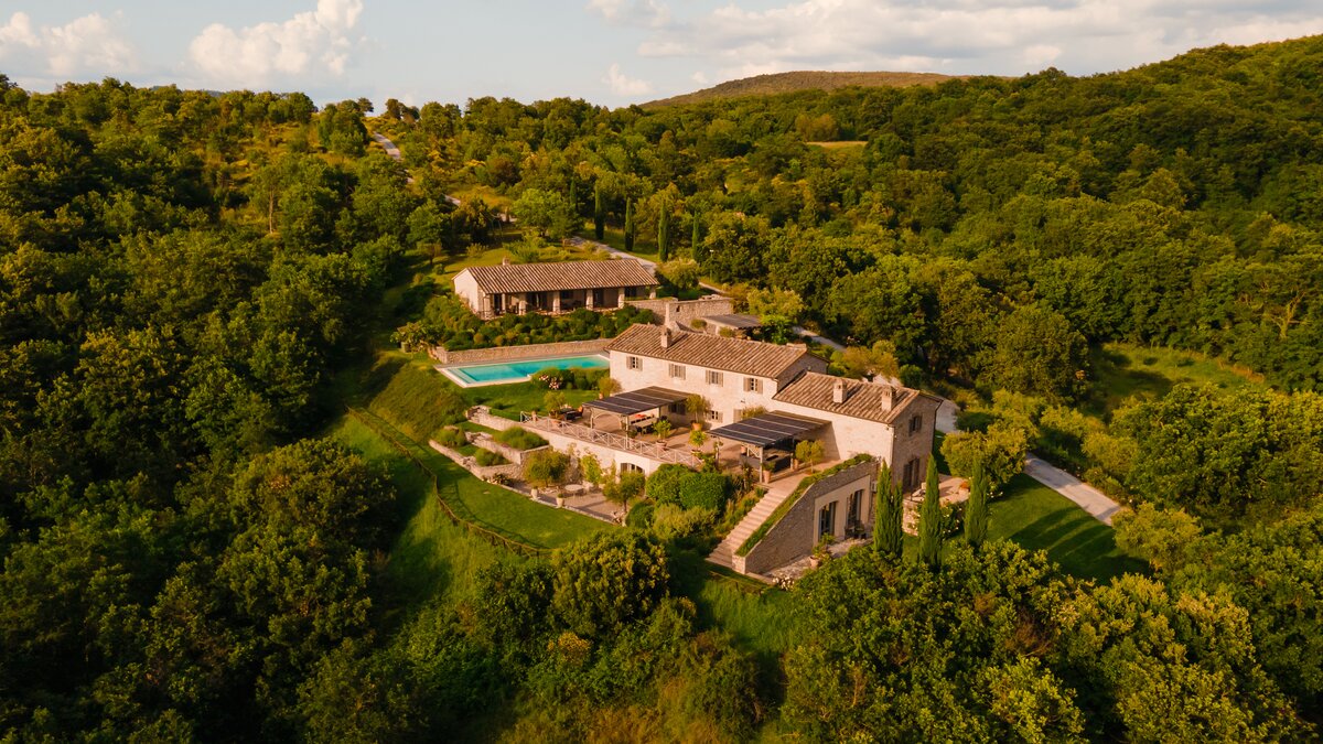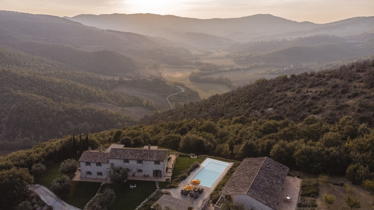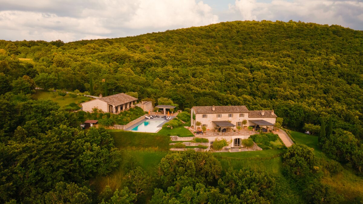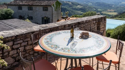 In an exceptional location on the border of Umbria and Tuscany, Podere Montefelice is a show stopping villa for up to 14 guests. The location of this house is hard to beat and whilst it feels perfectly secluded, Antognolla Golf Club House and Restaurant is just 3km away, while further amenities in San Giovanni del Pantano are just 7 minutes away by car. Inside the house is handsome and spacious with accommodation split between three floors. The ground floor comprises a well-equipped country style kitchen, a formal dining room and a comfortable sitting room with an open fireplace and wood-beamed ceilings, which opens onto the gardens. Outside a vast terrace spans the length of the house, with a shaded area for al fresco dining while enjoying the view.