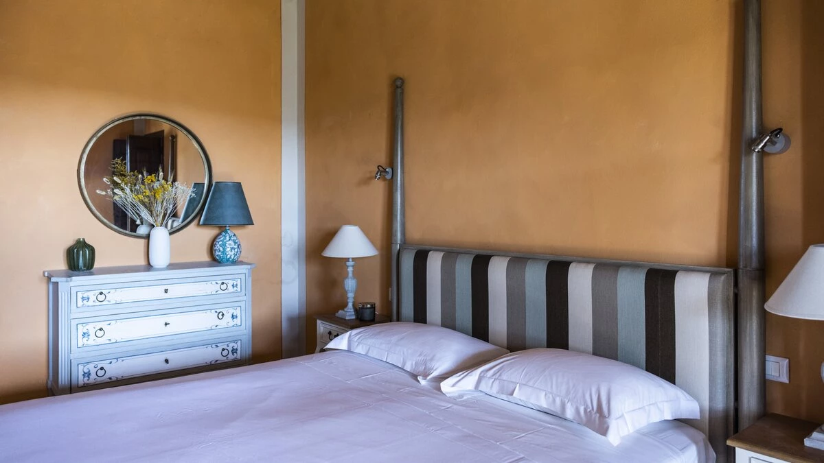 Up on the first floor there is one en suite double bedroom and the master suite, which features an inviting freestanding bath tub. The lower ground floor comprises a further double bedroom, which opens to the garden and a twin bunk room that’s perfect for children; a shower room completes this floor. The beautifully decorated pool house in burnt orange hues is fantastic for groups of friends travelling together, as there is further accommodation for four guests between two en suite bedrooms, a living room and a kitchen opening to the gardens.