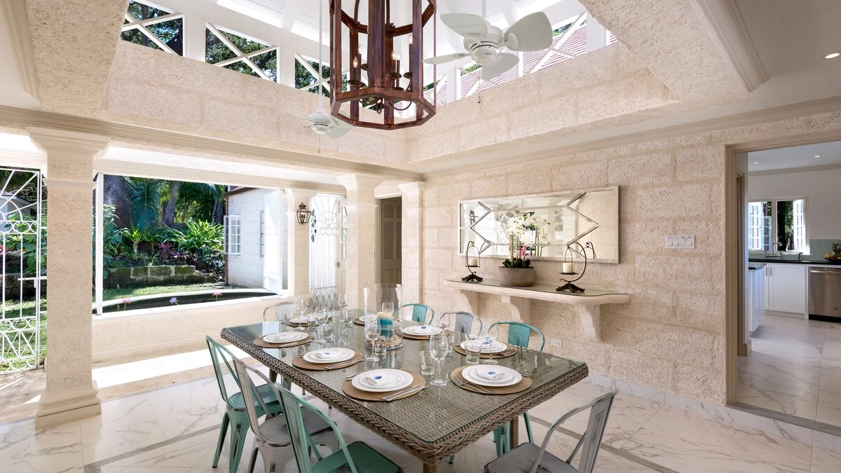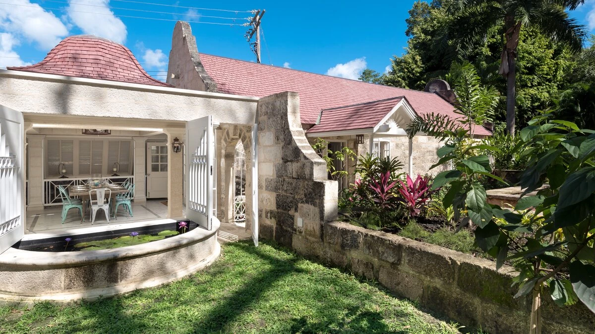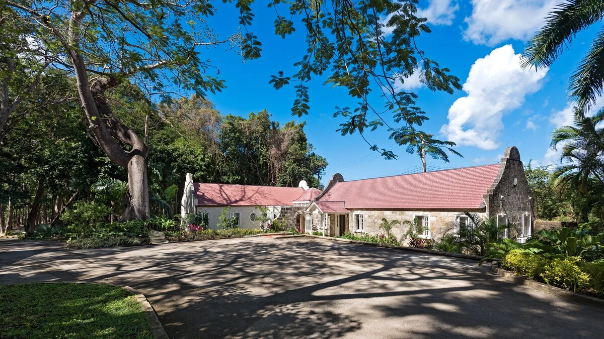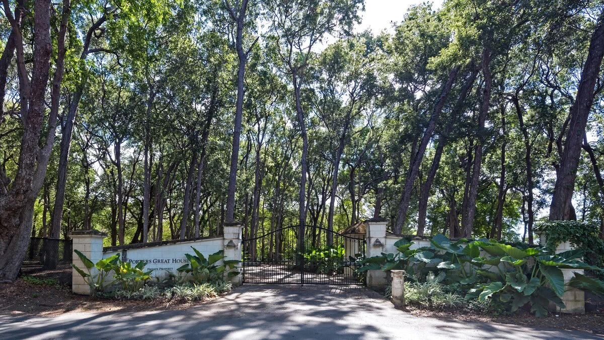 Perfectly picturesque Porters Villa is a remarkable property with very spacious rooms and set in a small private estate in very extensive lawned gardens. The villa is a one-storey retreat with an authentic wing that features coral stone and the original architecture on the exterior, as well as a modern wing that was more recently added to create a more spacious home. A sunken entry off an extensive front driveway and garden with mahogany trees bids welcome to a cozy yet chic and contemporary interior. The original wing of the home comprises the master suite and the living room, both of which have tiled floors and large windows that create a vibrant, sunlit ambience. The master features a king bed, air conditioning and a fan, as well as an en-suite bathroom with a single vanity, a glass-walled shower and a secondary entrance that leads into a hallway with a large wardrobe. The master also offers views of the villa's lush gardens and driveway.The living room is a comfortable area in which to relax complete with calming, modern décor, a large comfy settee, a study table and cable television. The living room then opens to the newer wing of the home, which includes the dining room, kitchen and the remaining two bedrooms. The dining area is the pièce de resistance of the home, with quasi-rustic décor including a large metalwork chandelier, marble floors and a semi-open-air ambience thanks to its open design that flows into a small garden. It features a wall designed entirely of wooden shutters, and then it opens and flows directly onto the corridor that leads to the other two bedrooms in one direction, and to the villa's entrance in the other direction. This corridor's design features a wrought iron gate wall, which leads out into a small garden with a small, elevated lily pond. Elsewhere within the incredible gardens there is a fantastic pool and adjacent covered terrace area, furnished for dining and relaxing with its very own bar and a separate small gym. There is also a chapel. The beach adjacent to Colony Club Hotel and a French bakery is within walking distance. A fantastic choice for those seeking a very comfortable and private property.