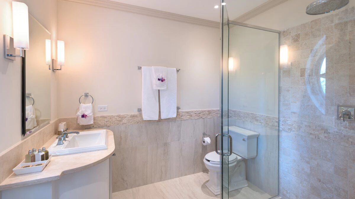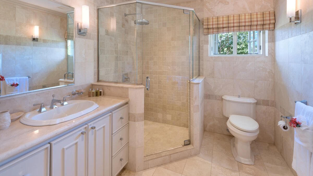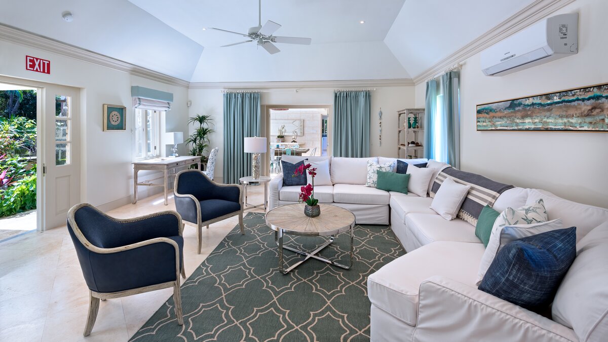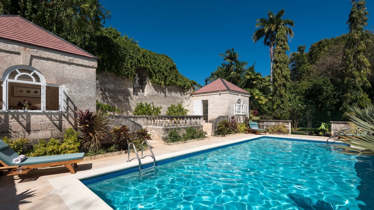 Perfectly picturesque Porters Villa is a remarkable property with very spacious rooms and set in a small private estate in very extensive lawned gardens. The villa is a one-storey retreat with an authentic wing that features coral stone and the original architecture on the exterior, as well as a modern wing that was more recently added to create a more spacious home. A sunken entry off an extensive front driveway and garden with mahogany trees bids welcome to a cozy yet chic and contemporary interior. The original wing of the home comprises the master suite and the living room, both of which have tiled floors and large windows that create a vibrant, sunlit ambience. The master features a king bed, air conditioning and a fan, as well as an en-suite bathroom with a single vanity, a glass-walled shower and a secondary entrance that leads into a hallway with a large wardrobe. The master also offers views of the villa's lush gardens and driveway.The living room is a comfortable area in which to relax complete with calming, modern décor, a large comfy settee, a study table and cable television. The living room then opens to the newer wing of the home, which includes the dining room, kitchen and the remaining two bedrooms. The dining area is the pièce de resistance of the home, with quasi-rustic décor including a large metalwork chandelier, marble floors and a semi-open-air ambience thanks to its open design that flows into a small garden. It features a wall designed entirely of wooden shutters, and then it opens and flows directly onto the corridor that leads to the other two bedrooms in one direction, and to the villa's entrance in the other direction. This corridor's design features a wrought iron gate wall, which leads out into a small garden with a small, elevated lily pond. Elsewhere within the incredible gardens there is a fantastic pool and adjacent covered terrace area, furnished for dining and relaxing with its very own bar and a separate small gym. There is also a chapel. The beach adjacent to Colony Club Hotel and a French bakery is within walking distance. A fantastic choice for those seeking a very comfortable and private property.