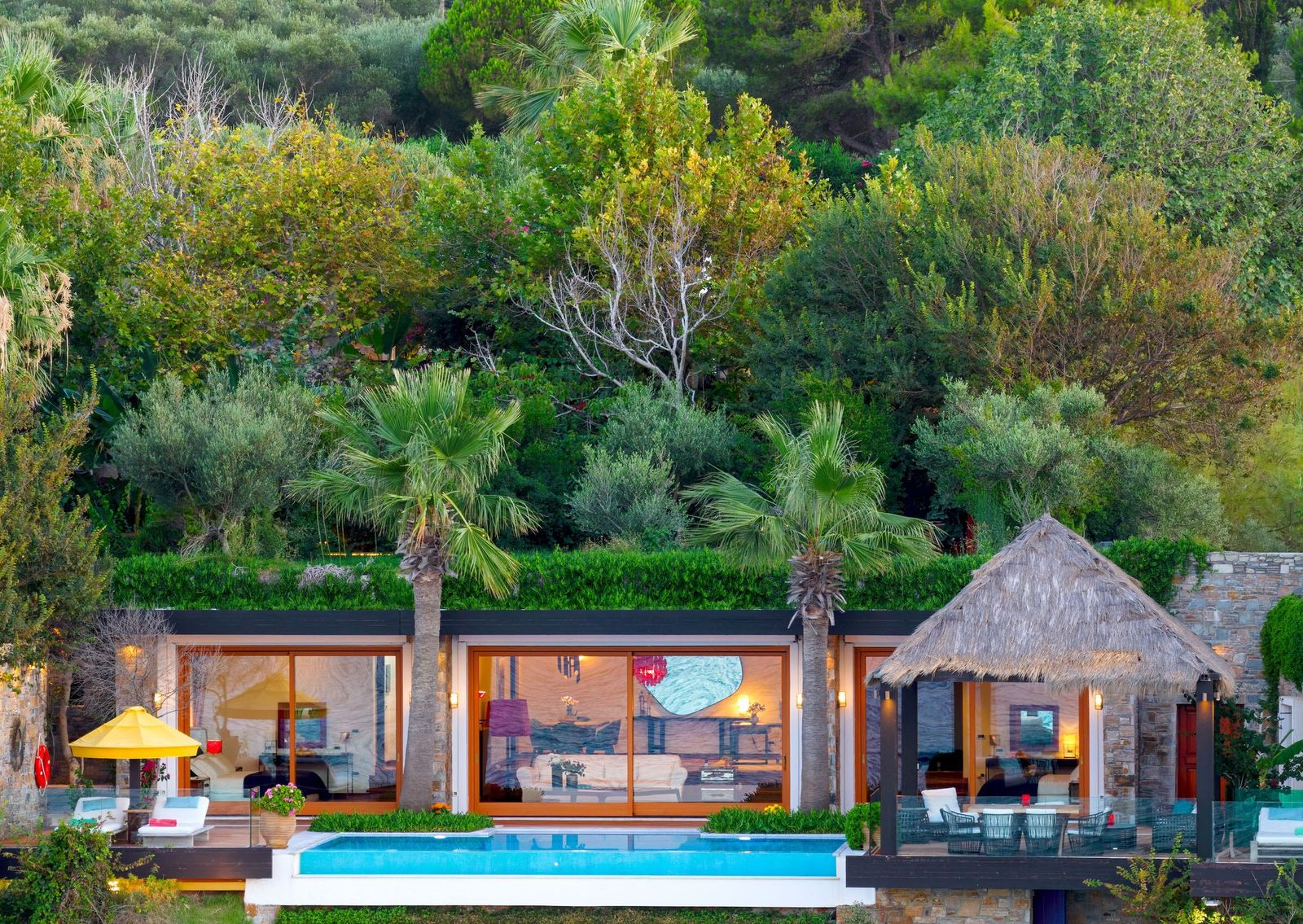 Everything offered in the Deluxe Spa Villa plus large panoramic glass doors leading to a private deck, temperature controlled pool, garden with sunbeds and teak dining furniture.