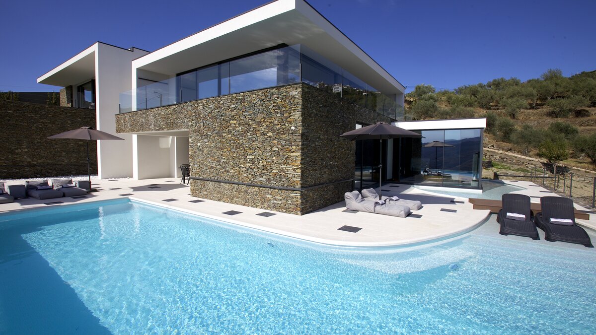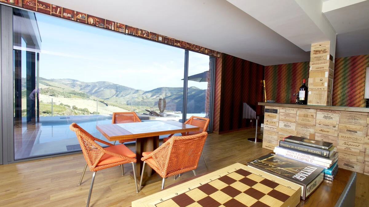 An unique holiday villa, Quinta Matilde is surrounded by 8,000 square metres of land and all the 4 en-suite double bedrooms as well as the social areas, have been designed to enjoy the very special landscape and views over olive trees and vineyard terraces, sloping all the way down to the river Douro. Slate (local to the Douro), glass and wood have been used for the contemporary interiors; and its fitted with air-conditioning for those very hot Douro summer days, as well as central heating and fireplaces for off-season , making it suitable for year round rentals. And while the gracious and accommodating staff prepare fantastic daily breakfasts as well as other meals on request, the panoramic terraces are perfect for “al fresco” meals. Then in the evenings, the outlook from the swimming pool and the Jacuzzi transforms into something quite magical – whilst the pool is flood-lit, the Jacuzzi’s ceiling is all lit-up with tiny stars and you look out onto to the faint twinkling lights of distant villages.  A very spacious games room includes a pool table, a piano and a bar. There is also an outdoor chill-out area amidst vineyards and olive trees, providing the ideal set up for a private wine tasting (on request) or just somewhere to relax the hours away, with a book and a glass of port in your hand.