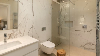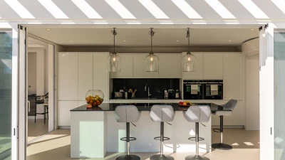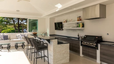 Outside, on a raised terrace there is an idyllic seating area and an outdoor al fresco area complete with a dining table, breakfast bar and food prep area with a wine chiller, drinks fridge and barbecue, perfect for entertaining. Further down some steps, guests can find the infinity style pool and surrounding gardens.