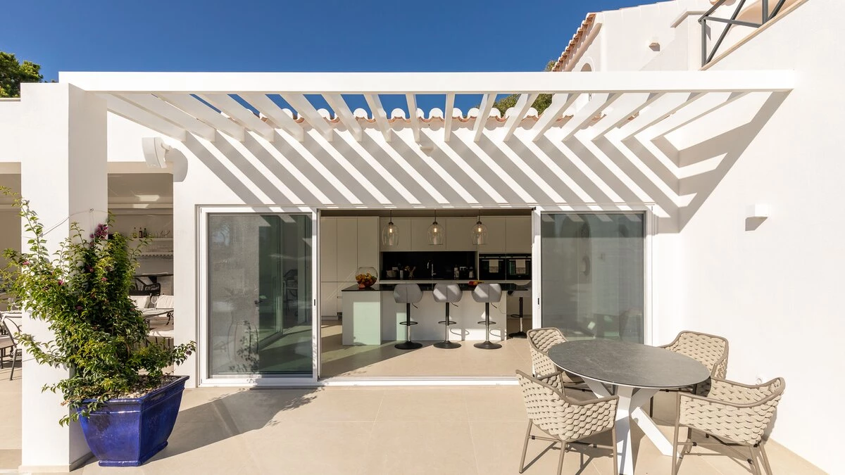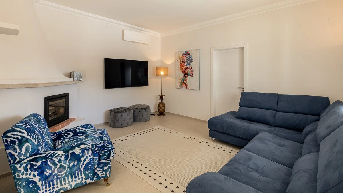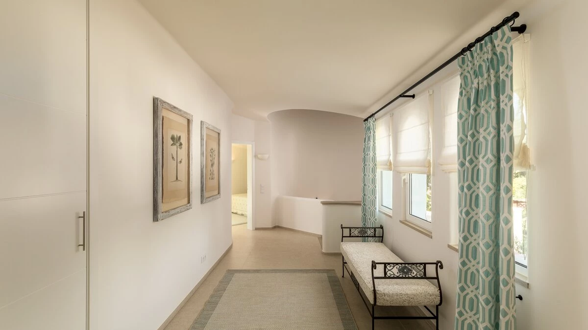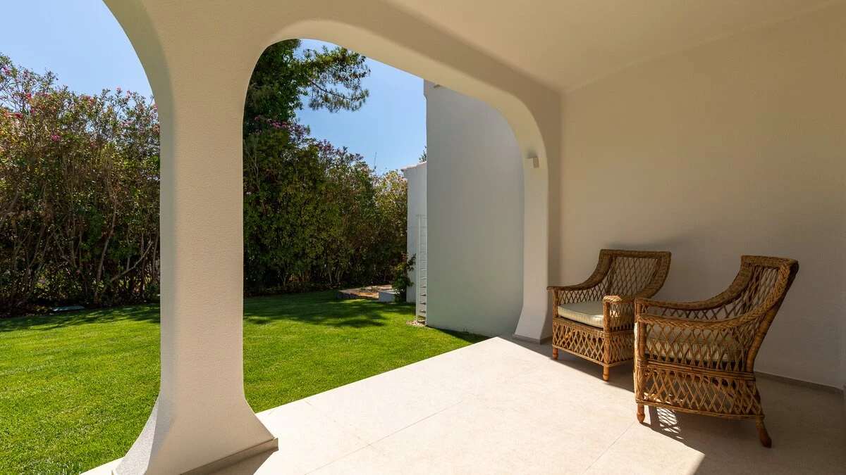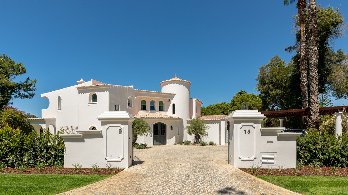 As you approach the villa through the private gates, make your way to the Portuguese villa ahead, nestled between greenery and blue skies.