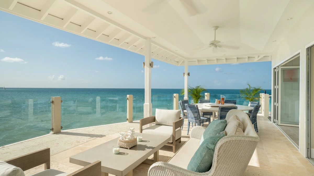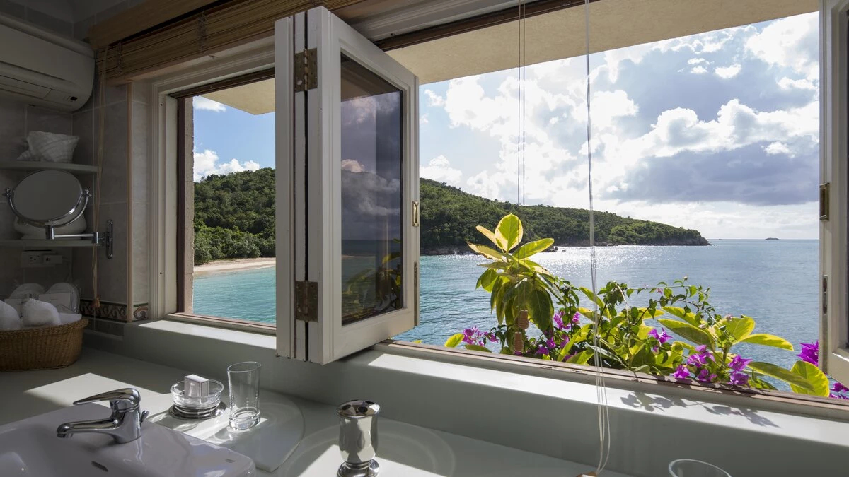 Inside the main house, there is a living, dining room. This space has exemplary furnishings; with a Caribbean beach style in mind and bounds of natural light from the incredible wide bifold doors that lead out to the outdoor terrace, so sea views can be admired from both inside the villa and out. Furtheron, there is a double bedroom with direct access to the pool terrace and en suite, complete with an opulent free standing bath.