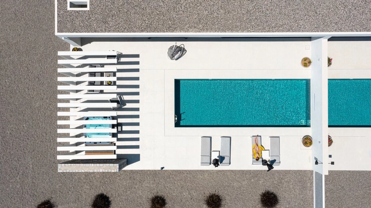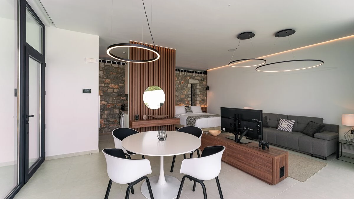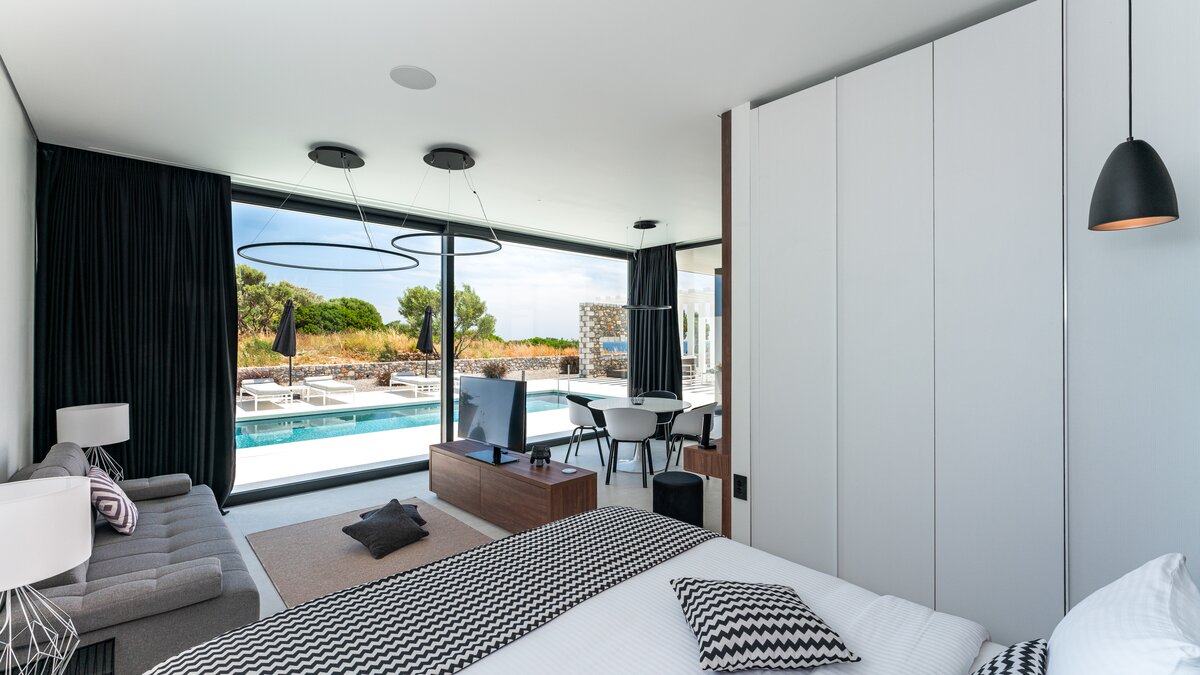 Rodos Blu is a stunning one bedroom villa, designed especially for couples seeking a romantic escape in Rhodes. The villa includes a king-size bed, fully-equipped kitchen space, and a uniquely designed bathroom with floor-to-ceiling glass panels. In the same space is a dining and living area, with a large TV that offers Netflix and PlayStation. What makes this villa so unique are the large glass windows which offer uninterrupted views of the surrounding area and pool terrace.