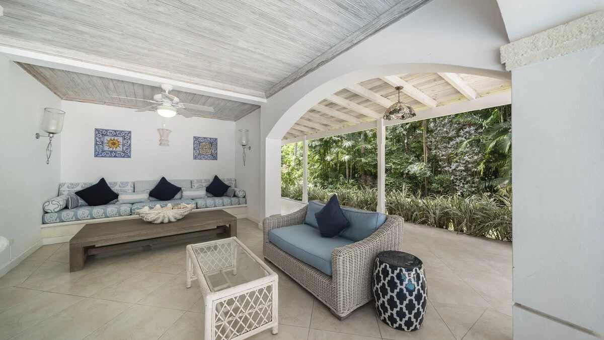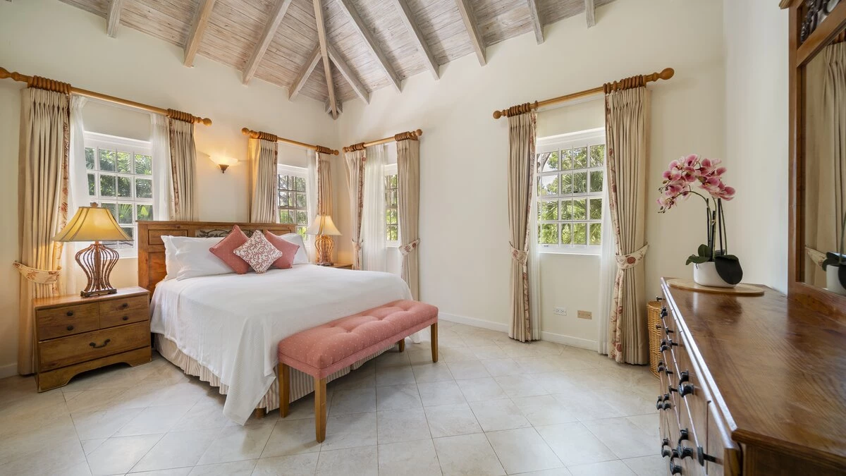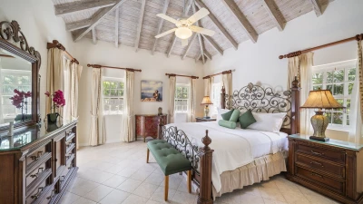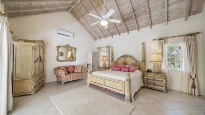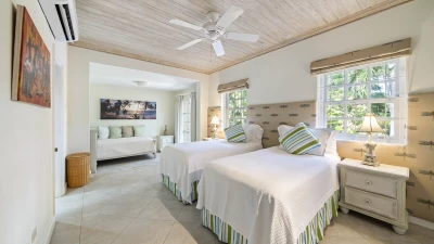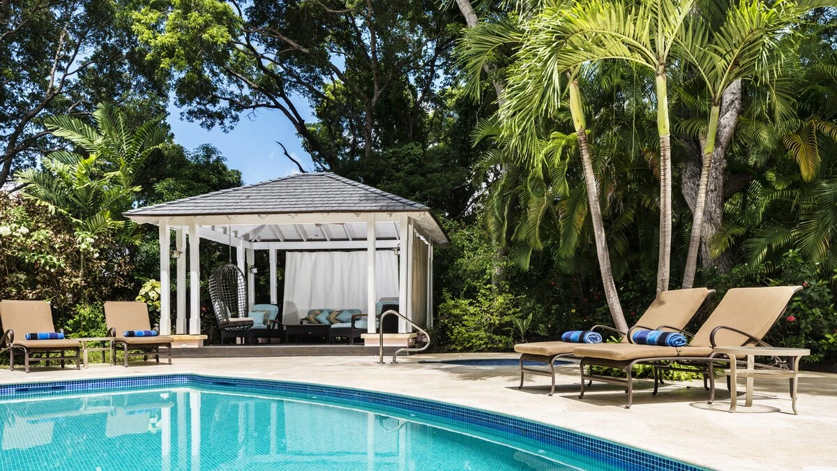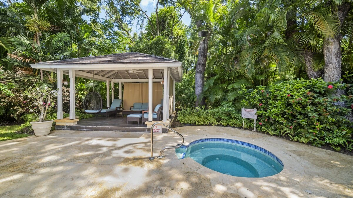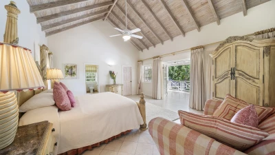 Sandalwood House, perfectly secluded in its extensive gardens, provides an incredibly tranquil holiday experience. Whether you’re tanning on the pool deck, splashing in the pool, soaking in the Jacuzzi, or enjoying a stroll around the golf course accessed from the garden, you’re sure to experience total relaxation. The covered terrace with lounge and dining area, the pool deck with comfortable loungers, and the gazebo all provide ample choices for outdoor living. Sandy Lane beach is only a 10 minute walk away, and here you’ll find a private cabana with sun loungers, a basic kitchen and shower for your exclusive use. There are also shops and restaurants only a five minute drive away. Inside, there is a large kitchen and a comfortable sitting room with French doors opening to the terrace. There is also the first of four beautifully furnished en suite bedrooms and an additional bathroom, which is conveniently positioned to serve as a changing room when using the pool. On the upper level there are three further bedrooms with en suite shower rooms, two doubles and a twin. There is also a charming self-contained cottage with private plunge pool in the grounds, perfect for couples looking for a romantic spot or small families seeking a little privacy. An experienced staff of butler, cook and housekeeper, together with a gardener and night security guard complete the villa experience.