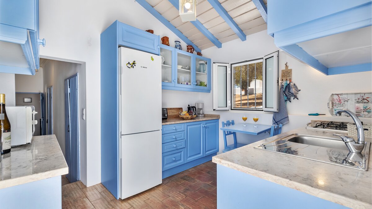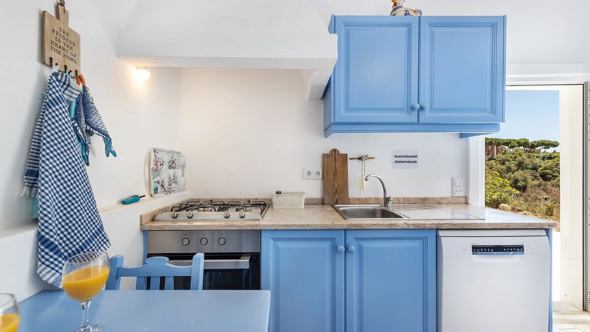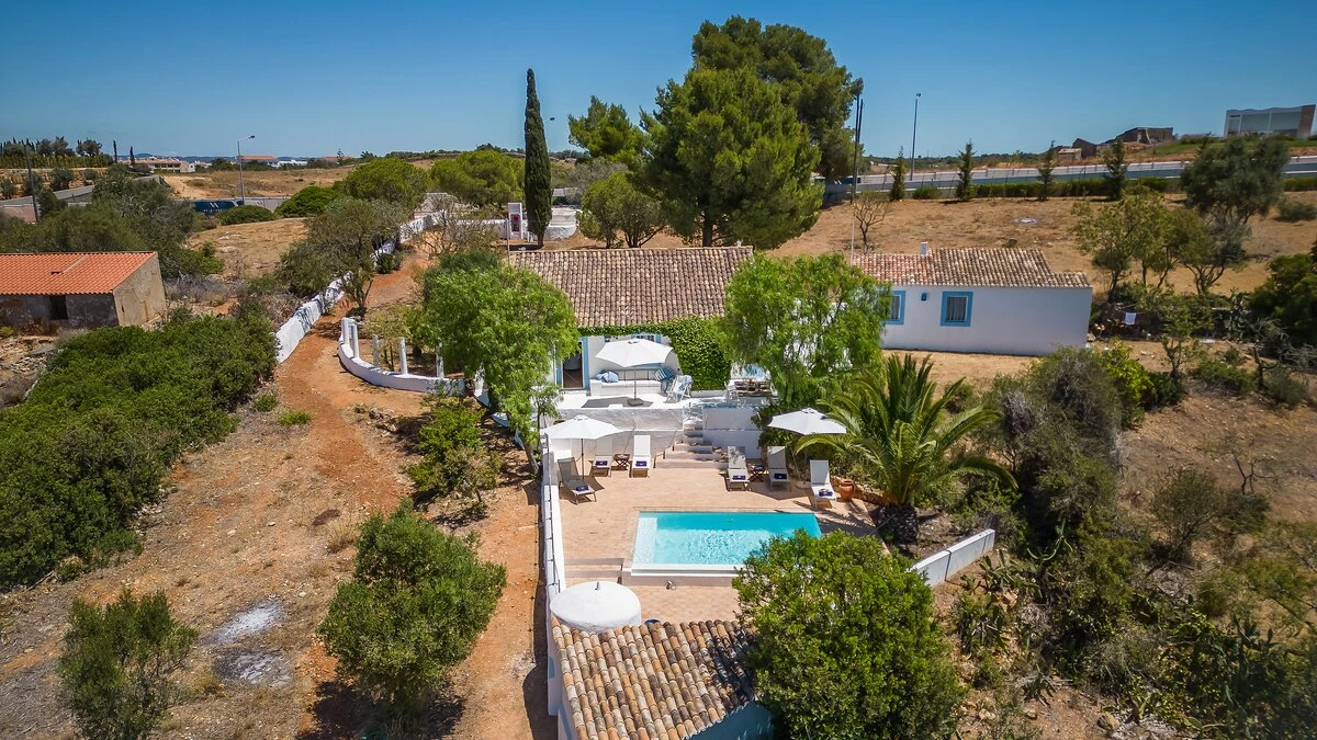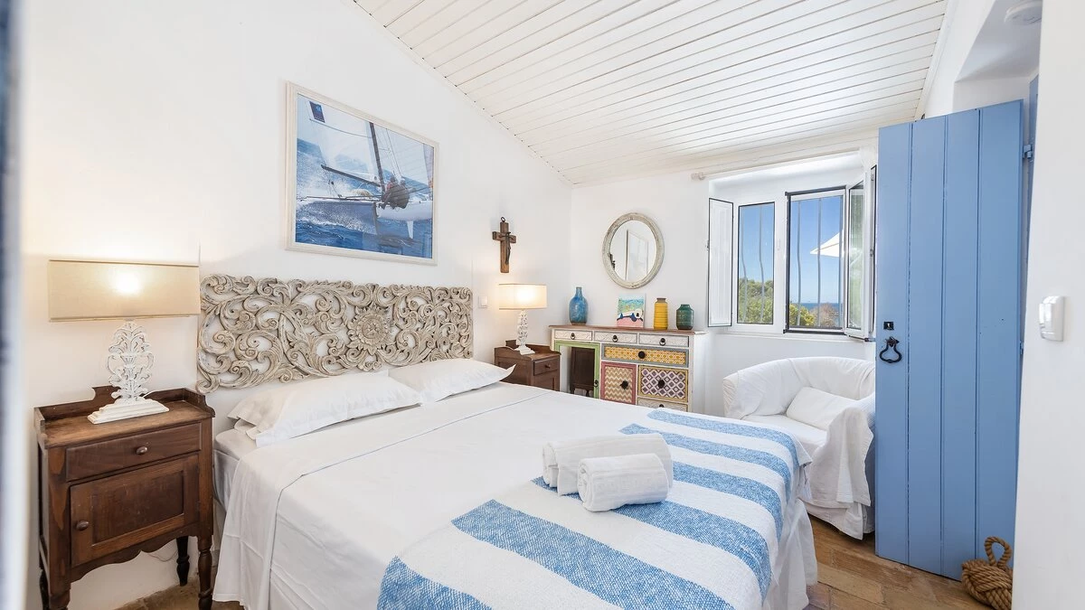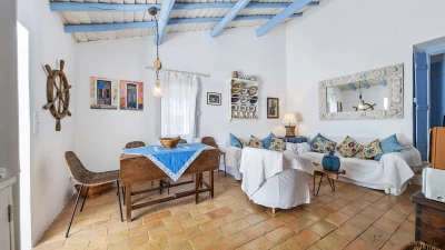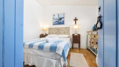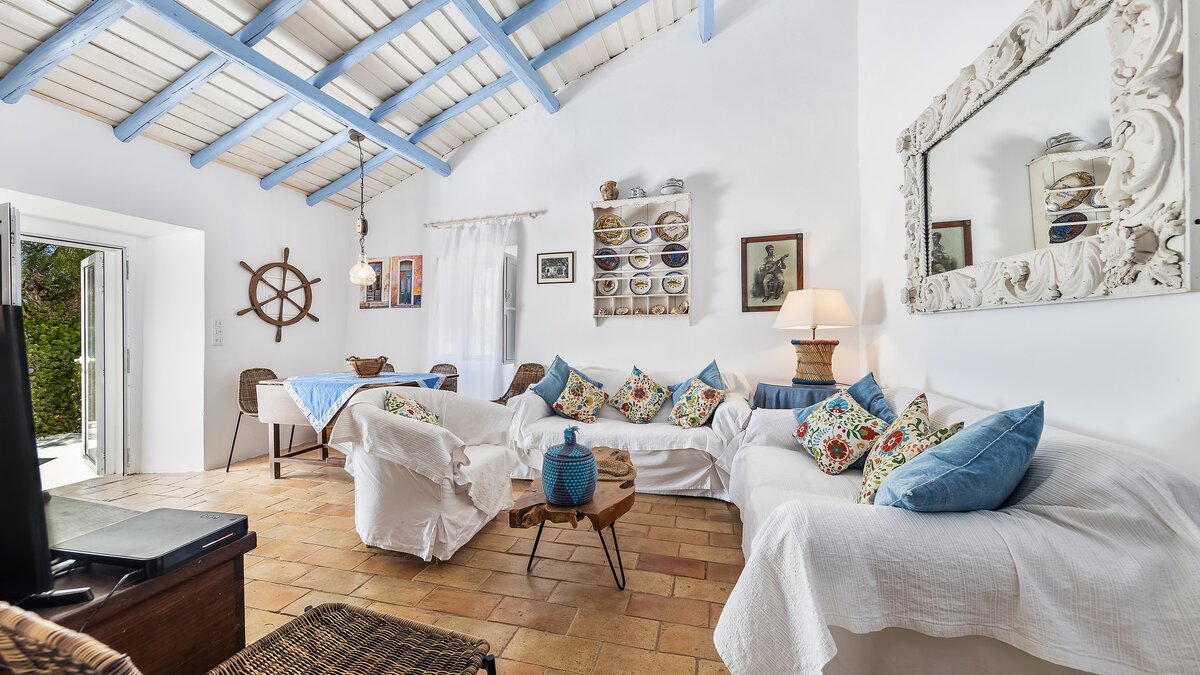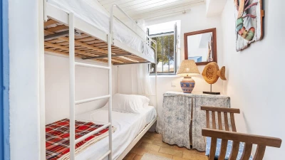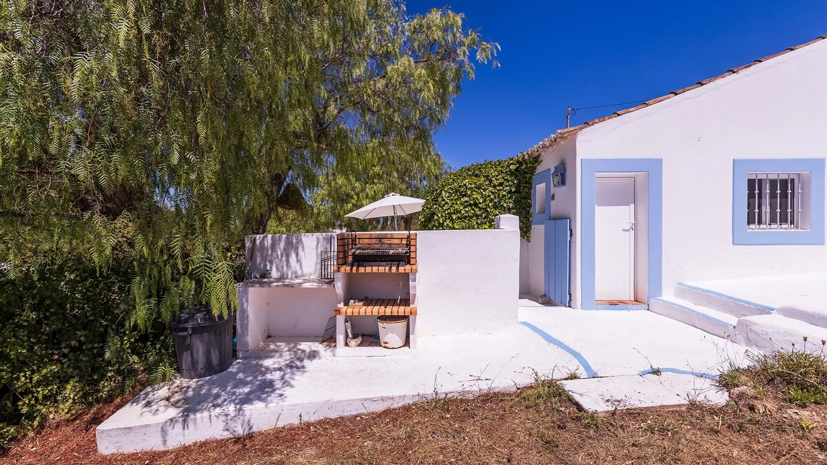 From its painted roof rafters to its cool tiled floors, there’s a real ‘beach house’ feel to this airy little villa. Furnished throughout with enchanting simplicity, in a crisp colour palette of blue and white, the single storey villa has two or three steps linking rooms in its split-level layout. Equally ideal for family or friends, the cottage has one double bedroom and two singles and a bunk bedroom; a country-style kitchen with modern appliances; and a lovely living room forming the heart of the house, with a dining area, comfy sofas and satellite TV. A door opens out from here to the sunny and spacious terrace, with enticing views of the Atlantic Ocean and Arade River mouth, deck chairs set sleepily under tree shade, and a big dining table for leisurely lunches or starlight suppers.