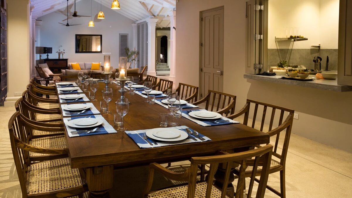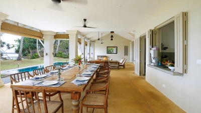 The main living and dining pavilion sits at the centre of the villa, open and welcoming, with clear views across the pool, lawn and ocean beyond. It’s an easy, sociable space where days naturally unfold. The long dining table brings everyone together for relaxed breakfasts, slow lunches and unhurried dinners, with the doors open wide to let the sea air drift through.
