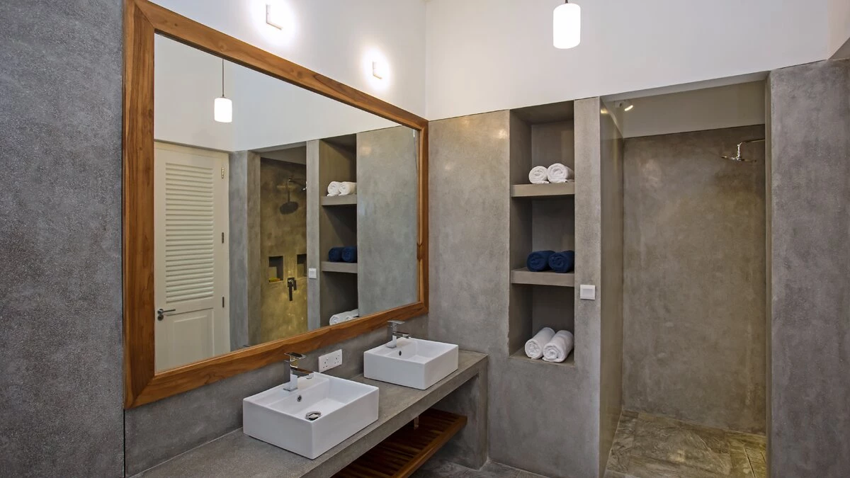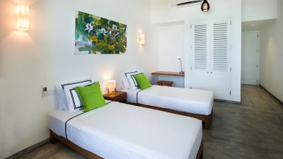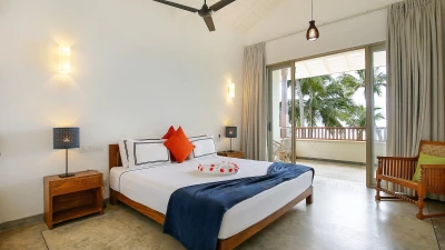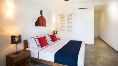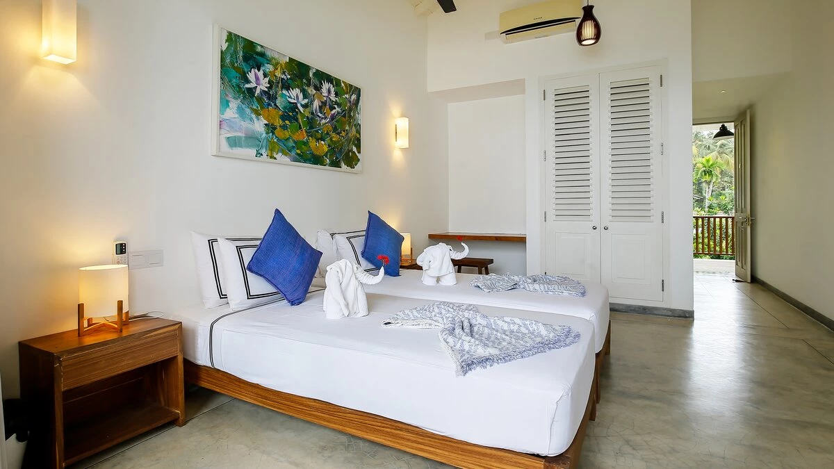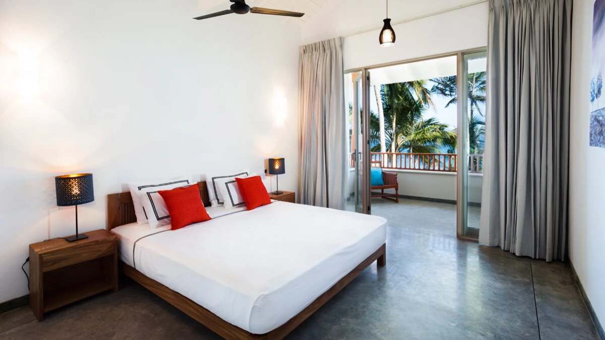 All six bedrooms are en suite and airy, dressed in crisp linens with touches of contemporary Sri Lankan art. Two ground‑floor rooms work well for guests who prefer fewer stairs, while four upstairs bedrooms open onto small balconies or terraces with wide ocean views, perfect for a quiet coffee in the morning or a drink as the sun goes down.