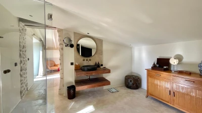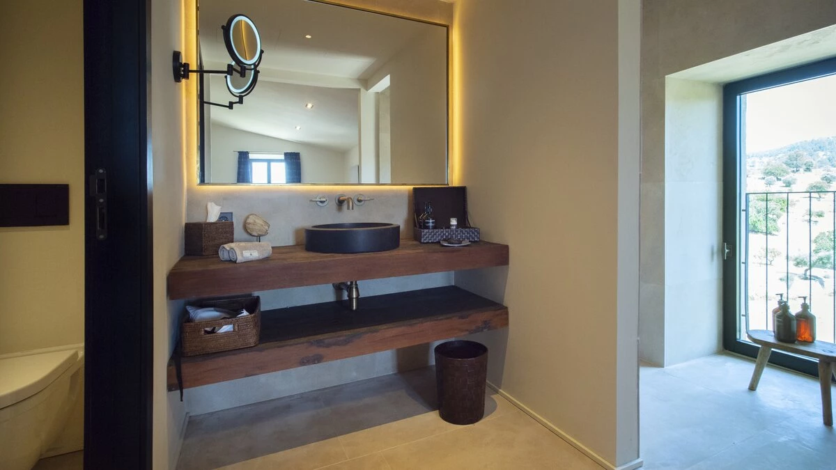 Outside, the villa’s large heated saltwater pool area offers breathtaking views of the surrounding mountains. Guests can unwind on sunbeds, or with a drink in hand at the pool bar. With multiple terraces, both shaded and open-air, there’s a range of spots for al fresco dining, with meals prepared by a private chef using local, organic produce sourced from the Alaró area. For the more active, there's a badminton court on the grounds. This exceptional property is not just a place to stay; it's a private sanctuary where every need is anticipated and met. With Palma and its attractions just a short drive away, alongside unmissable Mallorcan beaches, Spirit of Son Fuster offers the ideal balance of seclusion and serenity in Alaró, making it a perfect base to explore the beauty and charm of this part of Mallorca.