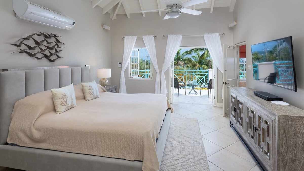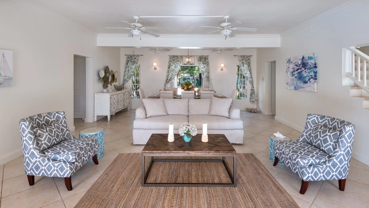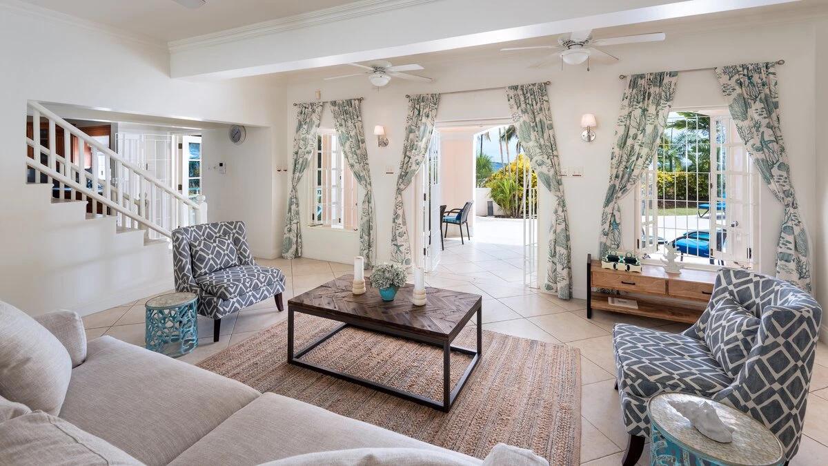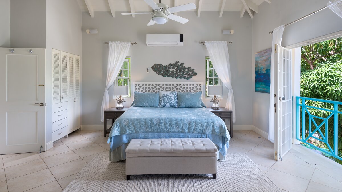 Sundown is a grand and comfortable property for groups of friends and families of up to ten. Ideally located, it’s slightly set back for peace and privacy with remarkable ocean views, while sandy Mullins beach is just a short walk away. Beautifully designed inside and out, Sundown offers guests comfort and indulgence in equal measure decorating in cool and calming shades of blue. Downstairs a fully-equipped kitchen is where the villa’s cook prepares three meals per day, for six days a week and includes a breakfast bar and a kitchen table. The large living and dining room has plenty of room for both relaxing and dining indoors with double doors opening to the terrace. Outside, a shaded terrace adjacent to the house is furnished with comfortable seating overlooking the private pool in the centre of the lawn. At the bottom of the garden there’s a hammock for afternoon snoozing and a dining pergola, both surrounded by tall swaying palms