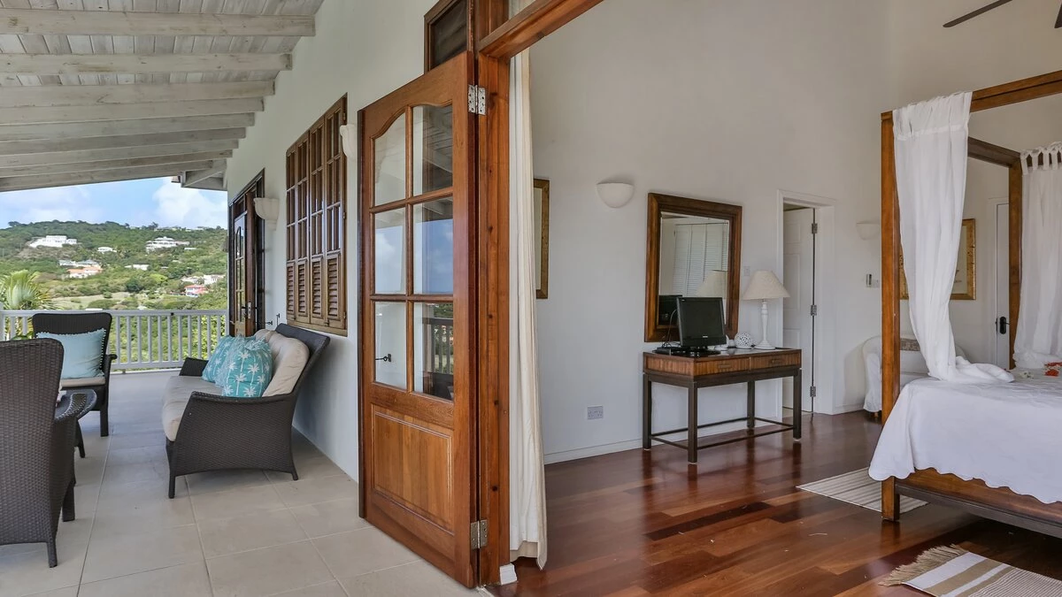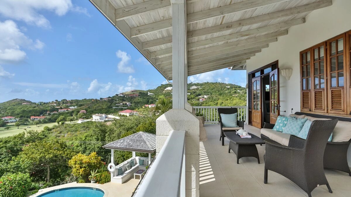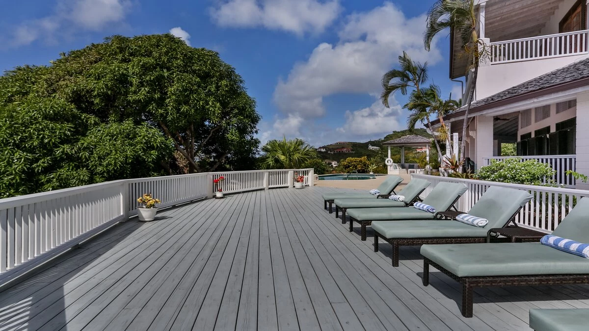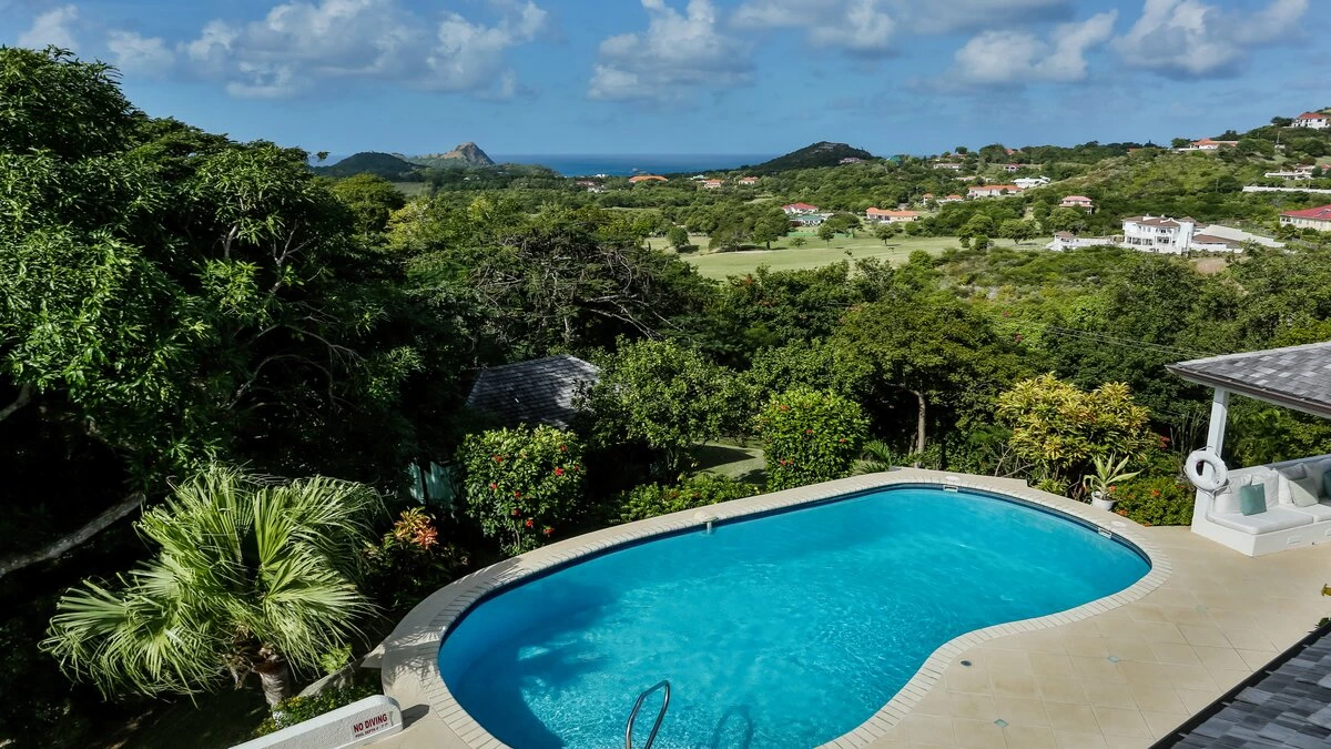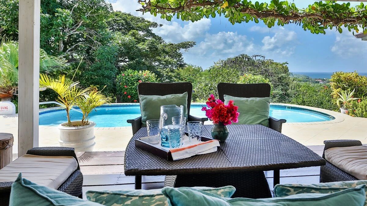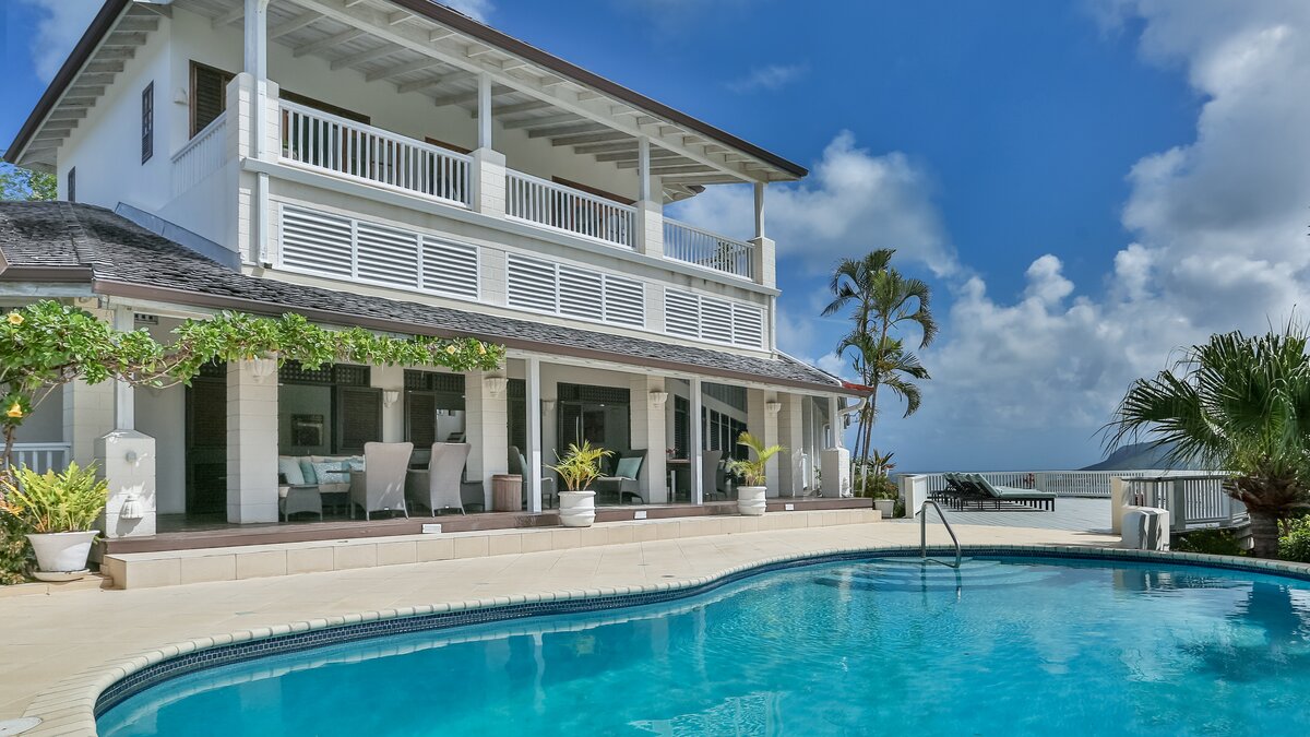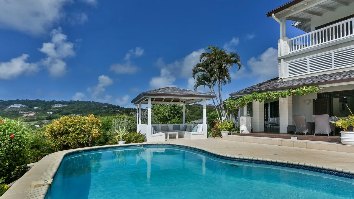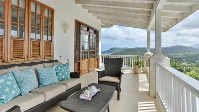 Very stylish, very spacious and beautifully furnished in black and white, Tamarind Villa boasts high standards of comfort, enhanced by inclusive cook service. An excellent choice for a big get-together of family or friends, it is privately positioned in large landscaped gardens on the Windward Hills, and exudes an atmosphere of pure relaxation. A chic living/dining room within the house is matched by a full length covered veranda, providing al fresco seating and dining areas and overlooking the free-form swimming pool. At one side of this is a sun-trap timber deck with loungers. At the other, a delightful little gazebo has built-in benches piled with plump cushions. The villa has a flexible mix of four double and three twin bedrooms, all with en suite bath or shower room, some opening on to a broad and breezy balcony. A small single bedroom, suitable for a child, is also available (at extra cost). Tamarind Villa is within easy reach of two sandy beaches and cosmopolitan Rodney Bay, a five minute drive from golf and tennis, and about twenty five minutes from the capital, Castries.
