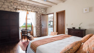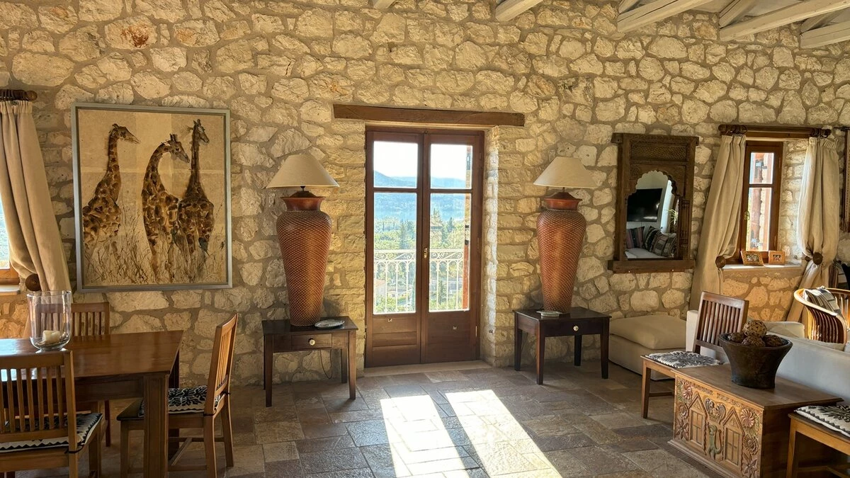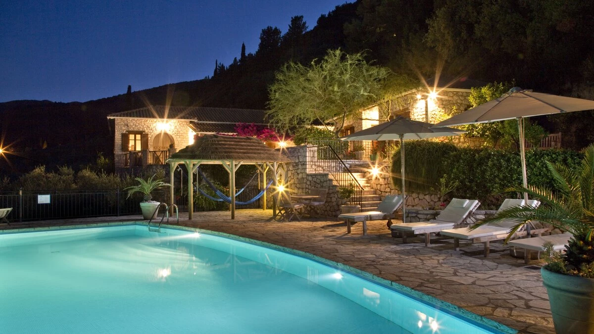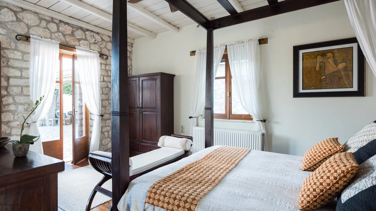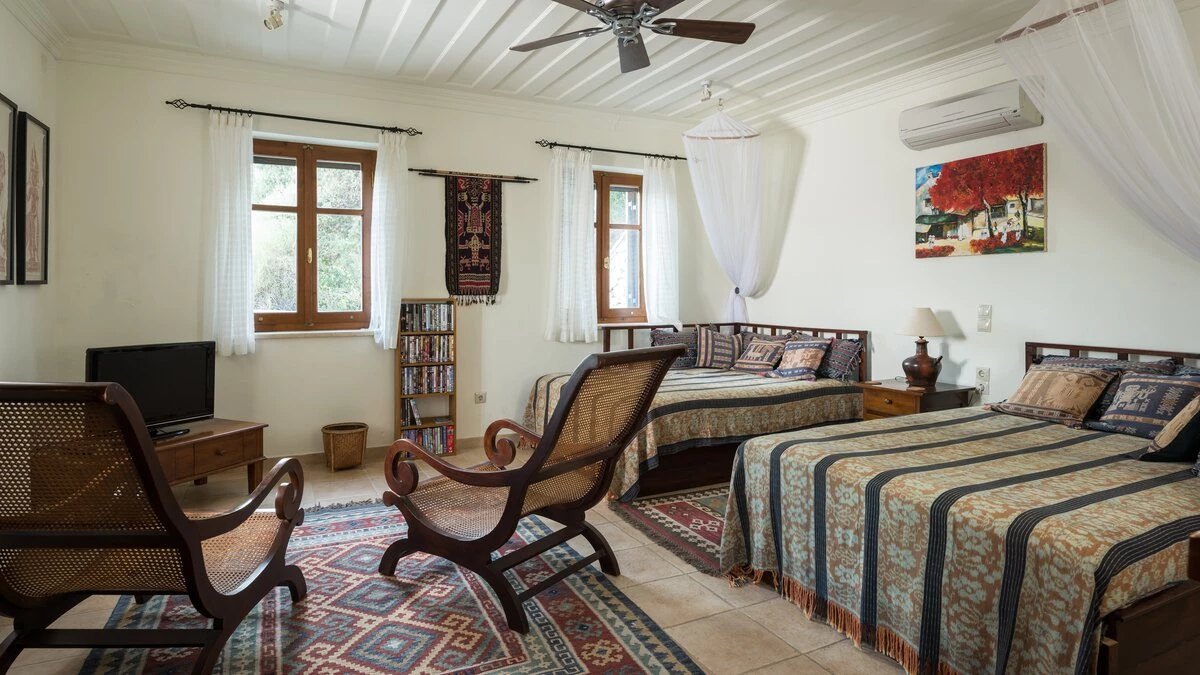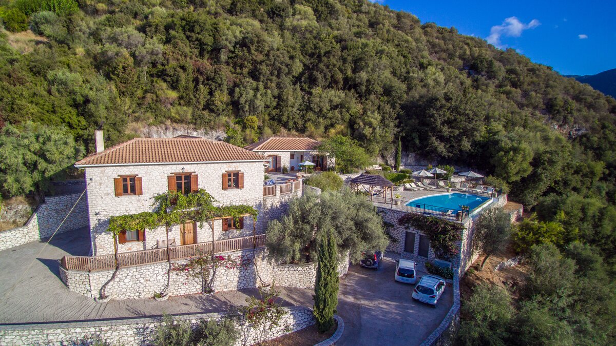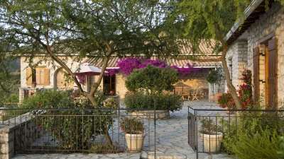 Ideal for two families or a group of friends, accommodation is divided between two separate stone villas. In the Main House, the lower ground floor has a big, informal room with a TV and two large beds, make it a good family room or teenagers’ bedroom. Three of To Petrino’s four en suite double bedrooms can be converted to twin bed use. The fourth, in the Guest House, has a romantically draped four-poster. The villa is 1.5km from busy little Nidri and a five minute walk from a local taverna, with a choice of beaches within 5km.