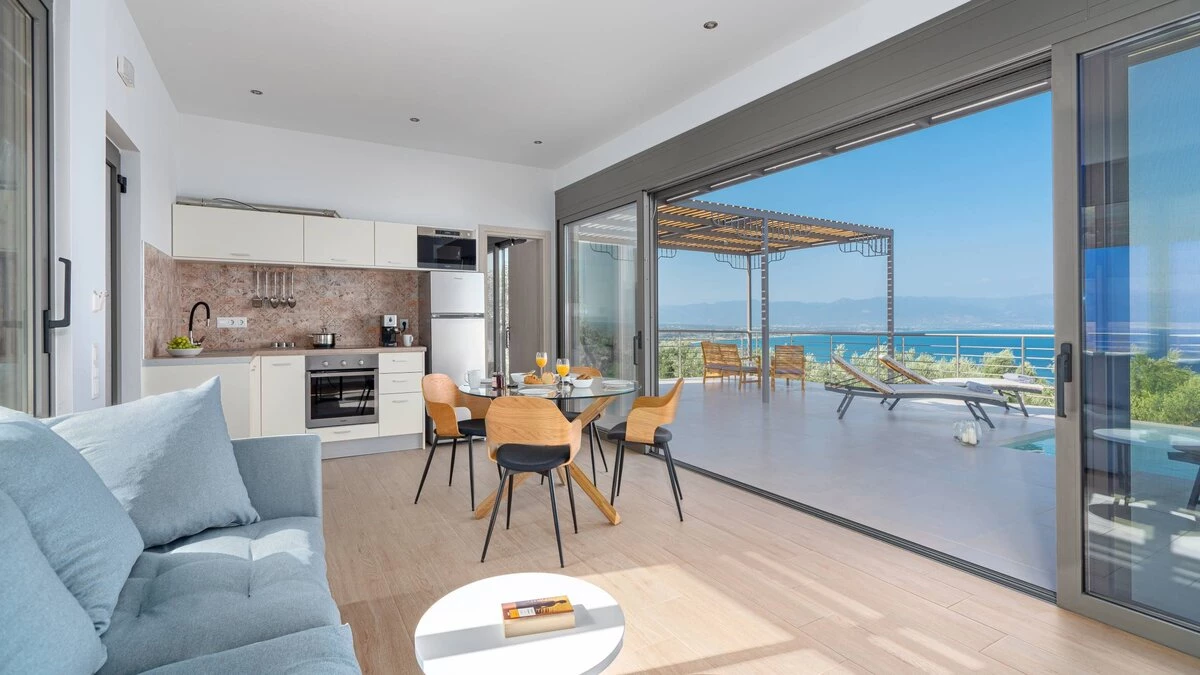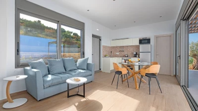 Situated just 2.3km from pretty Petalidi, these elegant Grecian villas are designed with a modern, blinding-white exterior. Head indoors to discover a bright, airy open plan area that includes both the living/dining and kitchen area. Decorated with serene blues and whites, the room leads out onto a stunning outdoor space through wide double doors. On the terrace, you’ll discover plenty of spots to lounge in the sun, as well as a stunning infinity pool overlooking a hazy silhouette of the hills and picturesque ocean view.