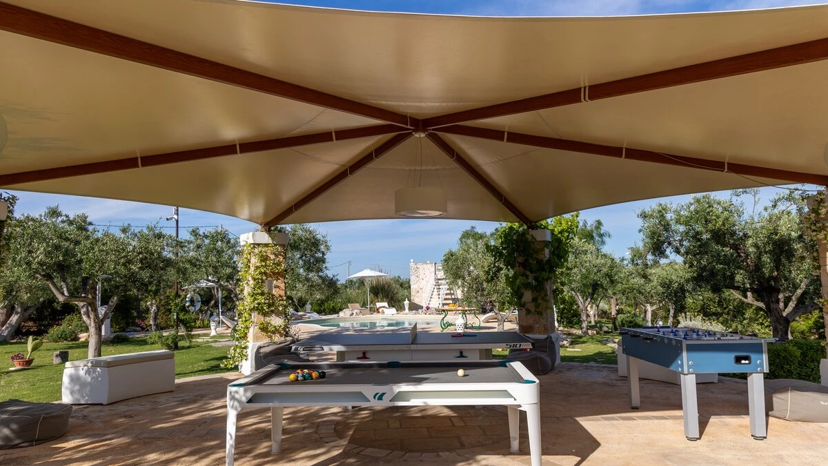 The villa is well-equipped for family stays, with cots, highchairs, and entertainment including table football and table tennis. Outdoors, the private pool with built-in steps is the focal point, framed by sun loungers and shaded terraces. A fully equipped pool kitchen and built-in barbecue make al fresco dining an absolute delight, while a firepit adds a magical touch to evenings under the Italian skies.
