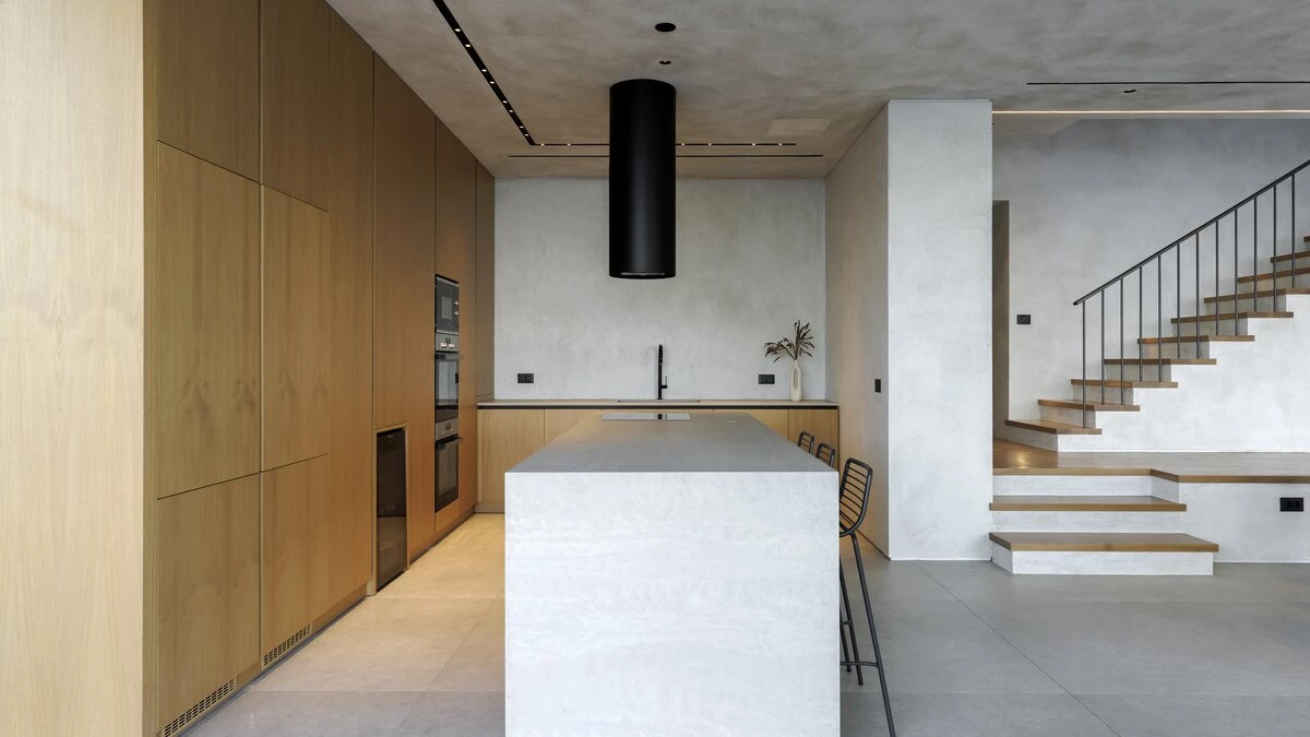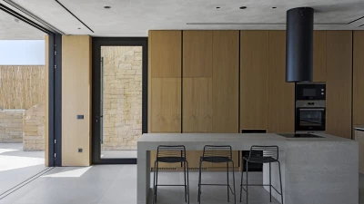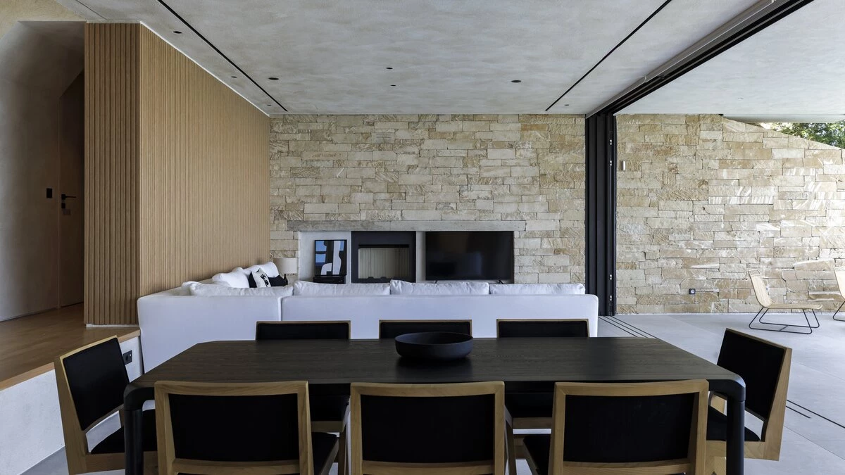 Inside, the villa’s main floor is a light-filled space with an open-plan living and dining area, framed by floor-to-ceiling windows that lead straight to the terrace and infinity pool. A fully equipped kitchen, complete with two ovens, two fridges, and a coffee machine, makes self-catering effortless, while a cloakroom adds convenience for guests belongings.