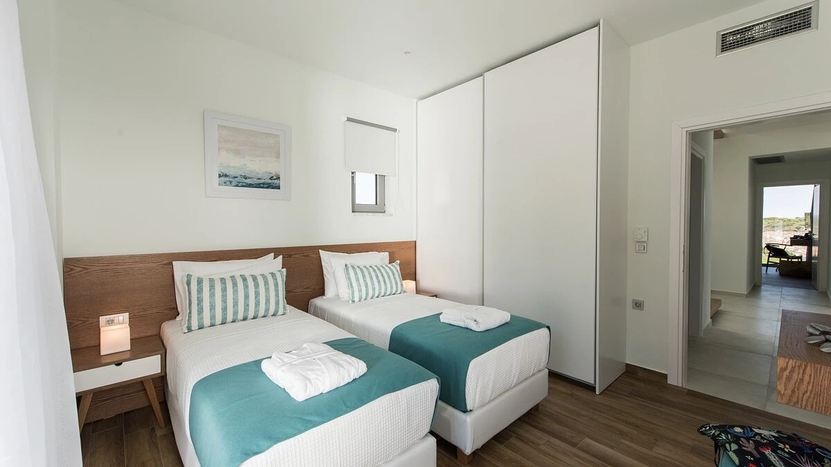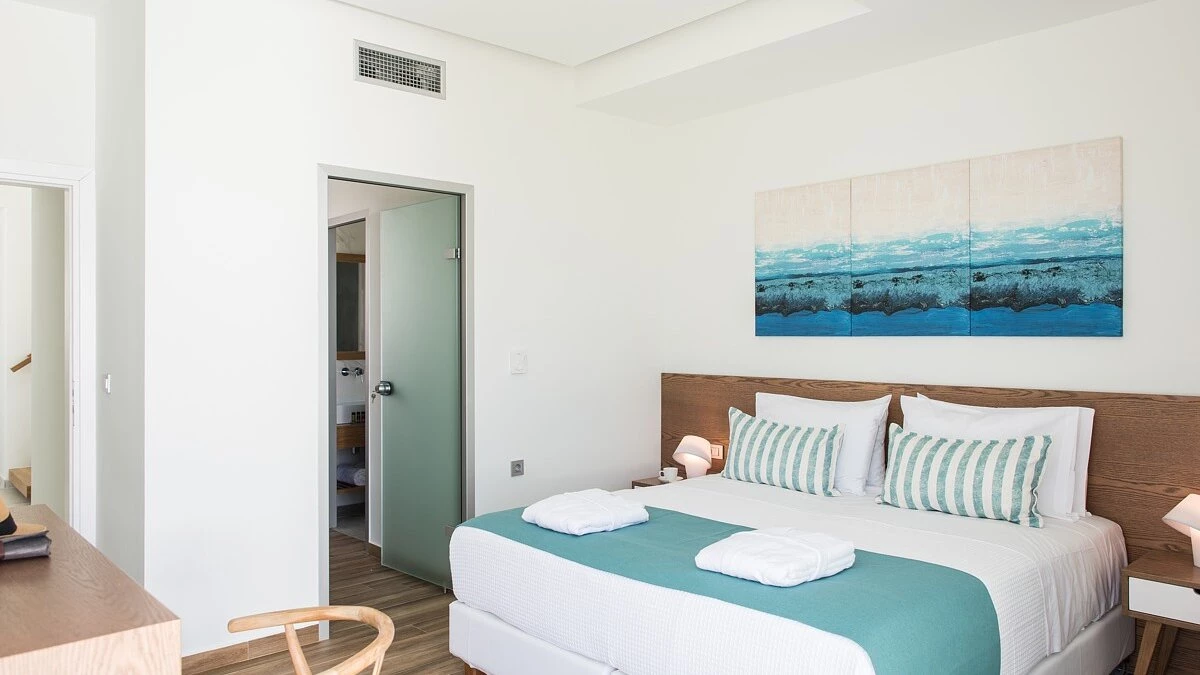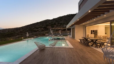 Set in a stunningly peaceful location in Chania, Villa Alayla is a bright and modern property designed for families. The interiors are modern and airy, including a beautifully furnished living/dining area and fully-equipped kitchen. Each of the four bedrooms are complete with a double bed and en suite, whilst two also offer a brilliant walk-in wardrobe. There is also a study area on the first floor, overlooking the rooms beneath. The villa features spacious outdoor living areas, including a large garden that is perfect for the little ones to play in. There is also a beautiful infinity pool, sun-soaked lounge area and shaded al fresco dining table.